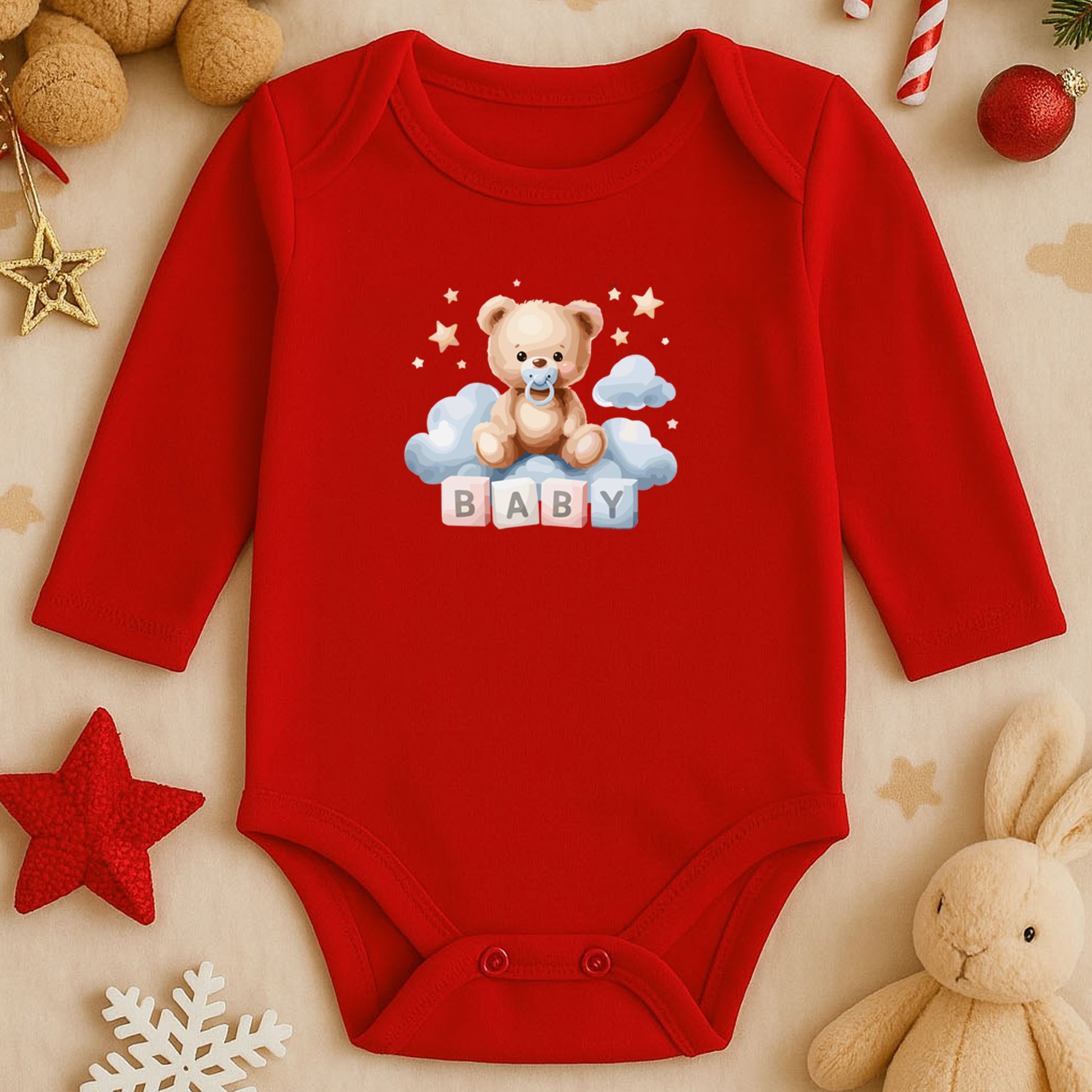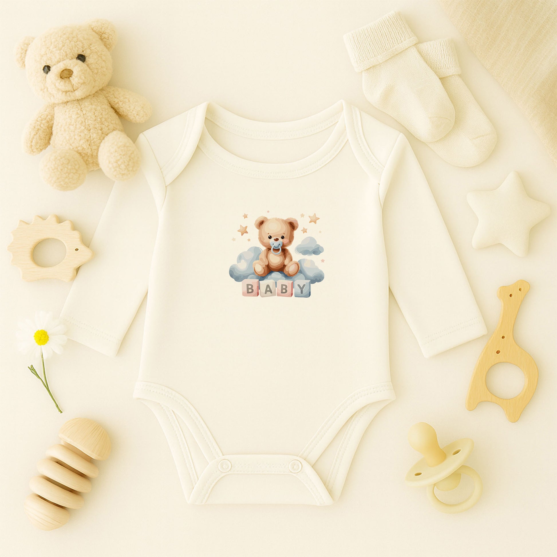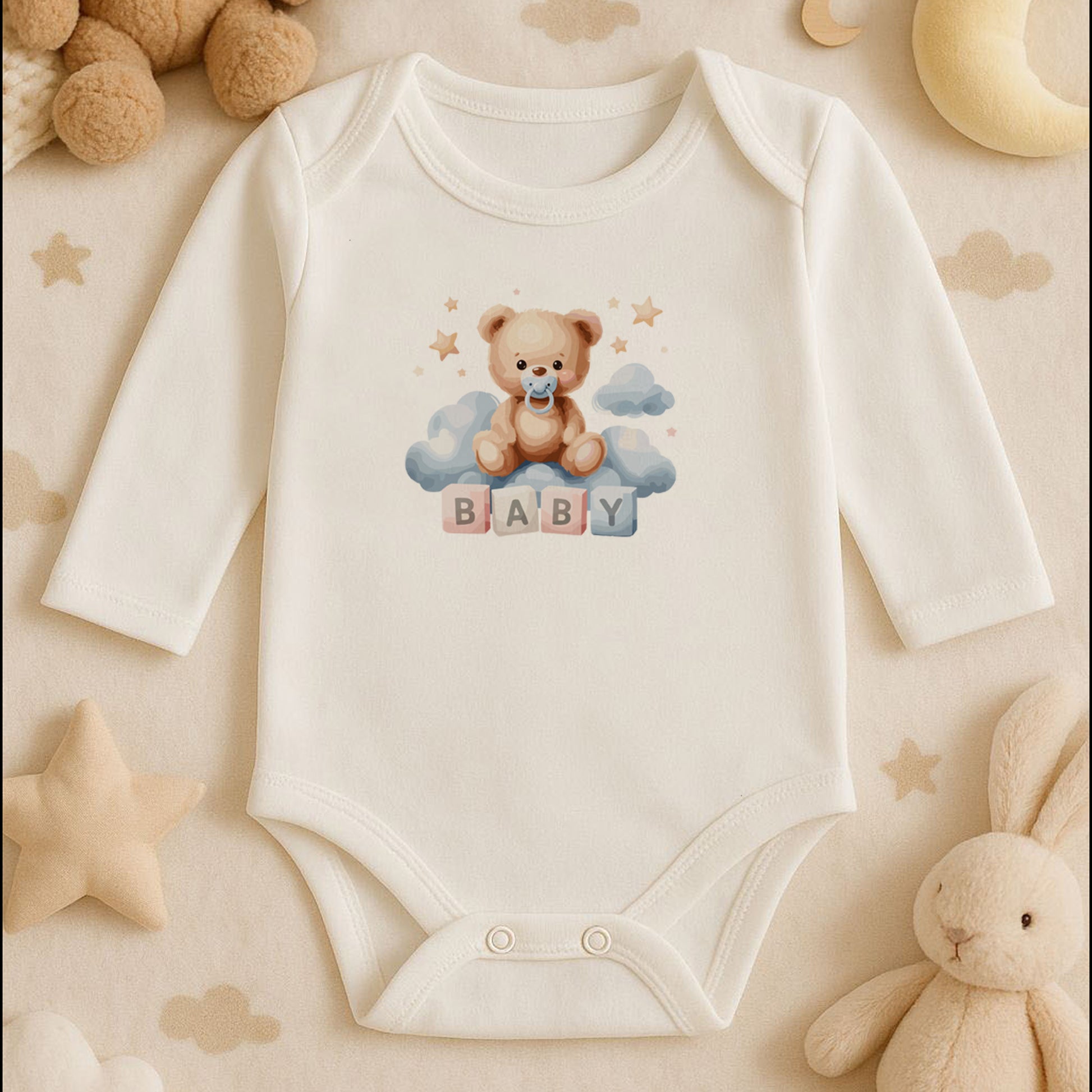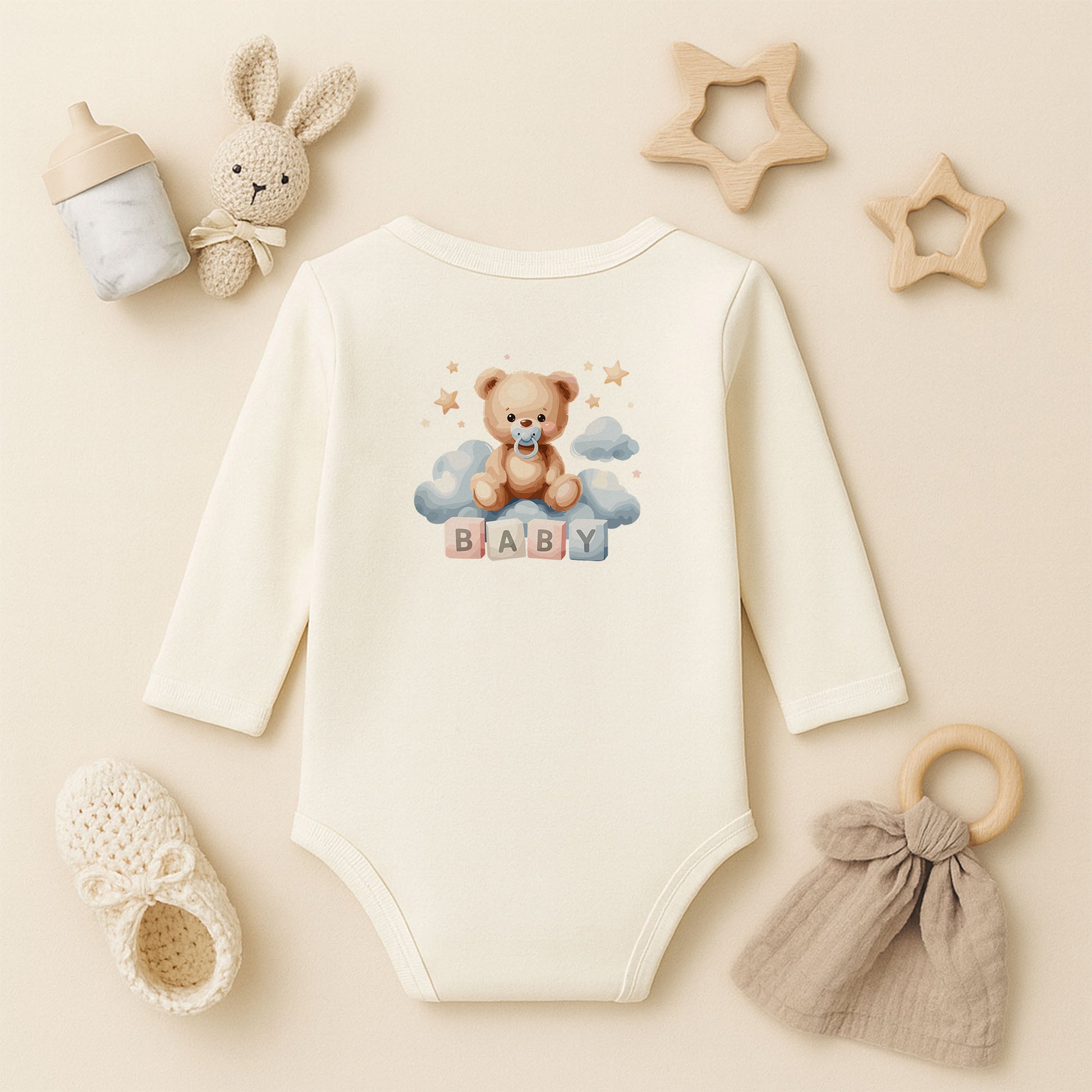 Bulutların üzerinde oturan sevimli ayıcık tasarımıyla hazırlanan bu kişiye özel bebek zıbını, 1–36 ay arası tüm minikler için ideal. Yumuşak, hassas ciltlere uygun kumaşı ve canlı DTF baskısı ile hem şık hem de konforlu. İsme özel hazırlanabilir, en tatlı hediye seçeneklerinden biri!