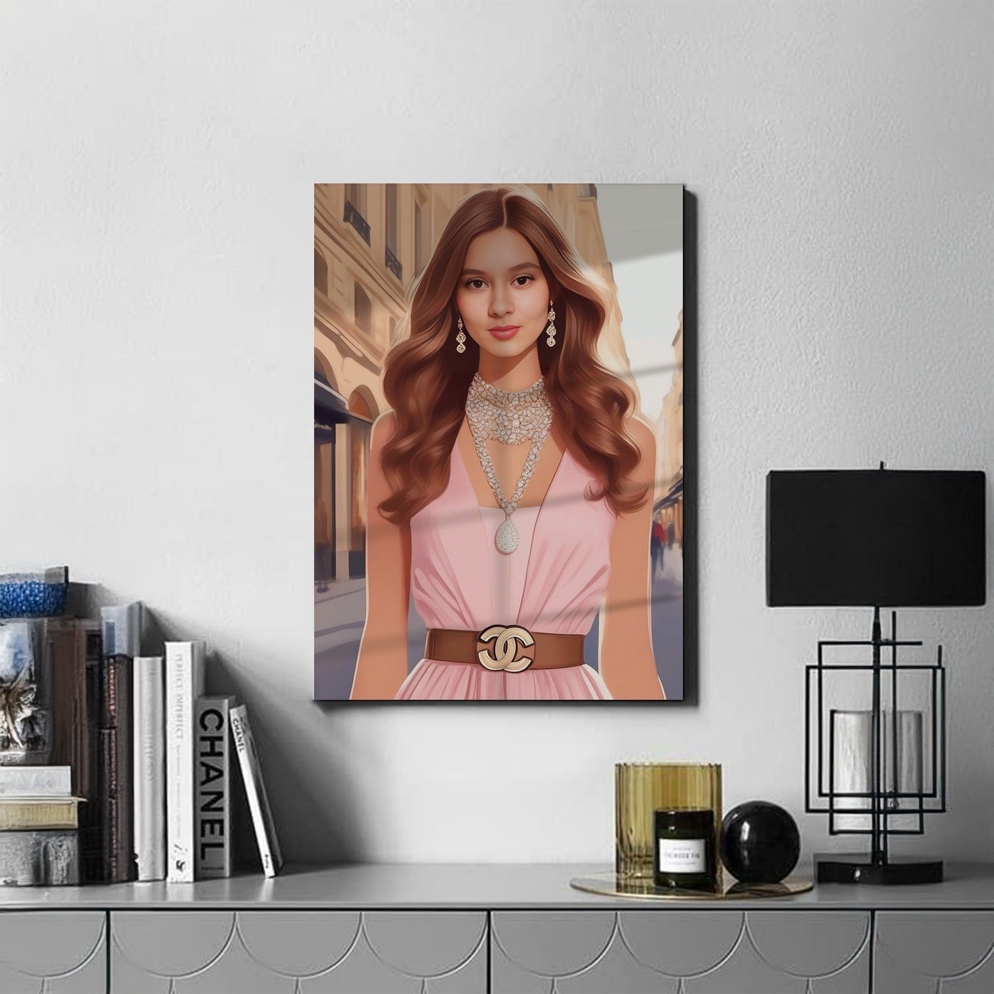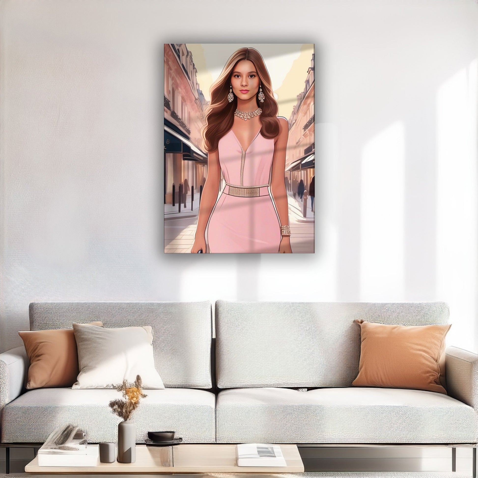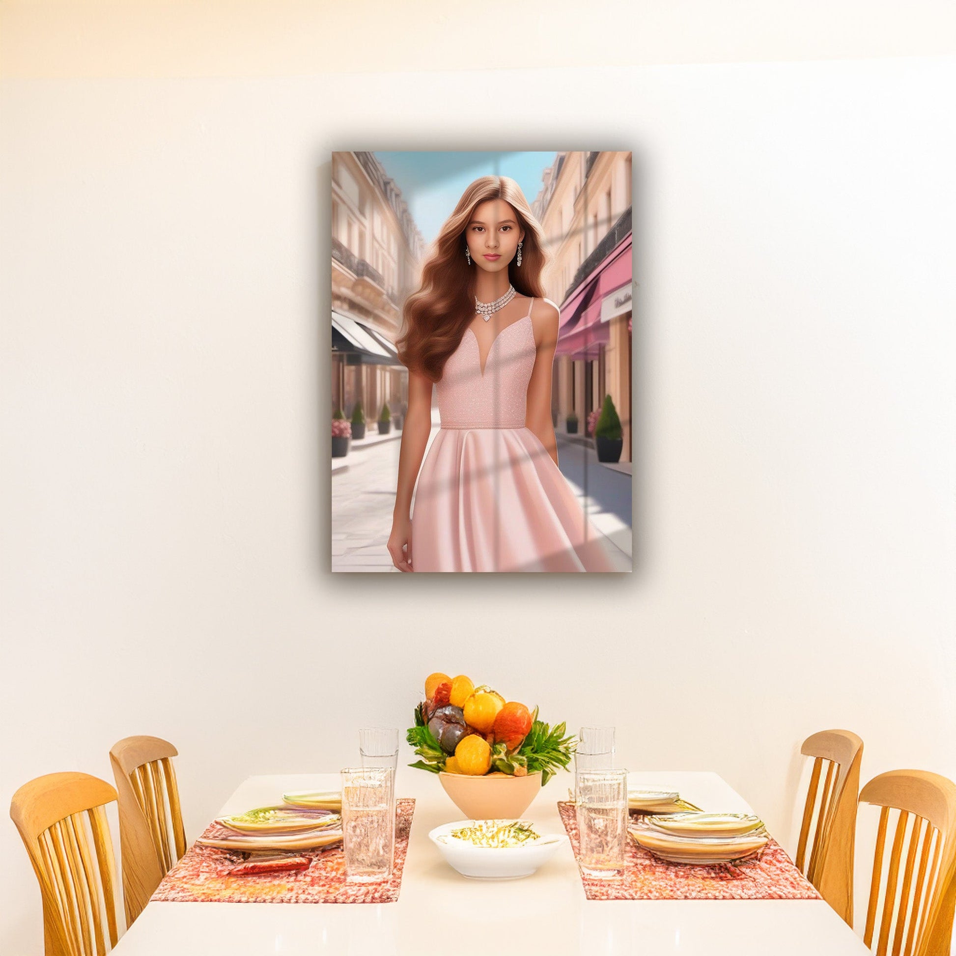 Kişiye Özel Pembe Elbiseli Kız Temalı Karikatür Cam Tablo | Zarif ve Şık Dekorasyon