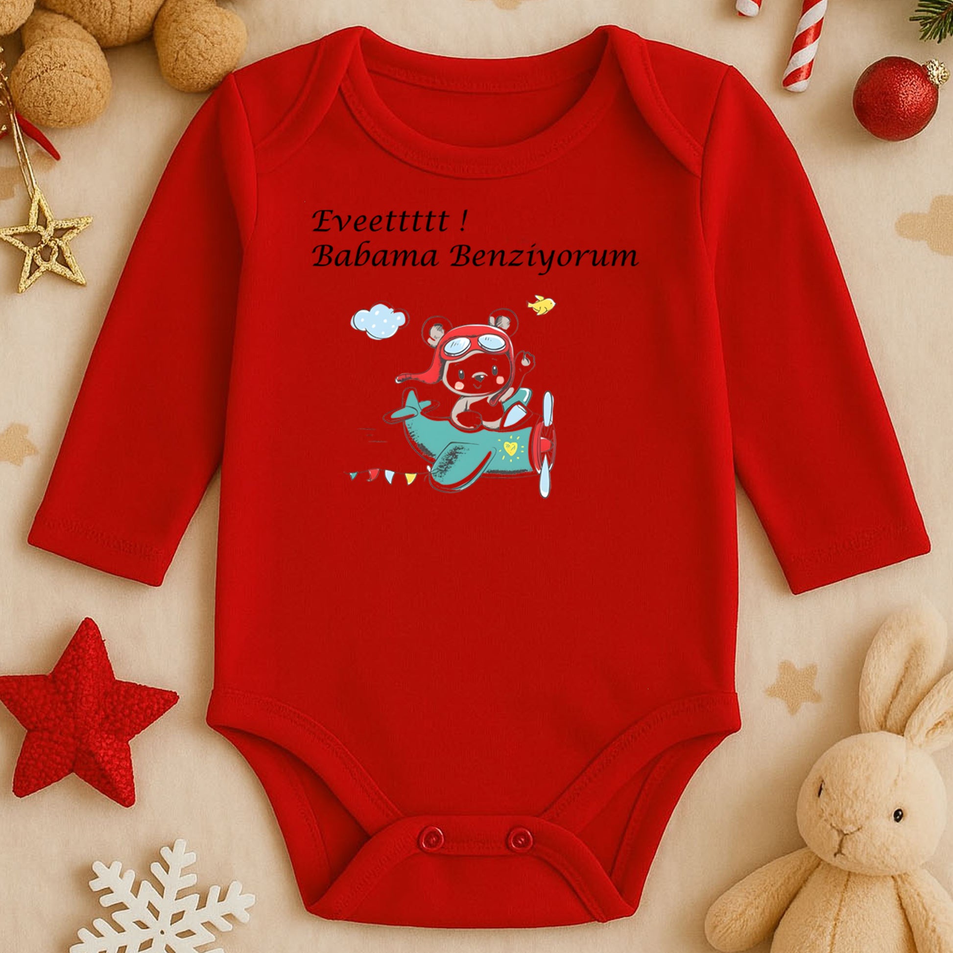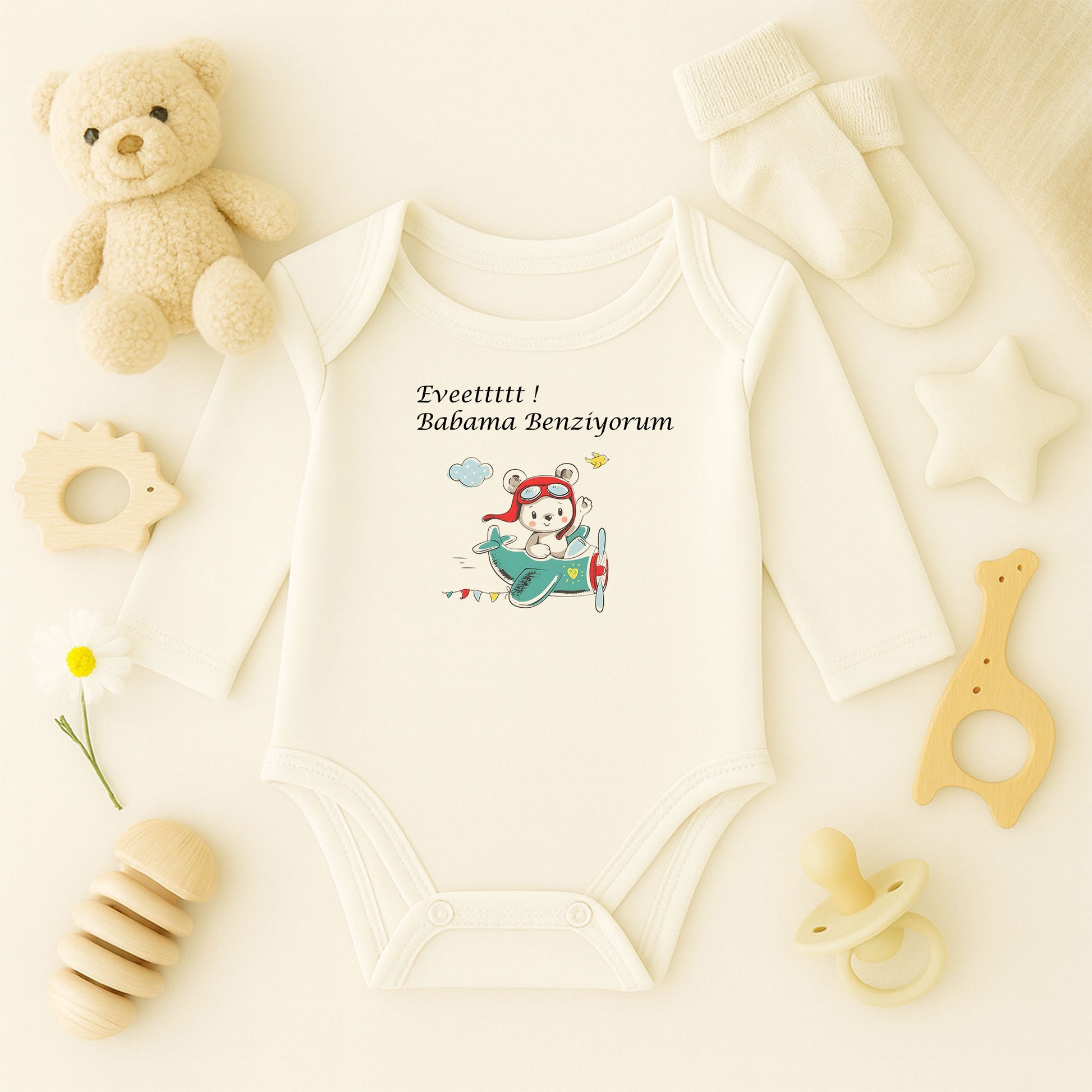 Bu kişiye özel bebek zıbını, sevimli pilot ayıcık illüstrasyonuyla hem günlük kullanımda hem de özel günlerde harika bir hediye alternatifi sunar.