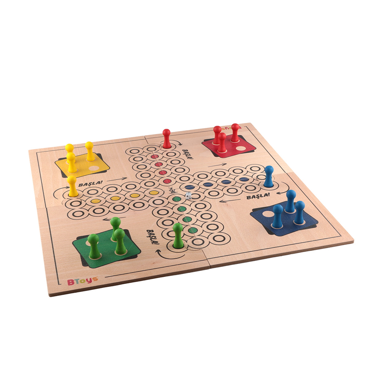 - 16 adet renkli oyun piyonları (4 renk ahşap, her renkten 4 adet)