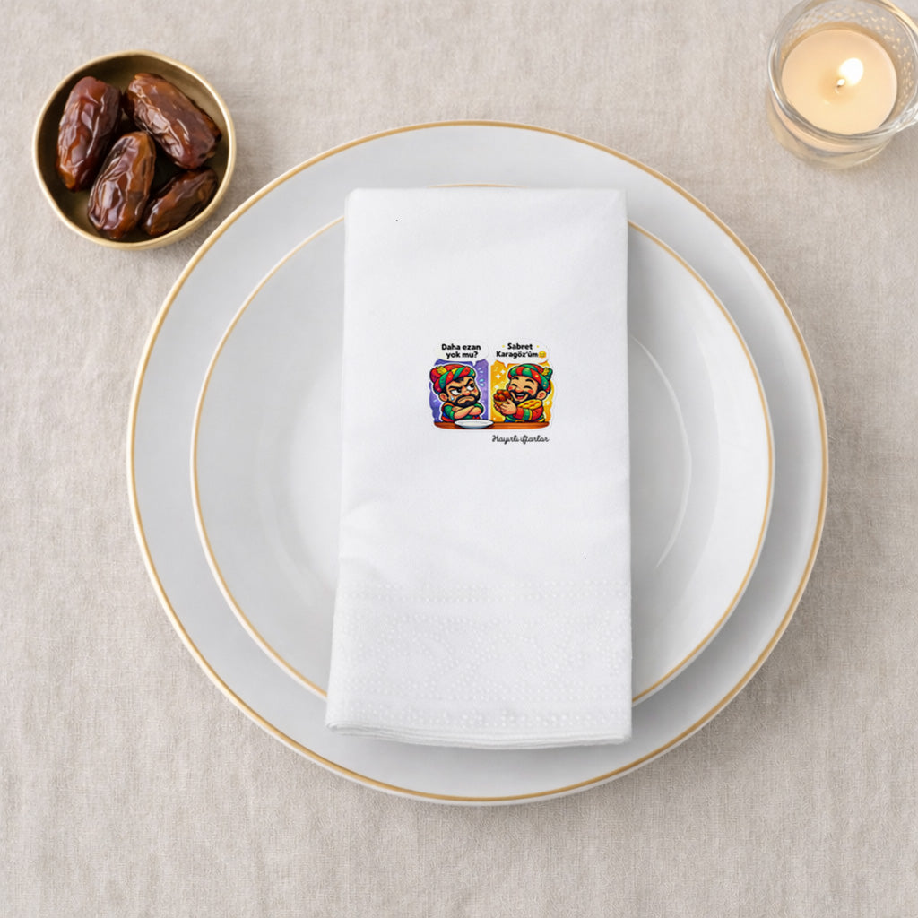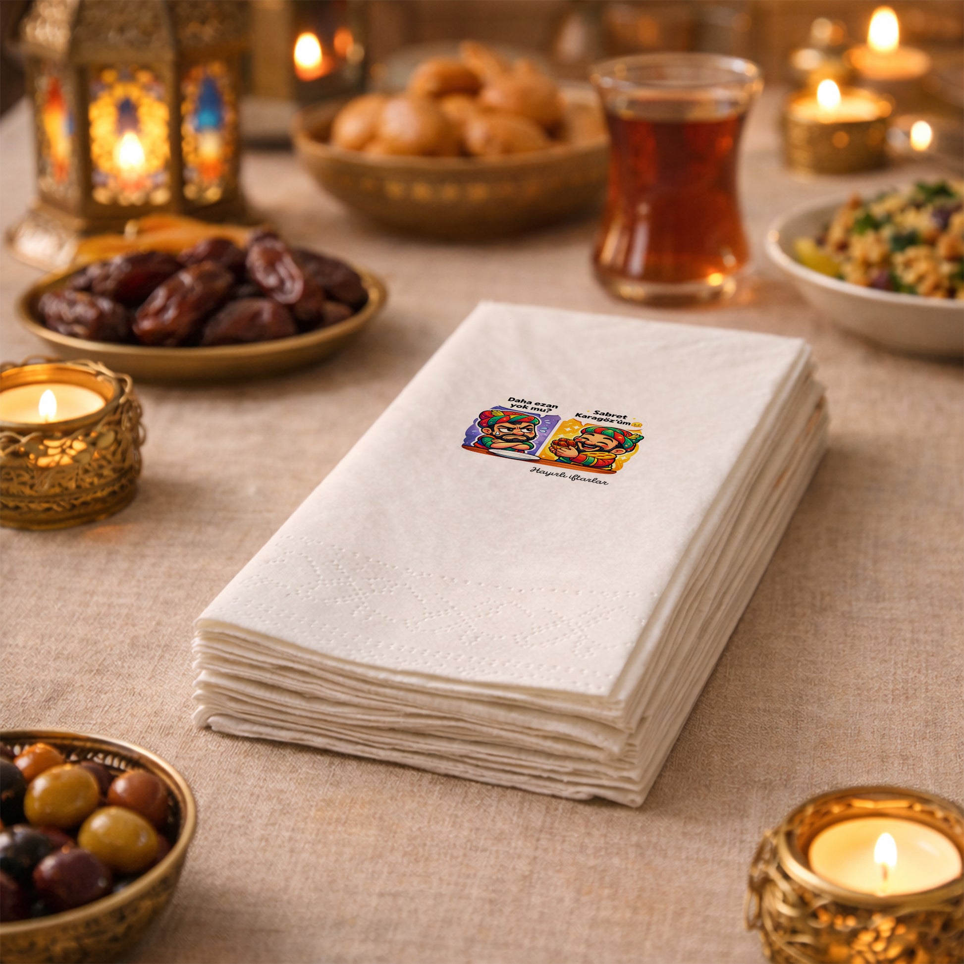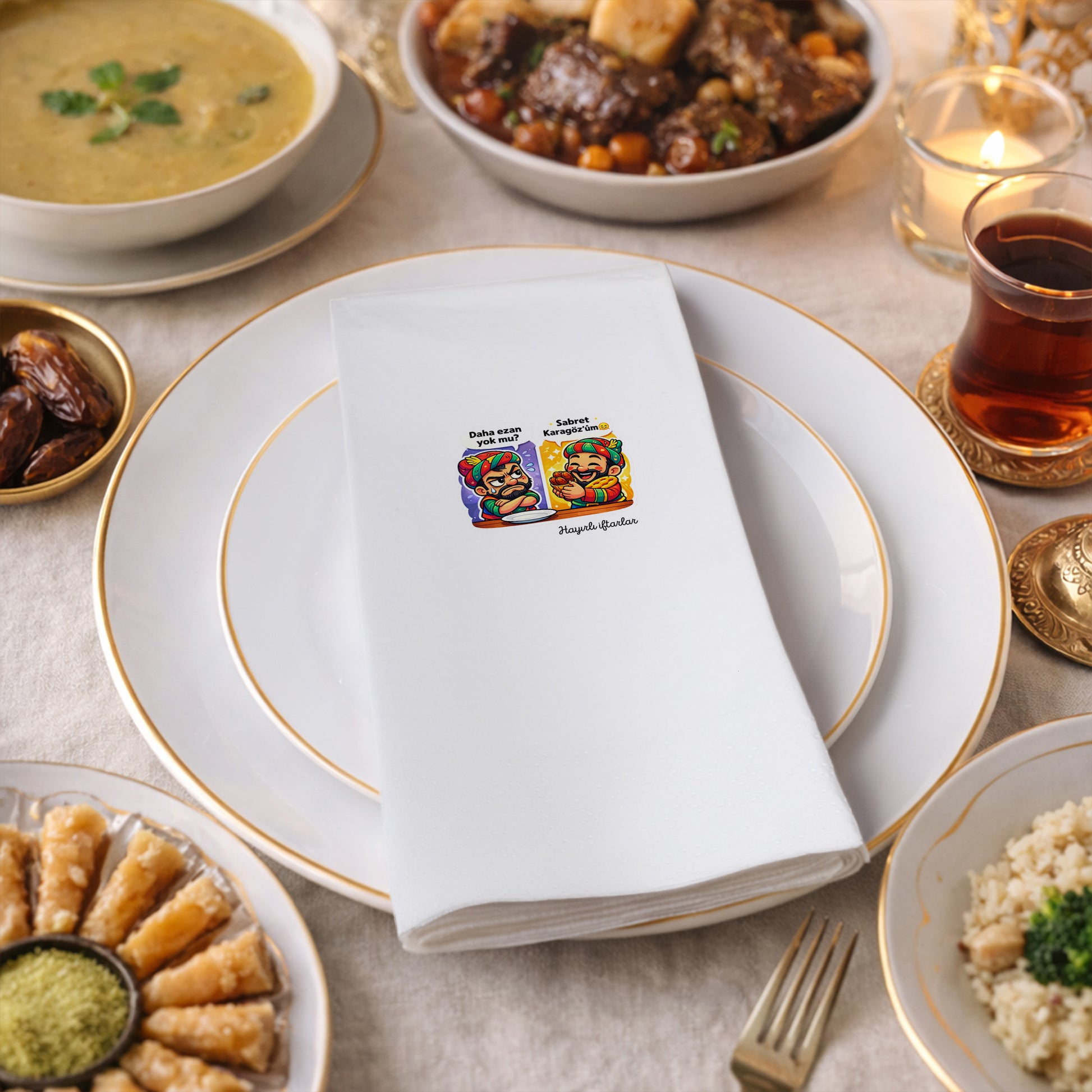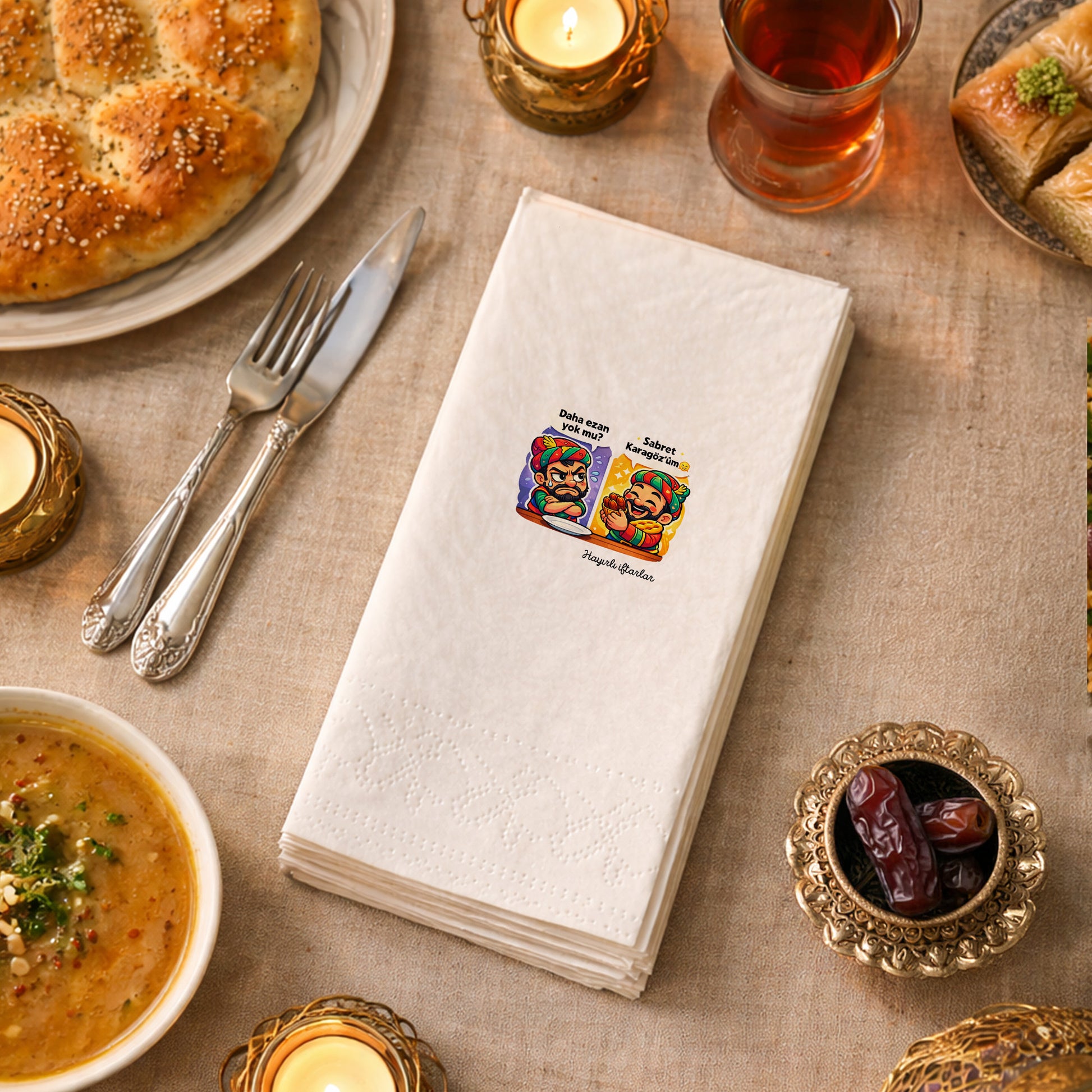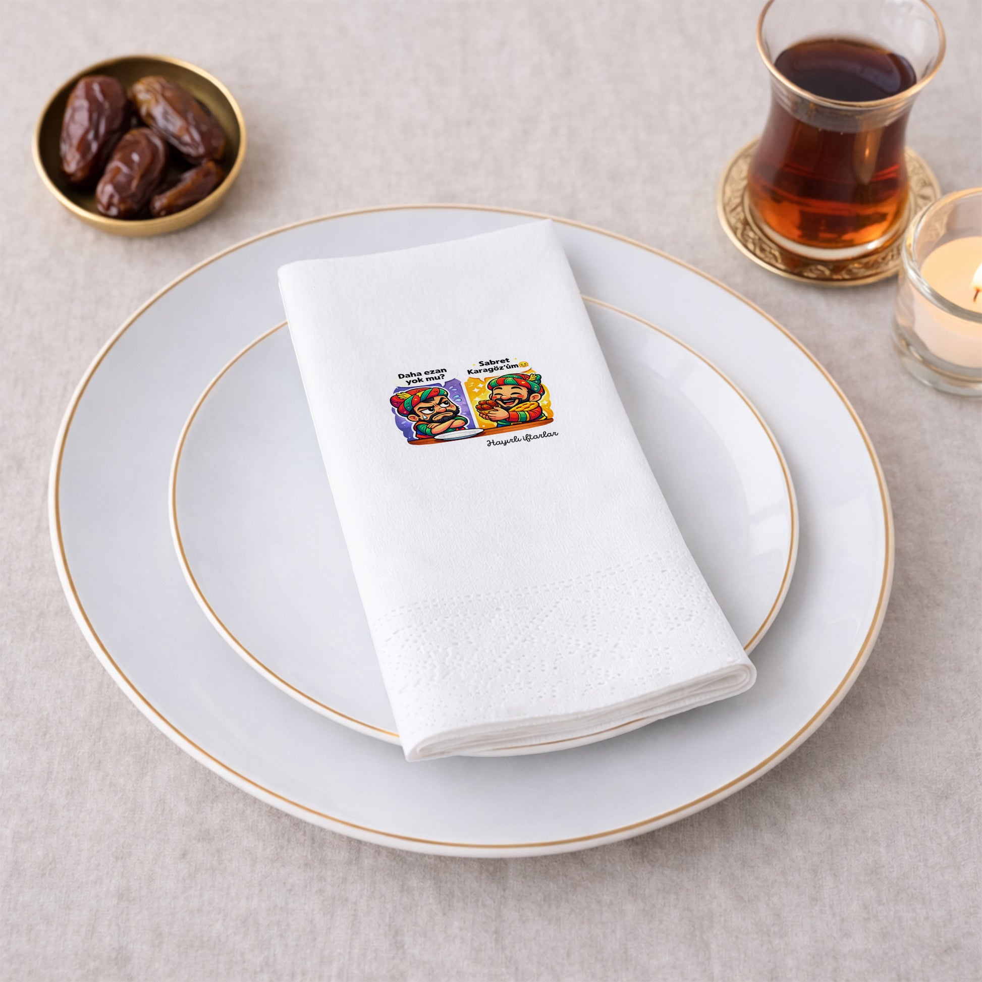 Karagöz ve Hacivat tarzı renkli karakter illüstrasyonları ve esprili diyaloglarıyla tasarlanan bu Komik Ramazan Desenli Baskılı Peçete, iftar sofralarına neşe ve samimiyet katar.