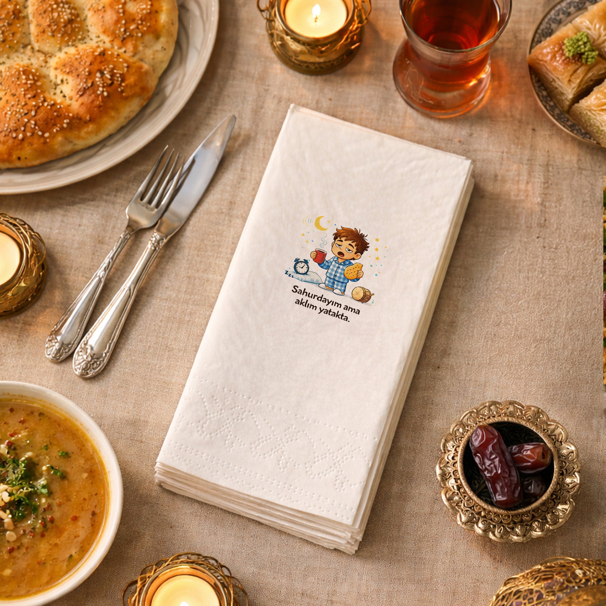 Sahurdayım ama aklım yatakta” yazısı ve sevimli çocuk illüstrasyonu ile tasarlanan bu Ramazan Desenli Baskılı Peçete, sahur sofralarına mizah ve sıcaklık katar.