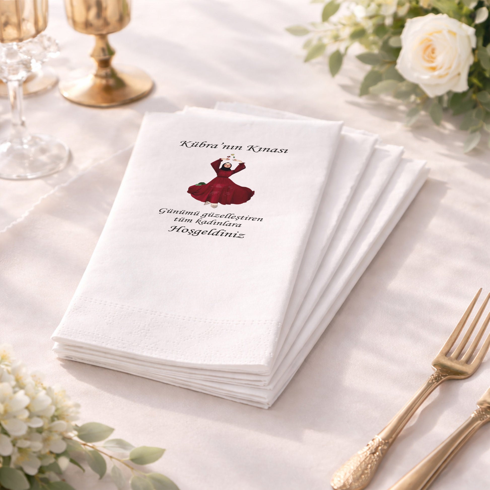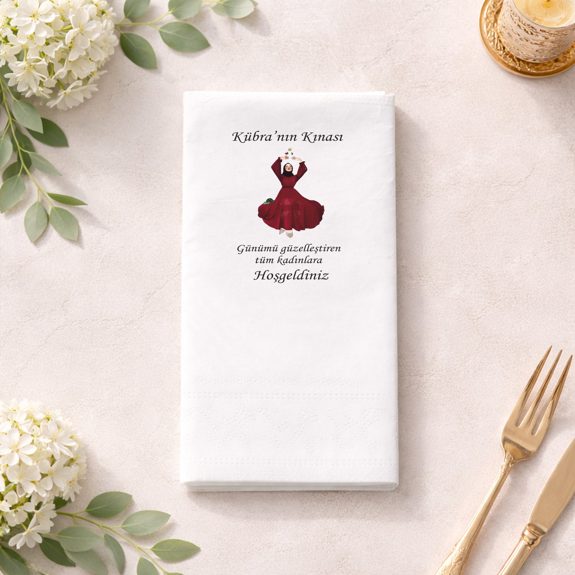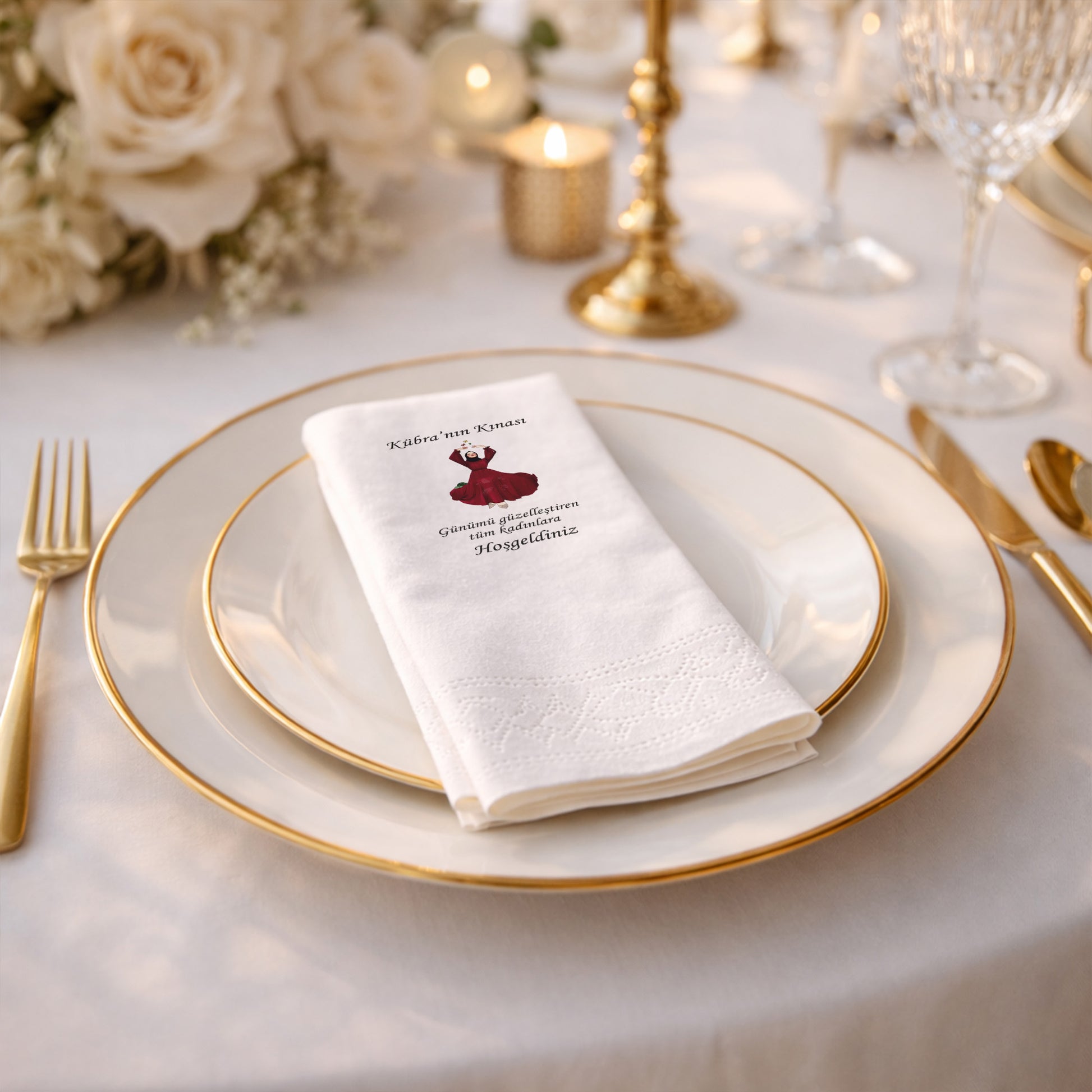 Kübra’nın Kınası için tasarlanan bu model, etrafında kelebekler uçuşan kırmızı elbiseli gelin figürüyle neşe ve enerjiyi masalara taşıyor. "Günümü güzelleştiren tüm kadınlara Hoşgeldiniz" mesajıyla duygusal ve anlamlı bir karşılama sunan bu organizasyon peçetesi, kadınlar arasındaki bağı güçlendiren bir detaydır. Minimalist ve modern çizgileriyle dikkat çeken baskılı peçete, kına gecesinin coşkusunu yansıtır. Yumuşak dokusu ve kaliteli kağıt yapısı, misafirlerinizin konforunu sağlarken; özgün tasarımı görselliği artırır. Düğün ve kına hazırlıklarında samimi bir dokunuş arayan gelinler için idealdir. Her bir detayı özenle düşünülmüş bu özel gün peçetesi, davetinize katılan herkesin kendisini özel hissetmesini sağlar. Mutluluğunuzu paylaşan sevdikleriniz için harika bir sunum detayı.