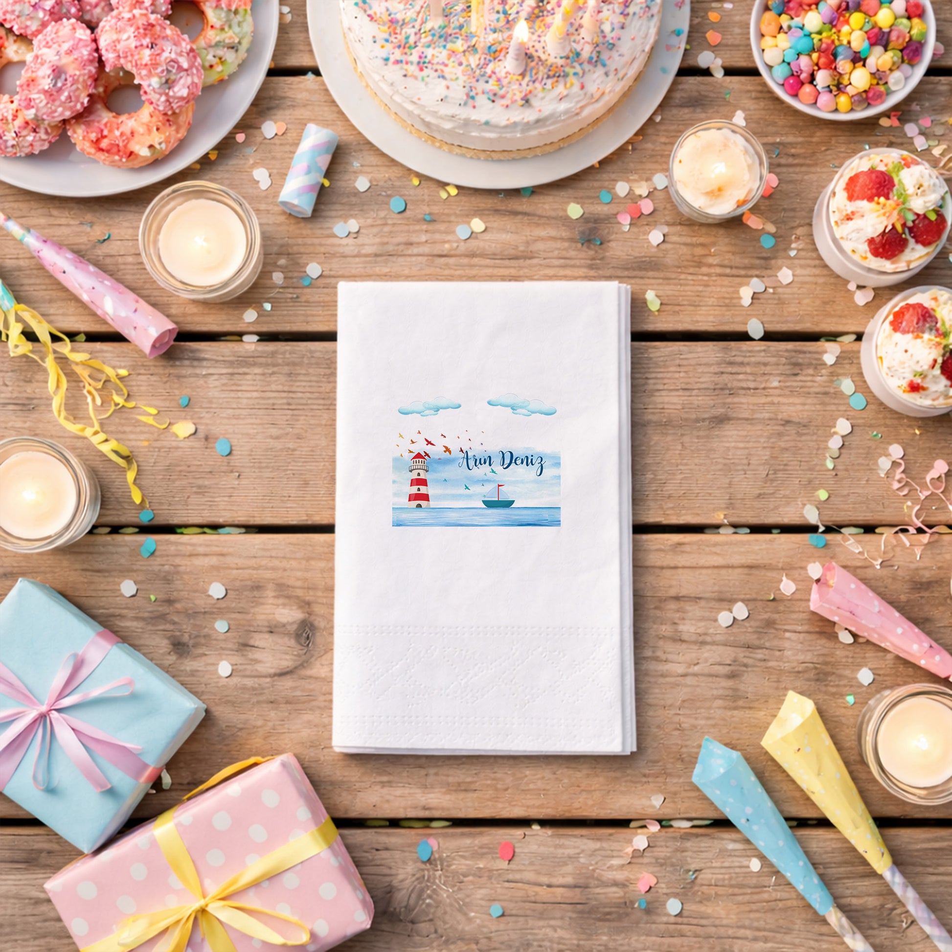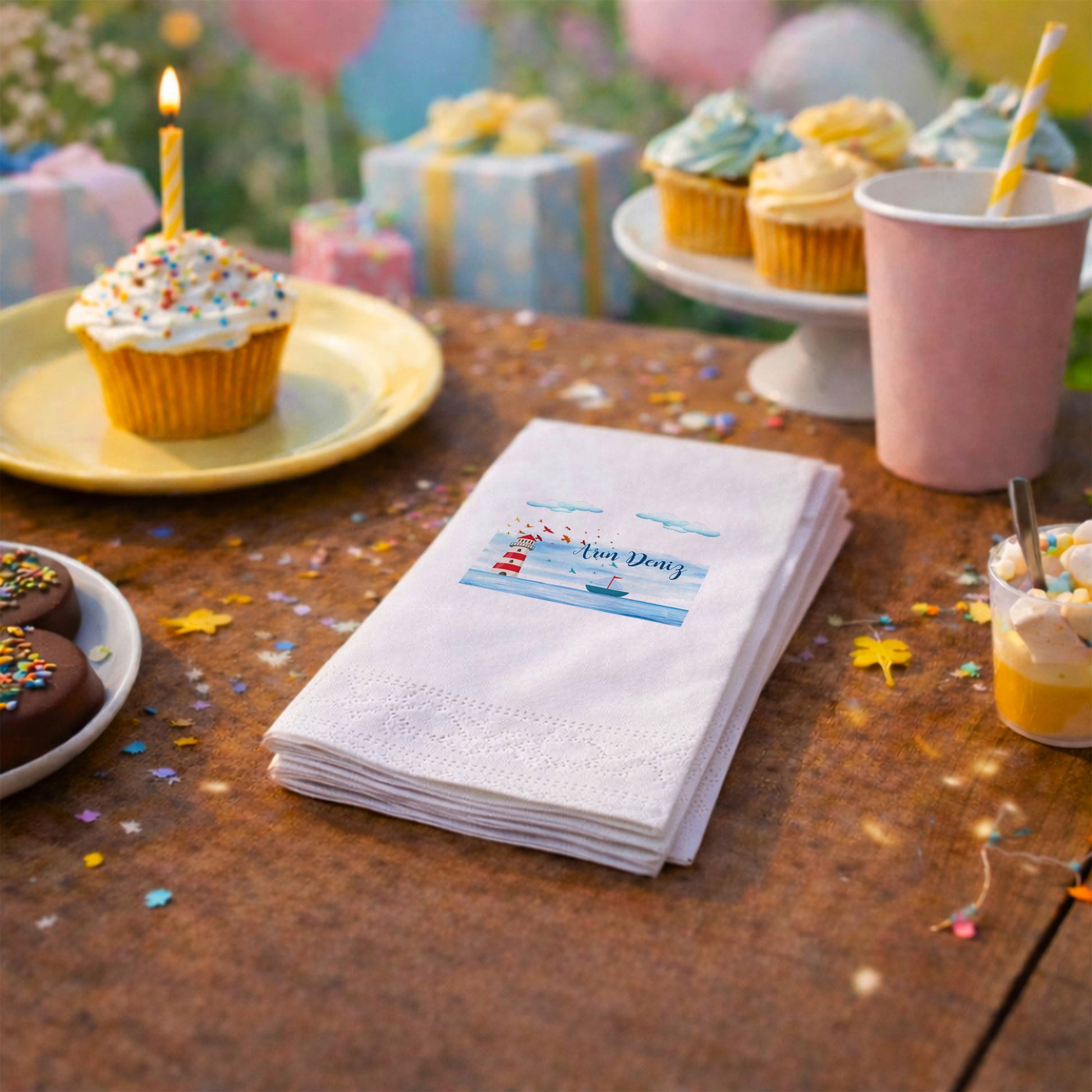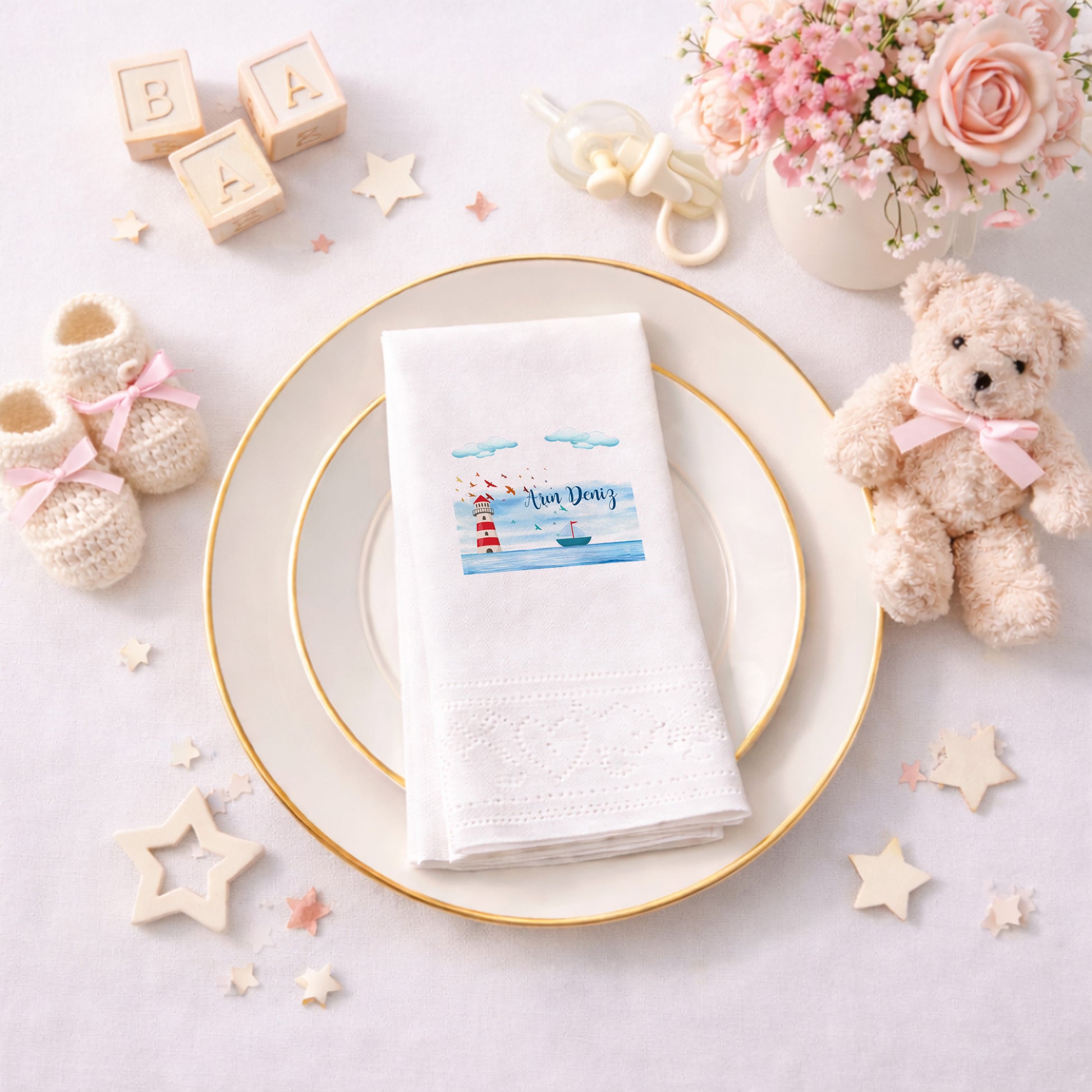 Küçük Prens illüstrasyonundan ilham alan bu tasarım, bebeğin dünyaya gelişini masalsı bir dille karşılamak isteyenler için hazırlanmıştır. Yıldızlar, gezegenler ve zarif çizimler sayesinde duygusal ve sıcak bir atmosfer sunar. Yenidoğan ziyareti, baby shower ve bebek mevlidi organizasyonlarında anlamlı bir masa detayı olarak öne çıkar. Kişiye özel isim bilgisi ile hazırlanan tasarım, misafirler için özel bir hatıra niteliği taşır. Çift katlı yapısı yumuşak ve dayanıklıdır. Gıda temasına uygun baskı ile üretilmiştir. Sade, duygusal ve hikâyesi olan konseptleri seven aileler için ideal bir seçimdir.