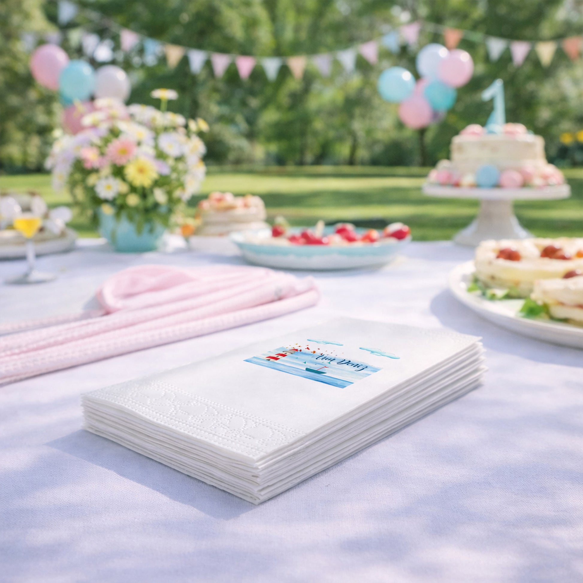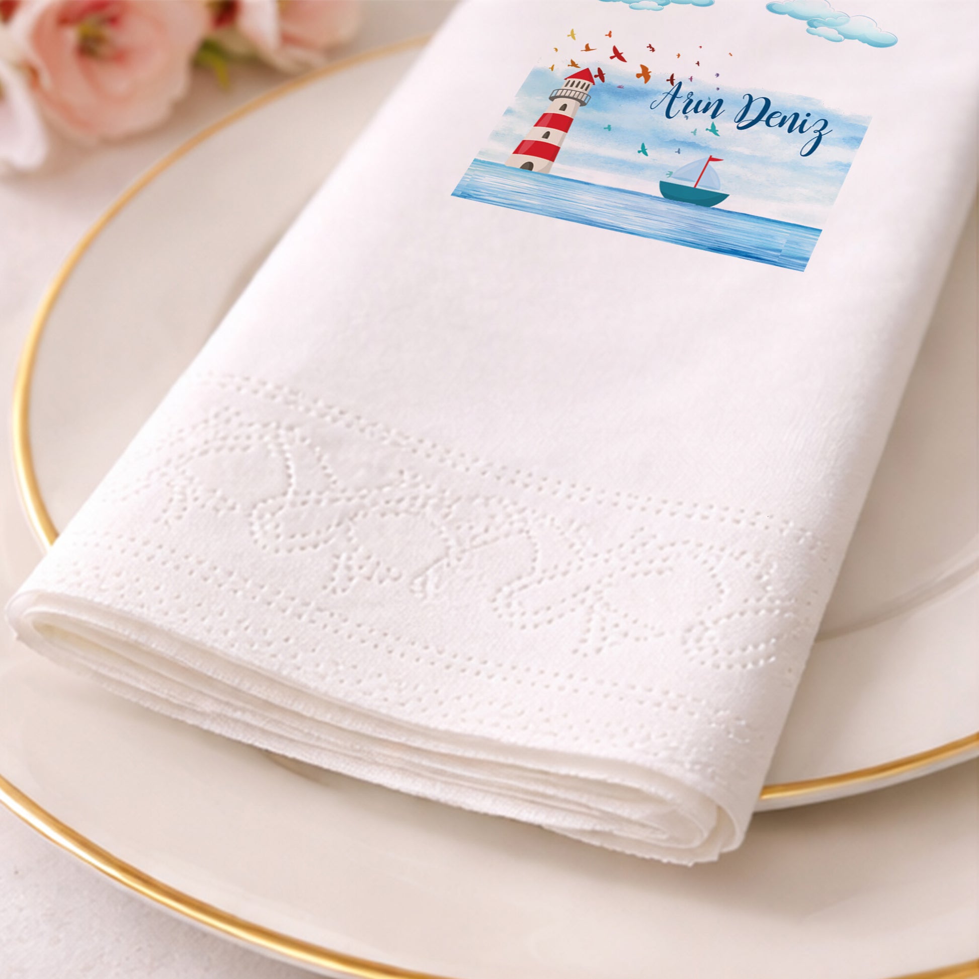 Tasarım, peçetenin ön yüzünde tam merkezde olacak şekilde yüksek çözünürlüklü baskı ile uygulanır. Dilersen özel konumlandırma taleplerini de iletebilirsin.