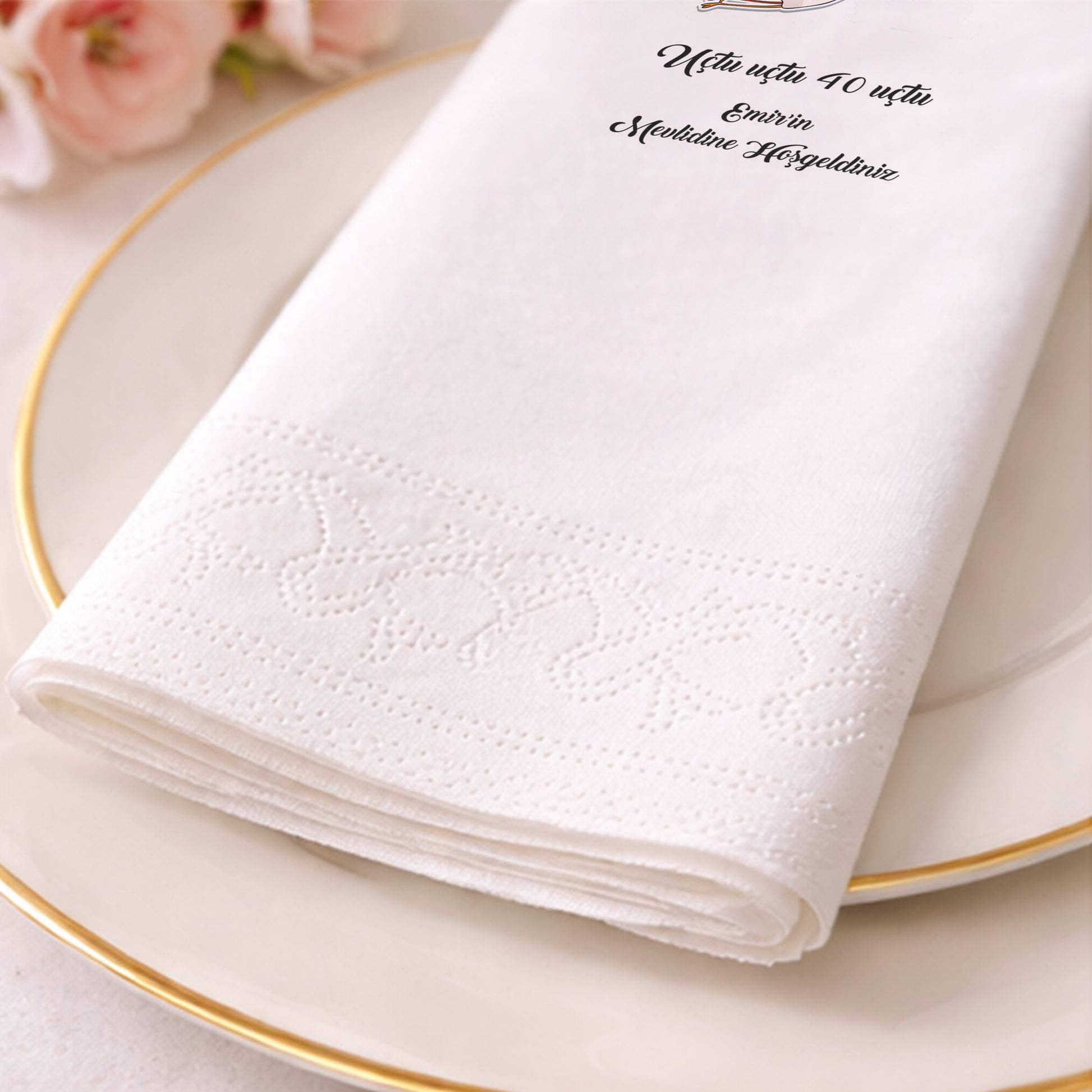 Leylek ve bebek figürü ile tasarlanan bu peçete, erkek bebek mevlidi ve hoş geldin bebek organizasyonları için anlamlı bir tema sunar. Kişiye özel isim bilgisi eklenerek hazırlanan tasarım, misafirlerinize sıcak bir karşılama hissi verir. Bulut detayları ve yumuşak renk paleti masa düzeninde huzurlu bir atmosfer oluşturur. Çift katlı ve yumuşak dokulu yapısı ile kullanımı rahattır. Gıda temasına uygun baskı teknolojisi ile üretilmiştir. Geleneksel ve modern sunumları bir araya getiren zarif bir üründür.