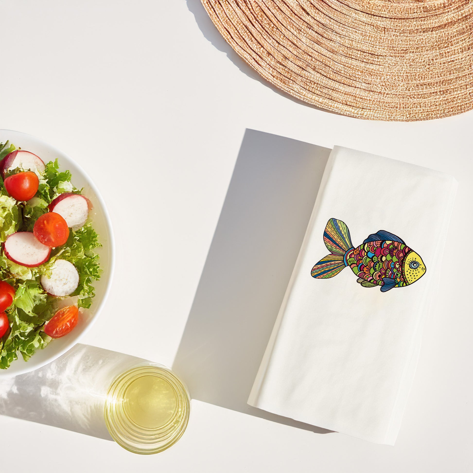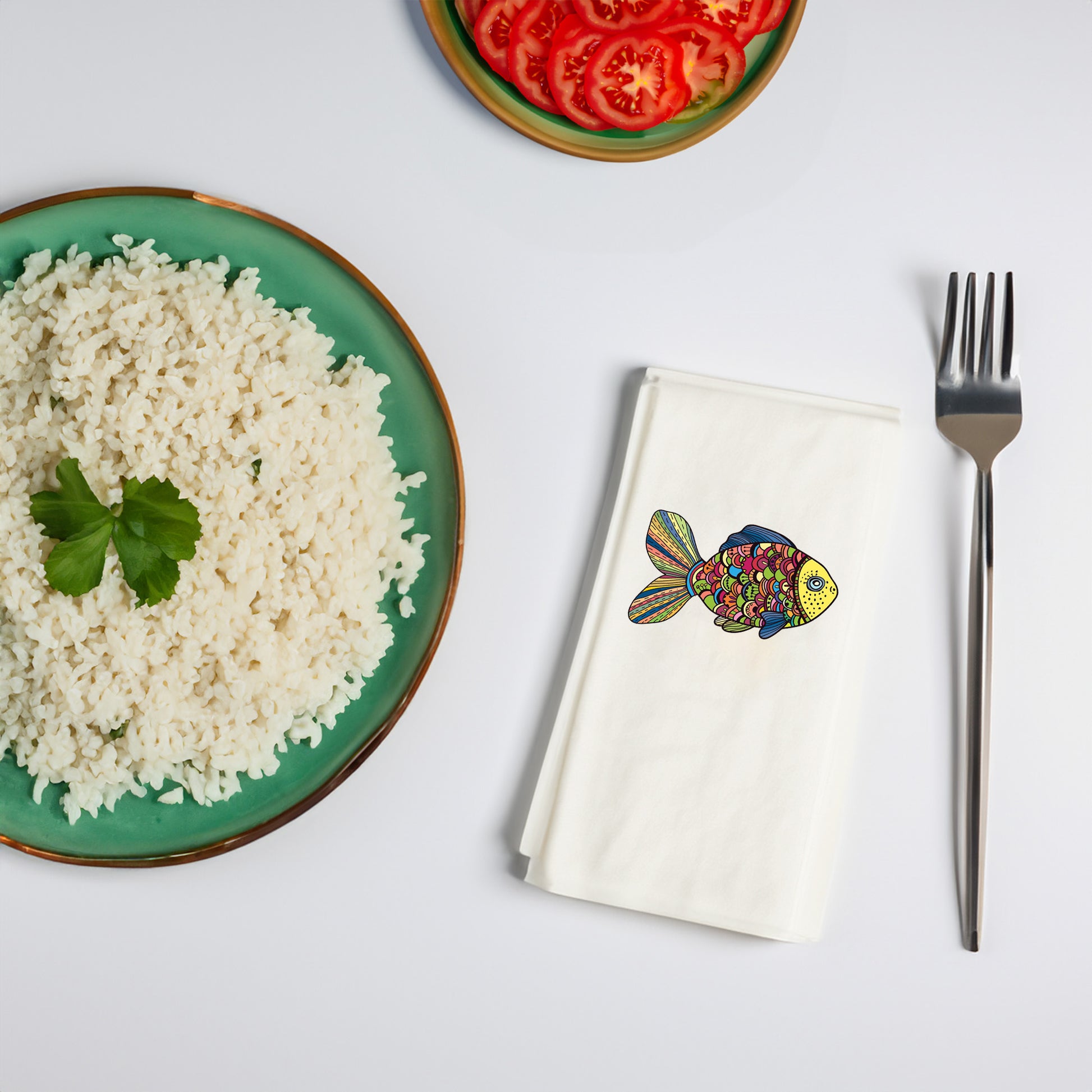 Sofralarınıza hem sanatı hem huzuru taşıyan Renkli Balık Mandala Desenli Peçete, modern ve boho konsept sevenler için tasarlandı.