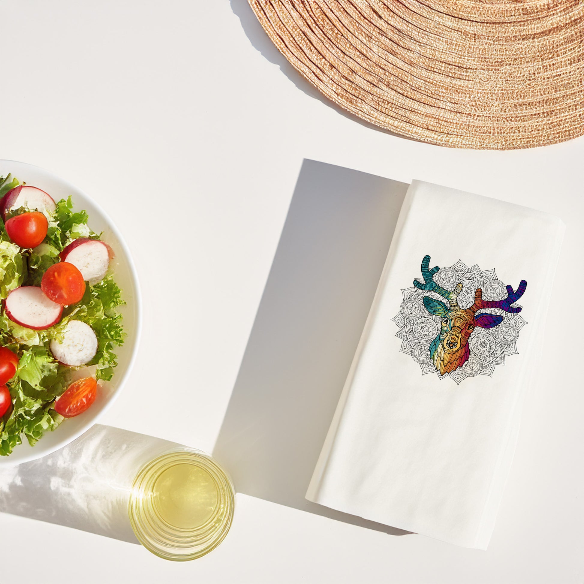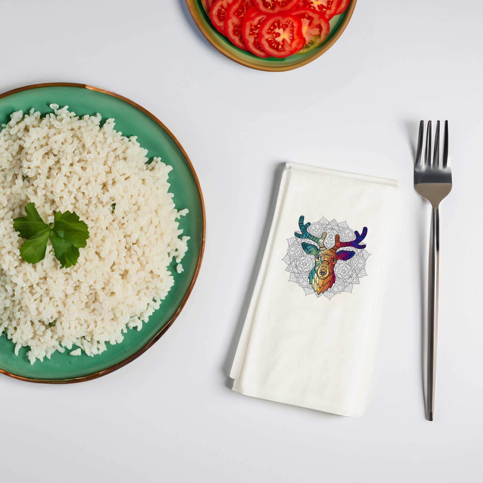 Sofranıza hem zarafet hem de bohem bir ruh katmak isteyenler için tasarlanan Mandala Geyik Desenli Baskılı Peçete, modern dekorasyonla uyumlu özel bir tasarımdır. Renkli mandala motifleri ve zarif geyik figürü ile masa düzeninizi estetik bir dokunuşla tamamlar.