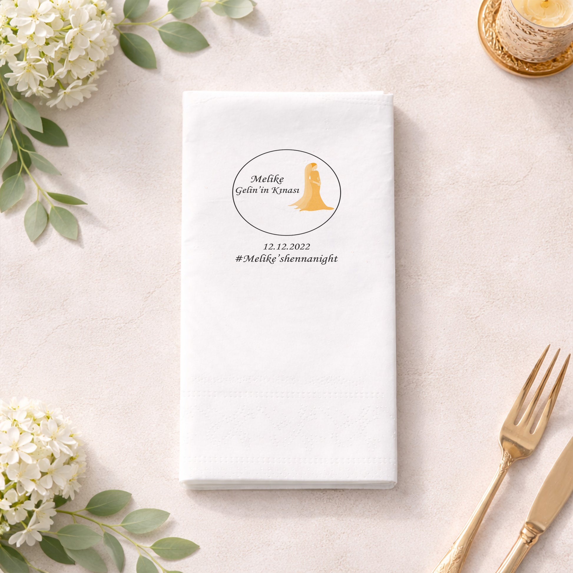 Melike Gelin’in kınası için hazırlanan bu siyah zeminli baskılı peçete, asalet ve şıklığı bir araya getiriyor. Daire içerisine yerleştirilmiş altın sarısı gelin figürü ve modern kaligrafik yazı tipi ile kına gecesi masalarınızda lüks bir hava yaratır. Kişiselleştirilmiş hashtag ve tarih detaylarıyla zenginleştirilen bu organizasyon peçetesi, çekilen fotoğraflarda harika birer detay olarak öne çıkar. Kaliteli kağıt dokusu üzerine uygulanan gold tonlarındaki baskı, dökülme yapmaz ve canlılığını korur. Nişan ve kına gibi özel davetlerde masa düzenini bir üst seviyeye taşımak isteyenler için özenle üretilmiştir. Markalı sunum anlayışımızla hazırlanan bu özel tasarım, konuklarınıza sunduğunuz değeri yansıtır. Unutulmaz bir gece için Melike’nin özel tasarımını tercih edin.