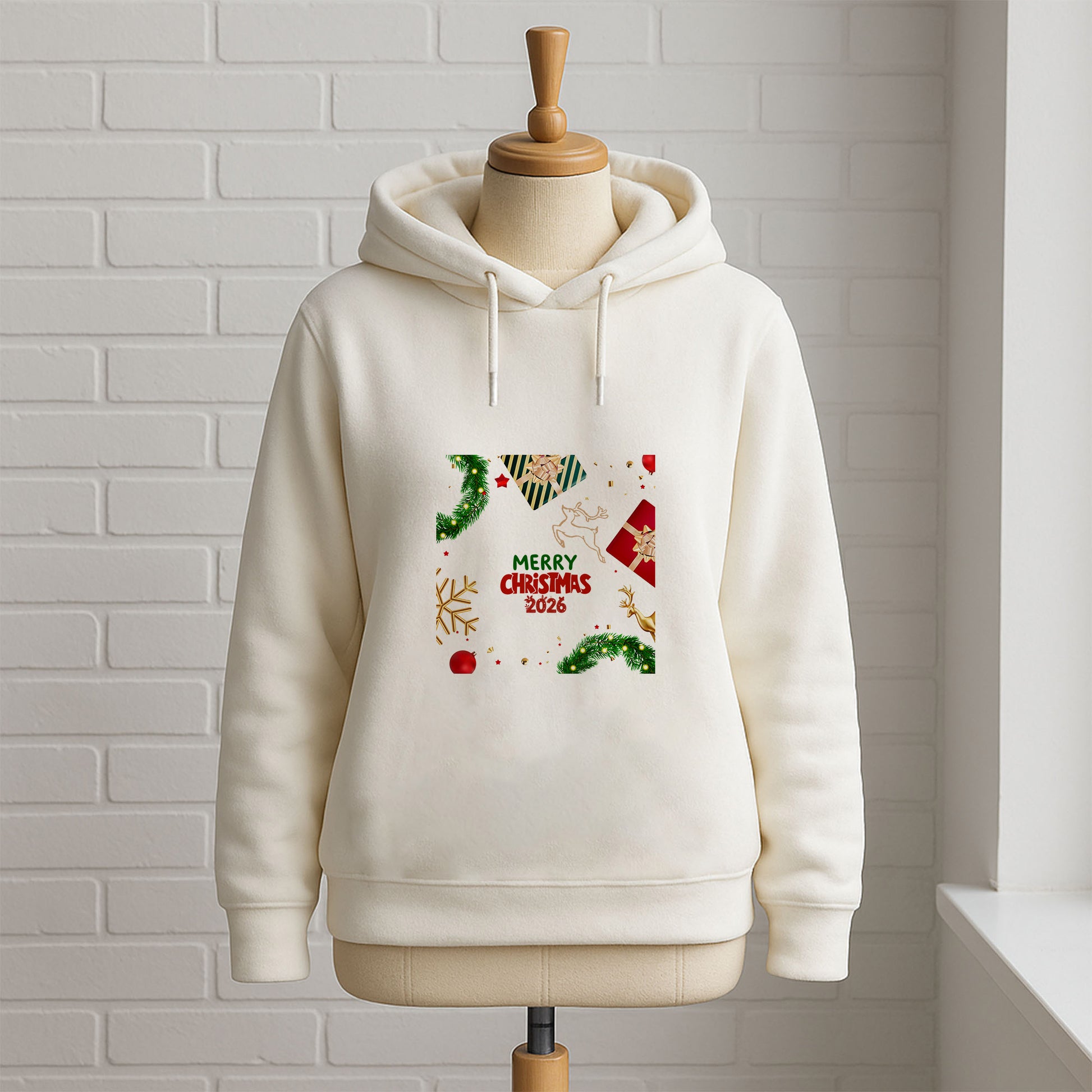 “Merry Christmas 2026” yazılı bu yılbaşı sweatshirt, siyah zemin üzerinde yer alan çam dalları, hediye paketleri, altın yılbaşı süsleri ve zarif geyik figürü ile klasik ve modern yılbaşı ruhunu bir araya getirir. Dengeli kompozisyonu sayesinde hem dikkat çekici hem de şık bir görünüm sunar.