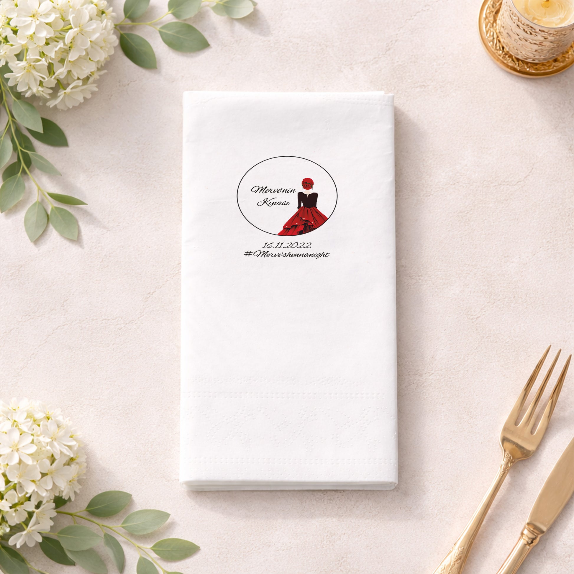 Merve’nin kına gecesi için hazırlanan bu ihtişamlı peçete, siyah zemin üzerindeki kabarık kırmızı elbiseli gelin figürüyle dikkatleri üzerine çekiyor. "Merve’nin Kınası" yazısı ve özel hashtag detayıyla tamamen kişiselleştirilmiş bu ürün, gecenizin star parçası olmaya aday. Kına gecesi konseptinizle bütünleşecek bu tasarım, sofralarınıza lüks bir dokunuş katar. Premium kağıt dokusu sayesinde yüksek emicilik sağlar ve yumuşak yapısıyla misafirlerinizi memnun eder. Baskı netliği, gelin figüründeki en ince ayrıntıları dahi ortaya koyar. Kına organizasyonlarında farklılık yaratmak ve davetlilerinize özel bir sunum hazırlamak istiyorsanız bu baskılı peçete ideal bir seçimdir. Hijyenik koşullarda üretilen ve özenle paketlenen ürünlerimiz, en mutlu gününüze profesyonellik katacaktır. Kendi isminizle özelleştirebileceğiniz bu şık tasarımı hemen keşfedin ve kına gecenizi unutulmaz kılın.
