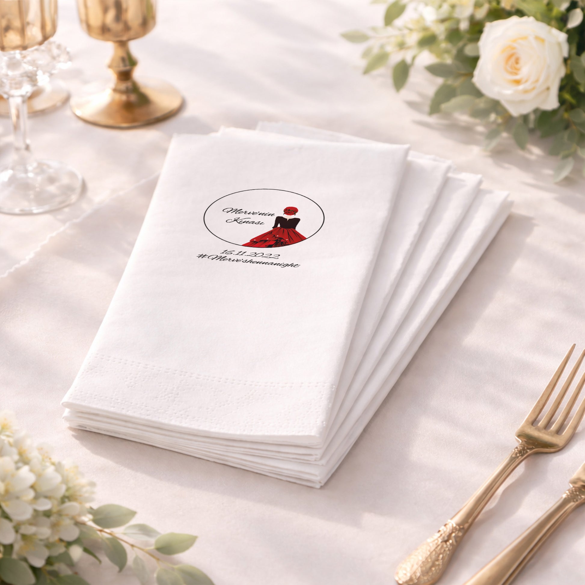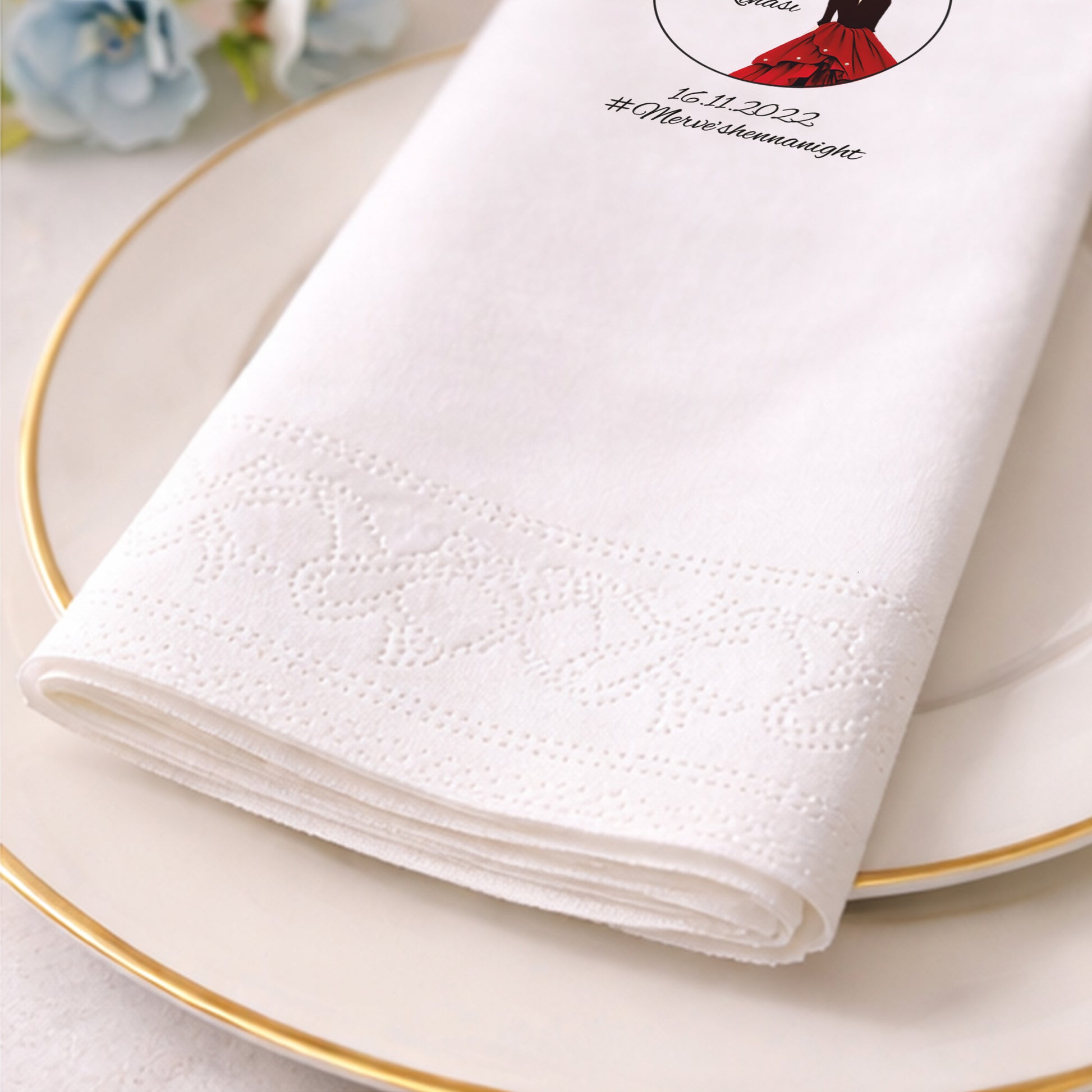 Tasarım, peçetenin ön yüzünde tam merkezde olacak şekilde yüksek çözünürlüklü baskı ile uygulanır. Dilersen özel konumlandırma taleplerini de iletebilirsin.