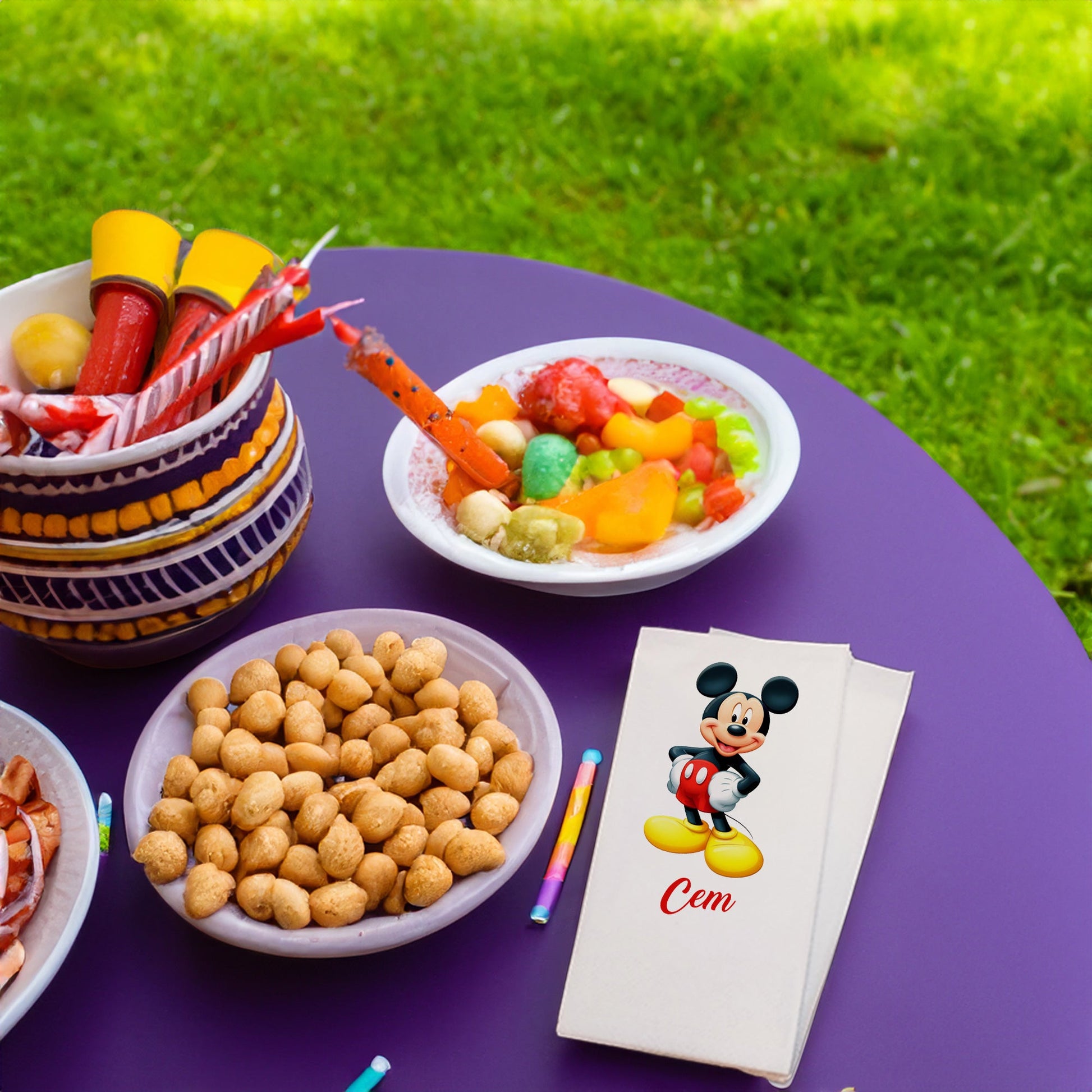 Her anınıza anlam katan ve duygularınızı yansıtan özel bir dokunuş: "Mickey Mouse Temalı Baskılı Peçeteler! Doğum günü, Babyshower,Diş Buğdayı ve Sünnet Organizasyonlarınıza daha anlamlı hale getirecek ve sevdiklerinizle paylaşacağınız samimi anları renklendirecek.