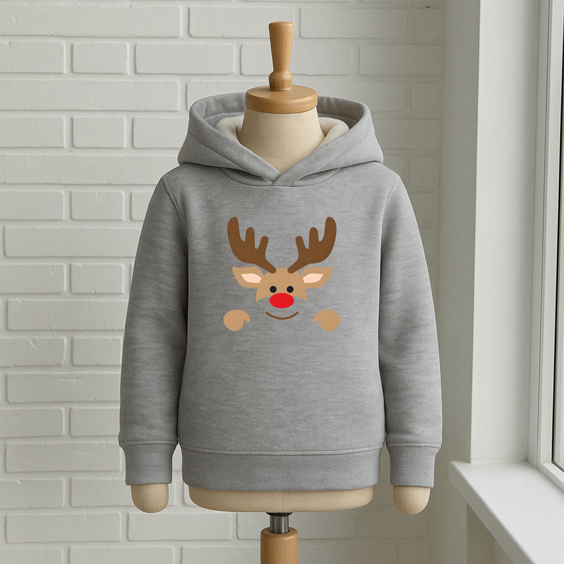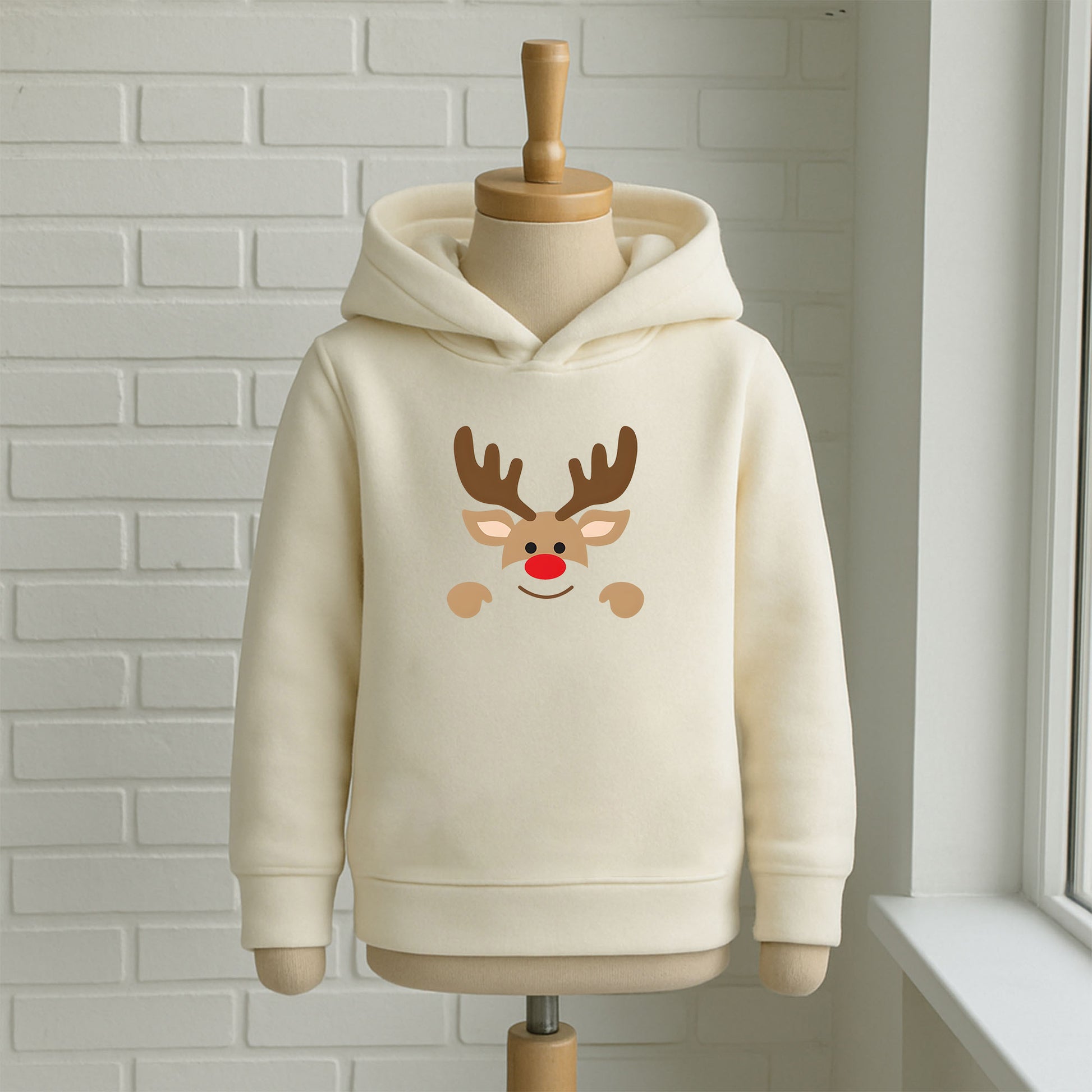 Sade çizgilerle tasarlanmış kırmızı burunlu geyik ikonuyla minimal yılbaşı çocuk sweatshirt modeli.