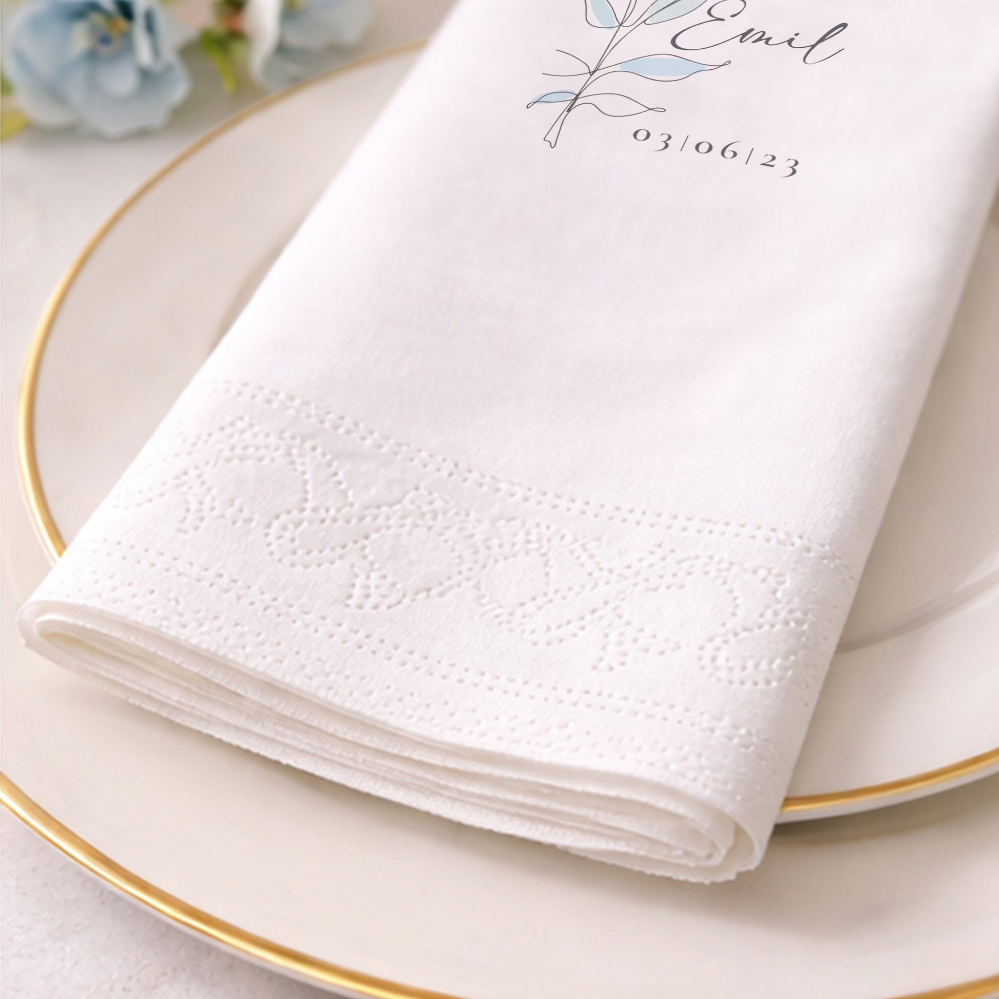 Tasarım, peçetenin ön yüzünde tam merkezde olacak şekilde yüksek çözünürlüklü baskı ile uygulanır. Dilersen özel konumlandırma taleplerini de iletebilirsin.