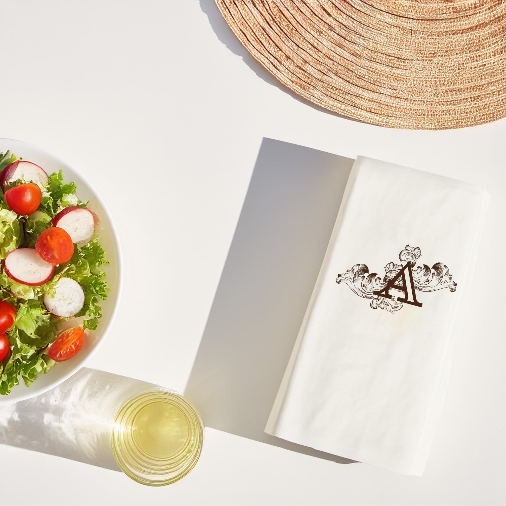 Sofranıza zarafet ve kişisel dokunuş katmak istiyorsanız, monogram “A” harfli bu özel baskılı peçete tam size göre! Şık yaprak motifleriyle taçlanan monogram tasarım, davet sofralarından günlük kullanımınıza kadar her ortamda estetik bir görünüm sağlar.