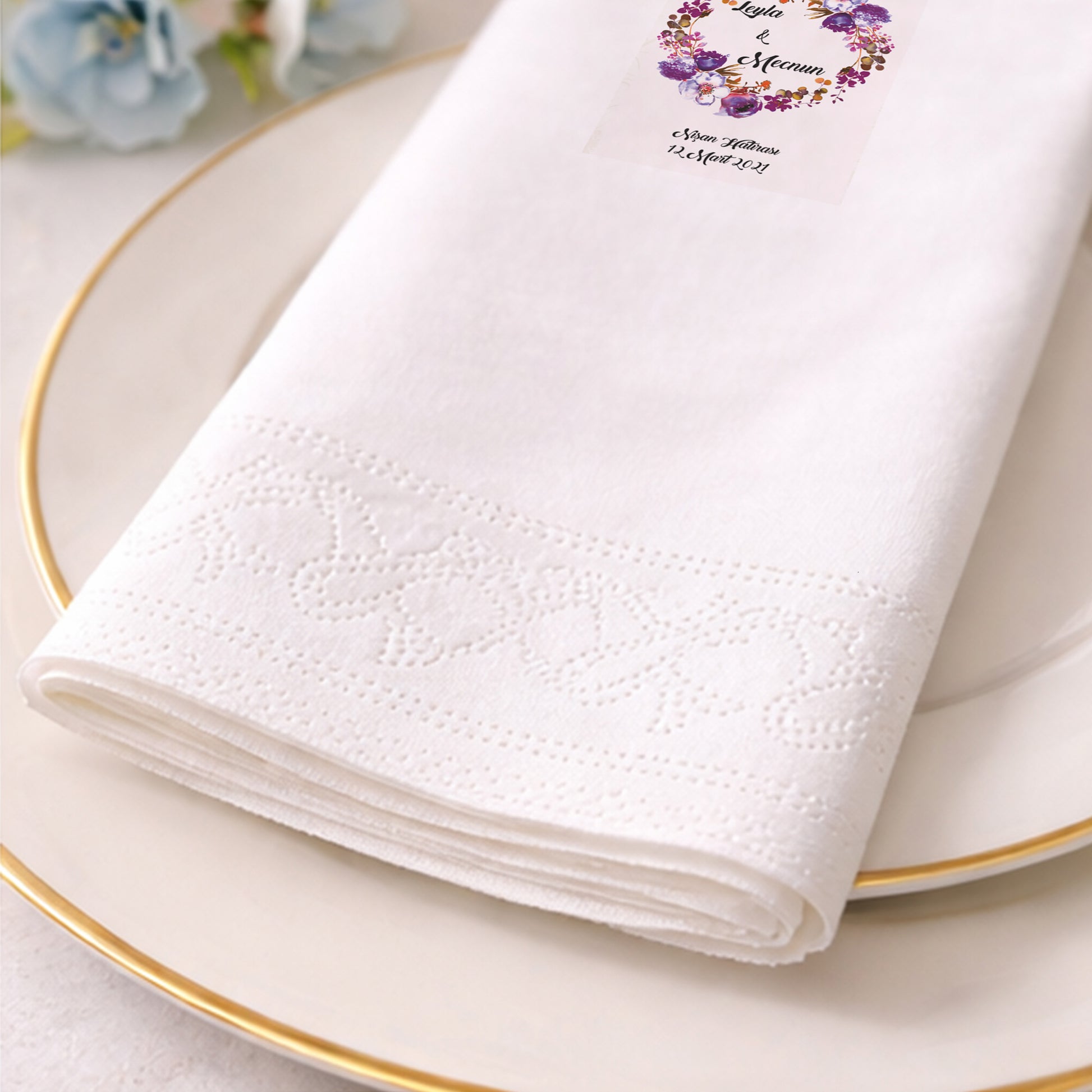 Mor ve lila tonlarında çiçeklerle oluşturulan bu çelenk tasarımı, nişan organizasyonları için sofistike ve romantik bir görünüm sunar. İsim ve tarih detaylarıyla kişiselleştirilen baskılı peçete, özel gün peçetesi olarak davet masalarında estetik bir bütünlük sağlar. Organizasyon peçetesi olarak hem sade hem şık konseptlerle uyumludur. Nişan peçetesi kullanımında davetlilere zarif bir hatıra bırakır. Baskılı peçete yüzeyi, çiçek detaylarını net ve dengeli biçimde yansıtır. Güven veren, profesyonel ve markalı bir sunum arayan çiftler için özenle tasarlanmış özel bir üründür.