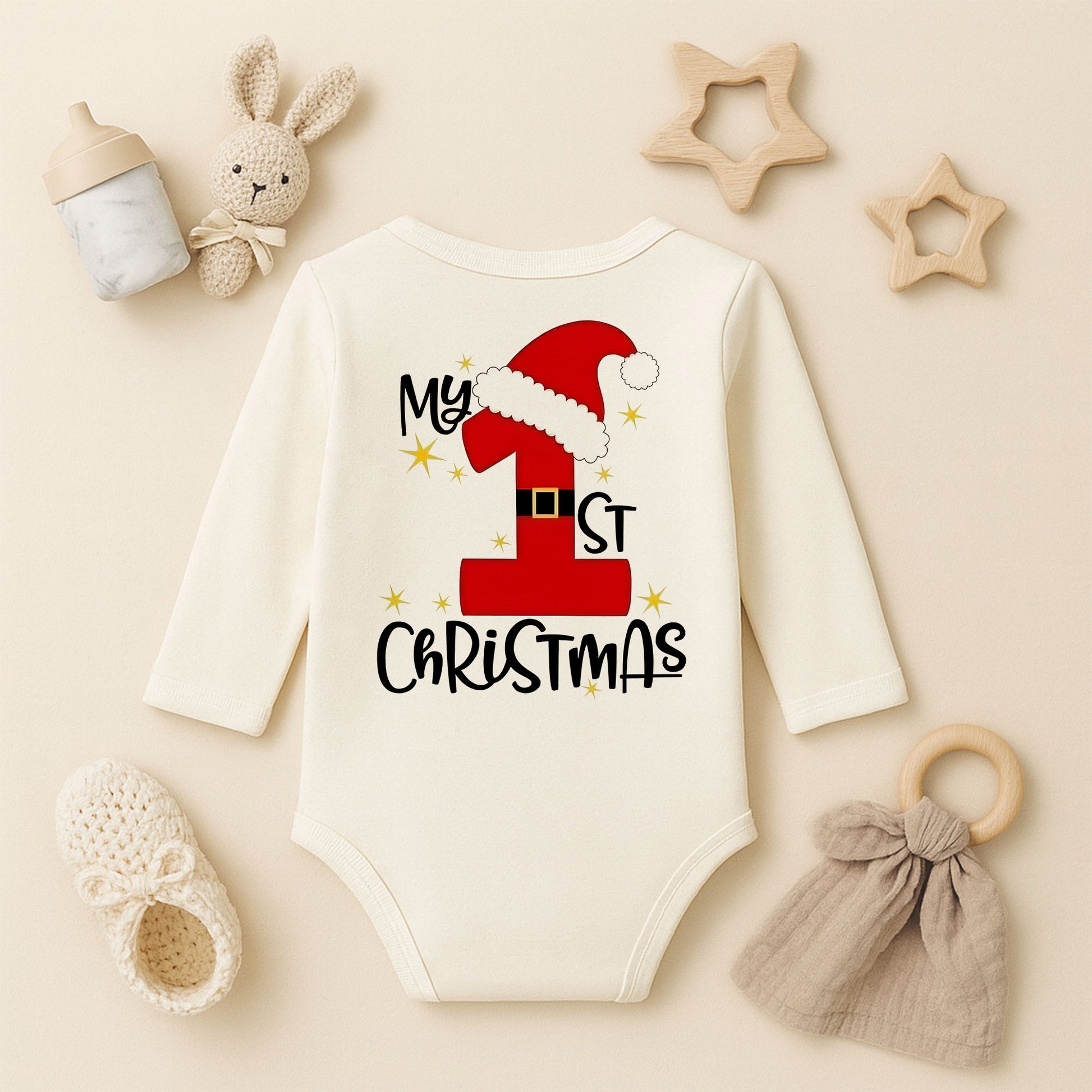 “Noel şapkalı 1” figürü ve “My 1st Christmas” yazısıyla tasarlanan bu özel bebek zıbını, ilk yılbaşı fotoğrafları ve anıları için harika bir seçimdir.