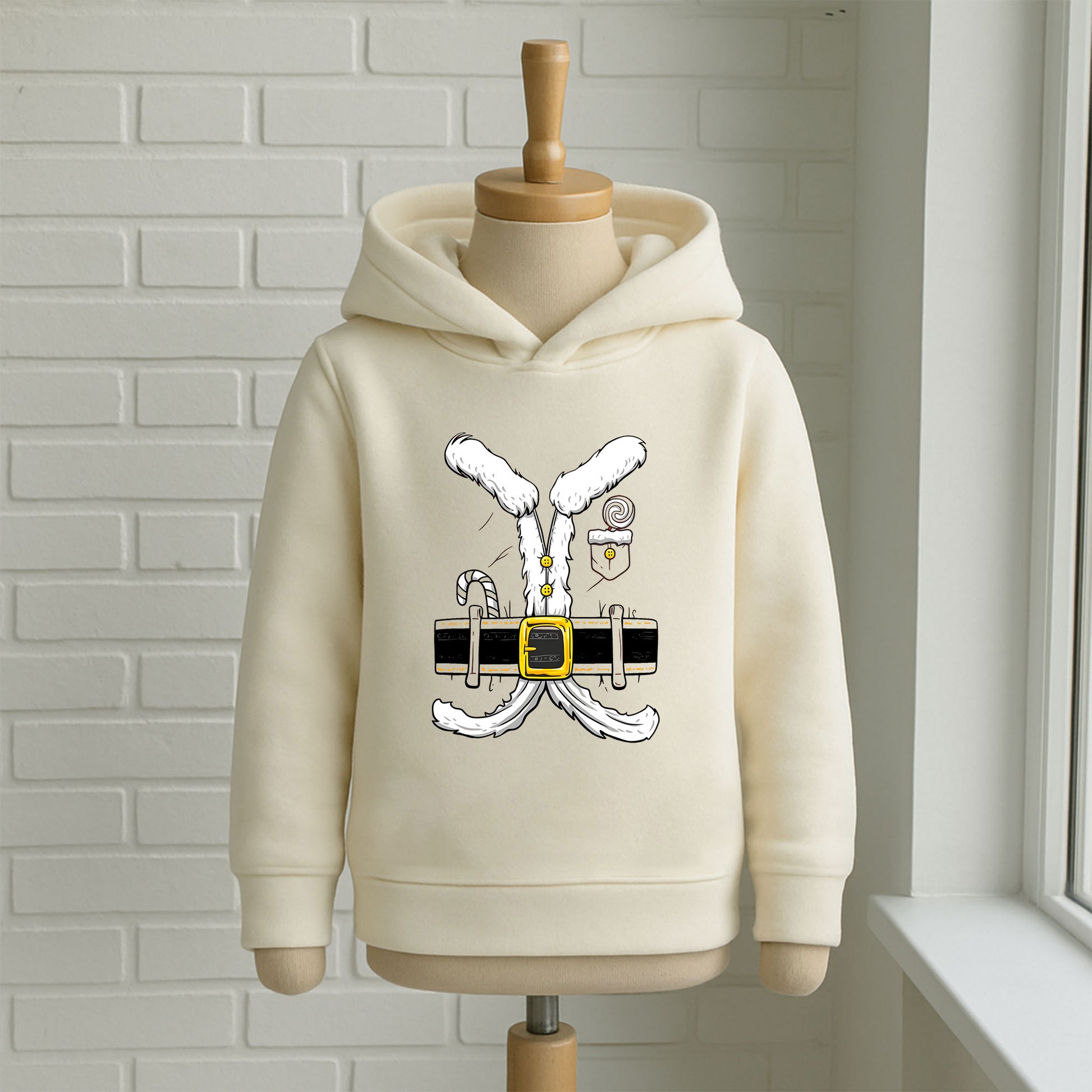 Bu eğlenceli yılbaşı tasarımı, Noel kostümü görünümü veren detaylarıyla çocuklara oyuncu ve neşeli bir stil kazandırır. Beyaz peluş efektli üst bölüm, sarı kemer detayı ve şeker temalı aksesuar çizimleri sayesinde sweatshirt, tek parça olmasına rağmen tam bir yılbaşı kostümü hissi yaratır.