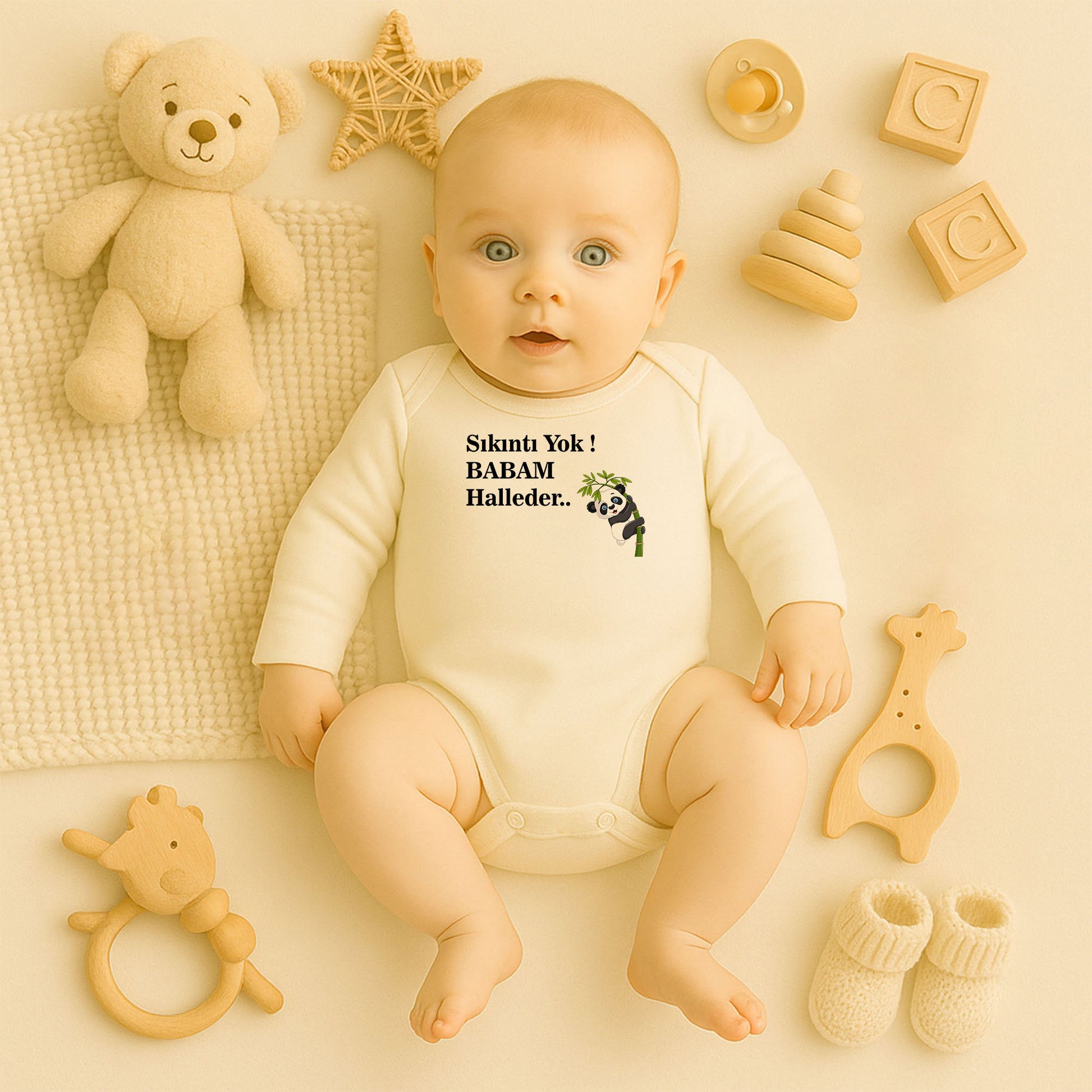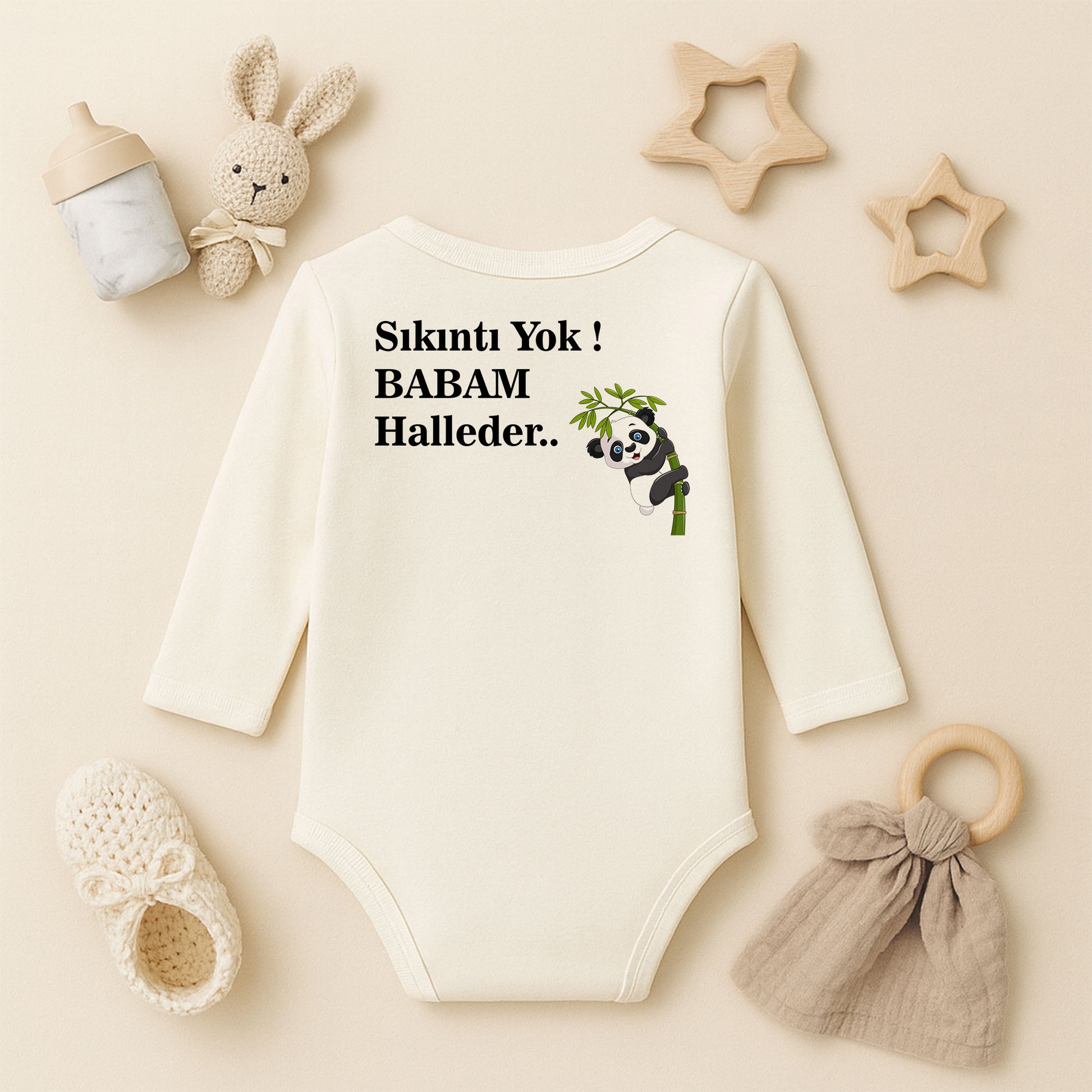 Bambuya tırmanan sevimli panda illüstrasyonu ile hazırlanan bu özel bebek zıbını, hem eğlenceli hem minimal bir stil sunar.