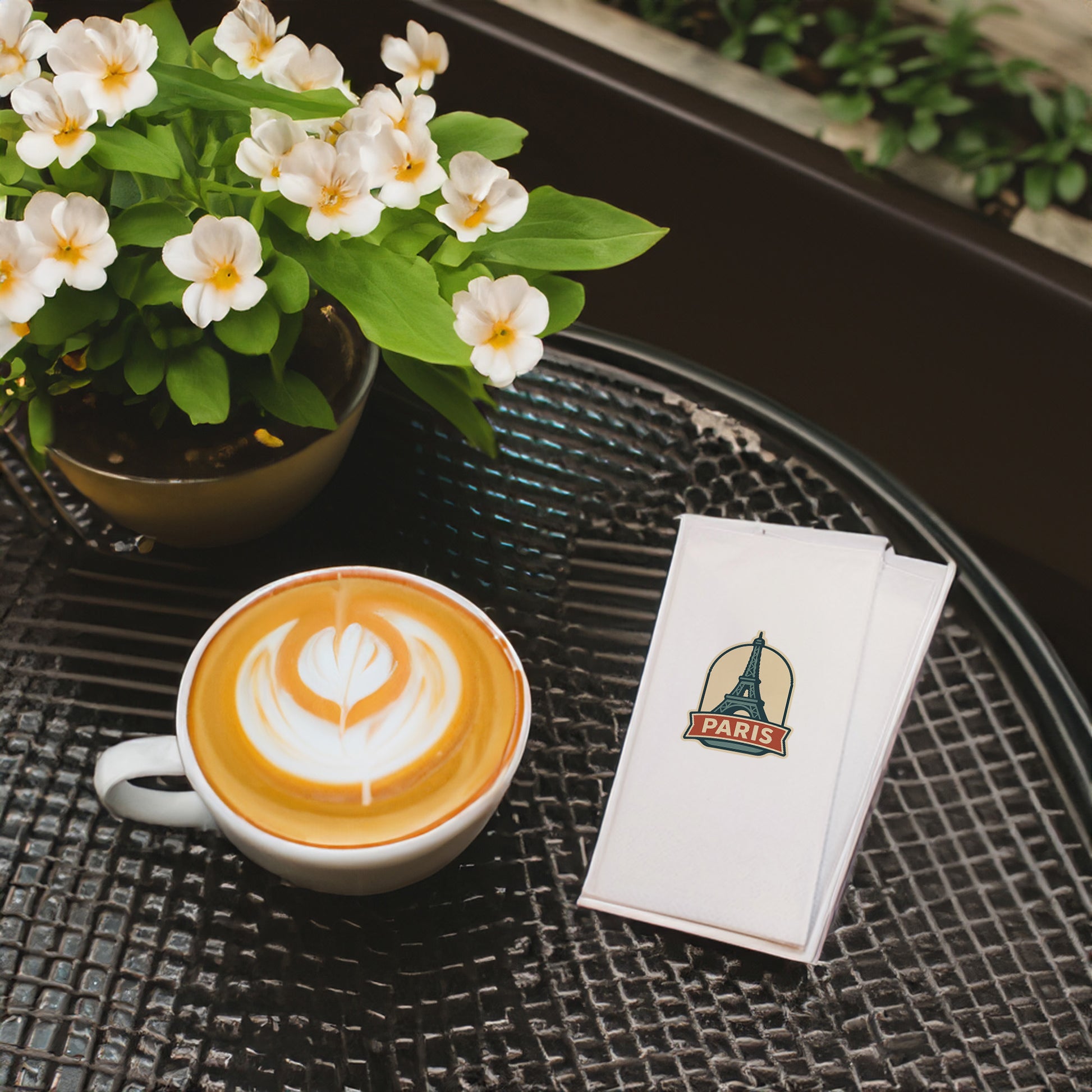 Paris temalı bu özel tasarım peçete, sofralarda Fransız zarafetini ve şehir ruhunu bir araya getirir.