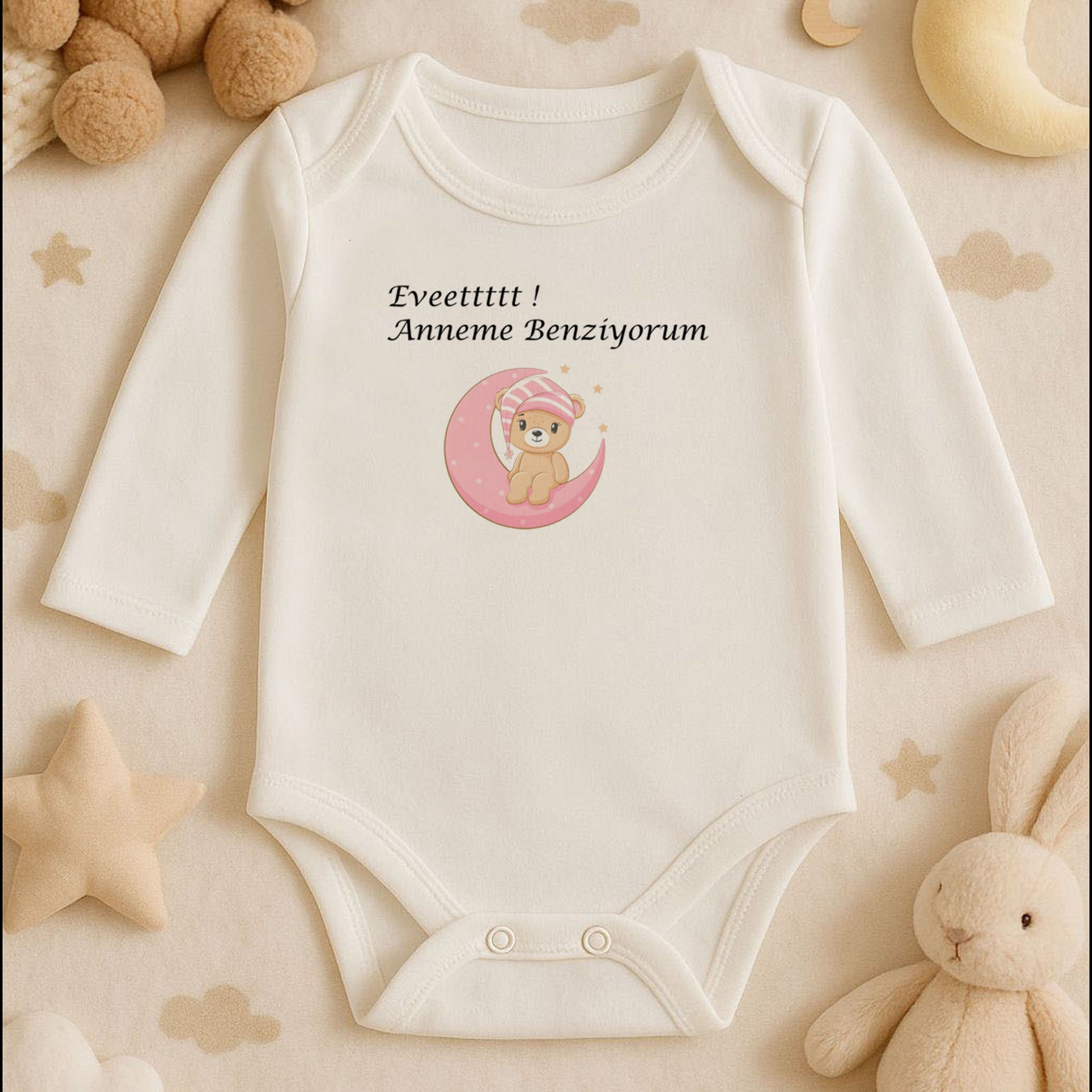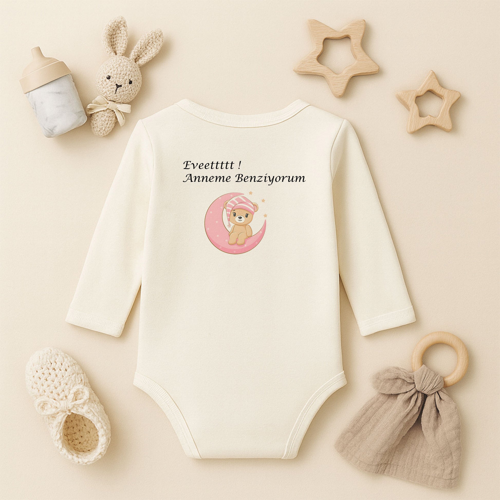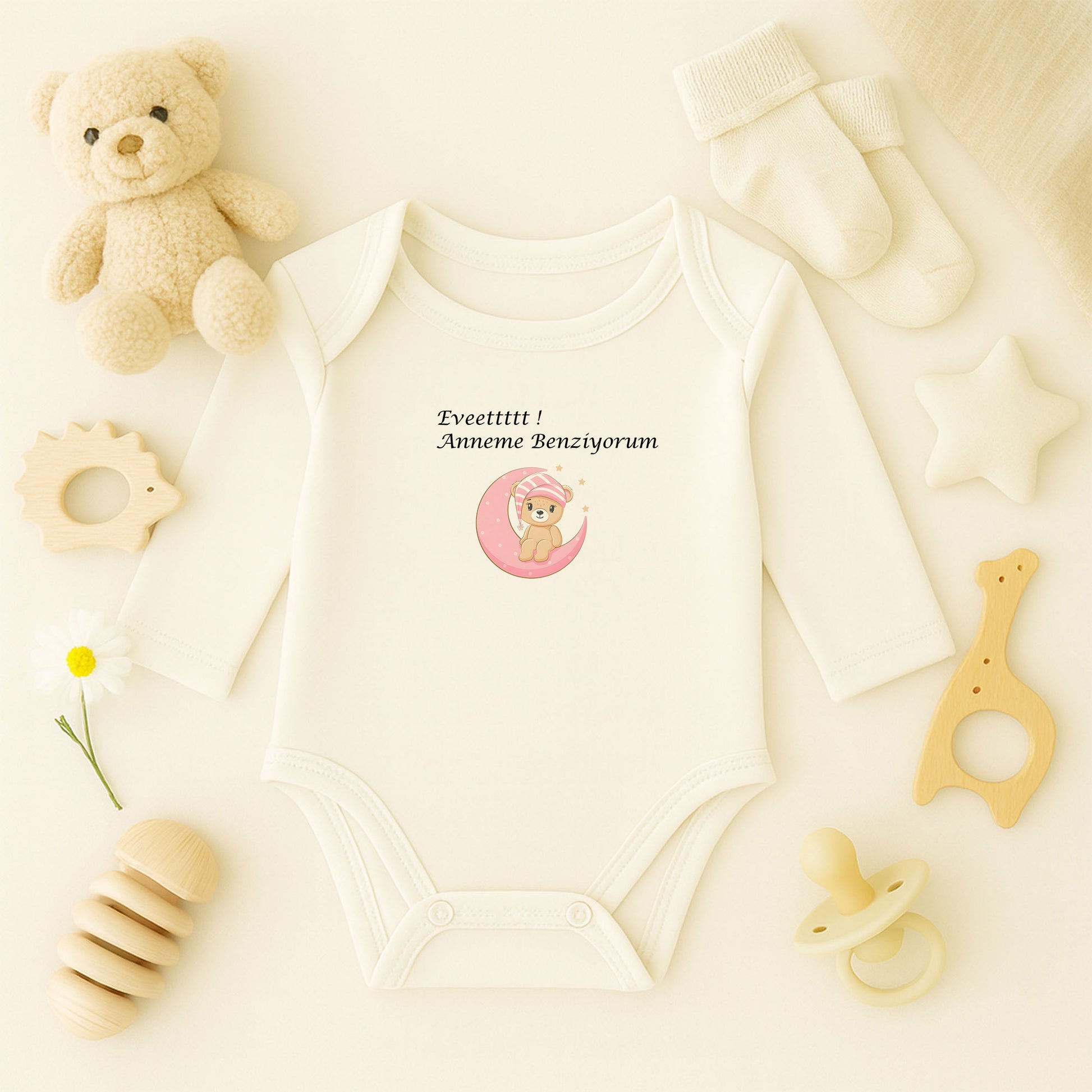Kişiye Özel Bebek Zıbını – Pembe Ay Üzerinde Ayıcık Tasarım | 1–36 Ay