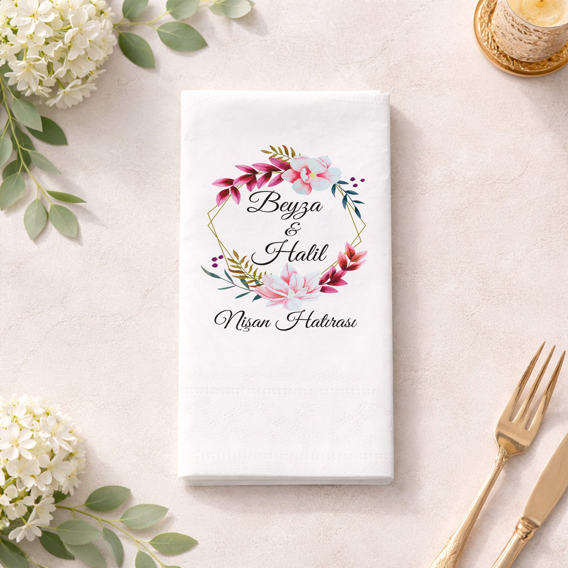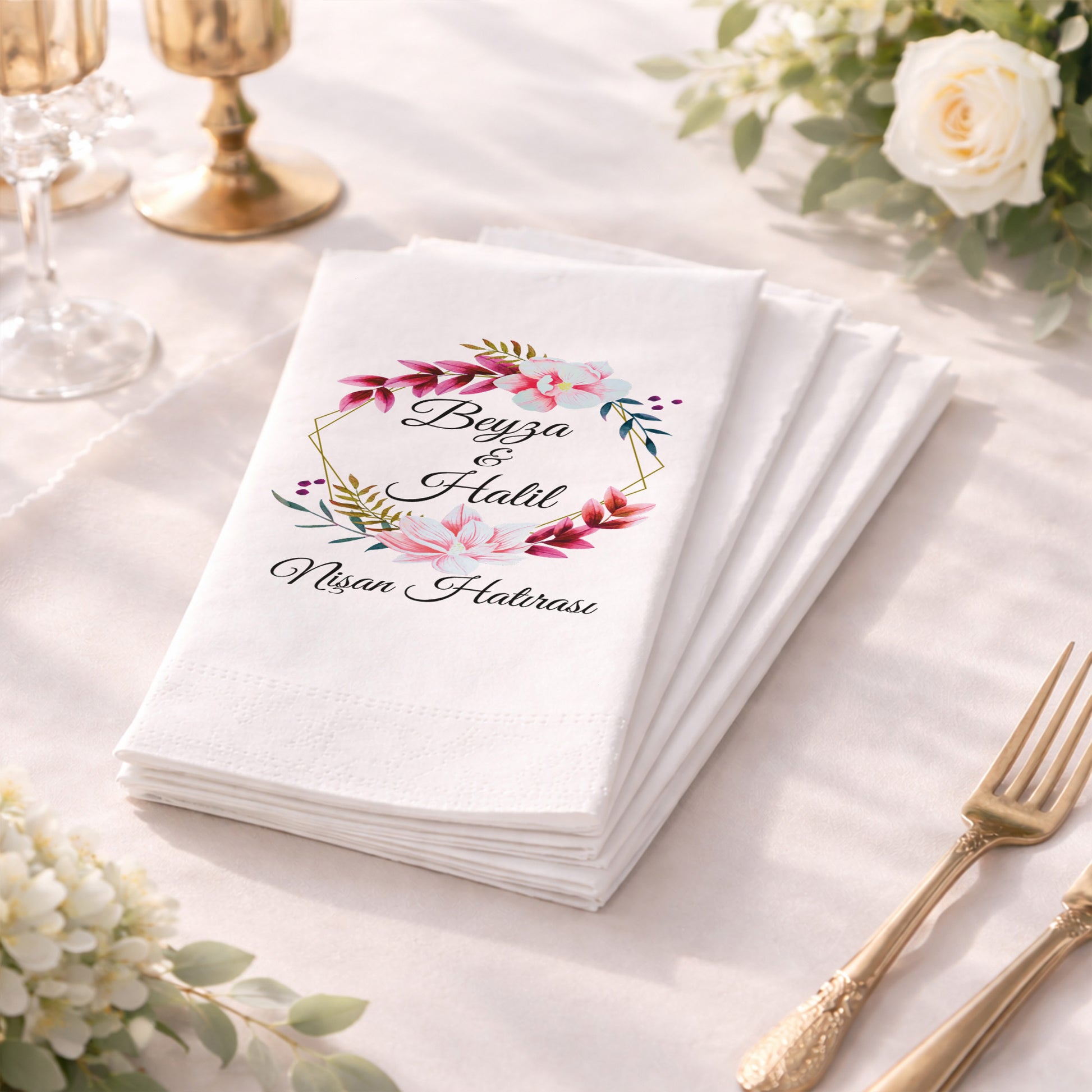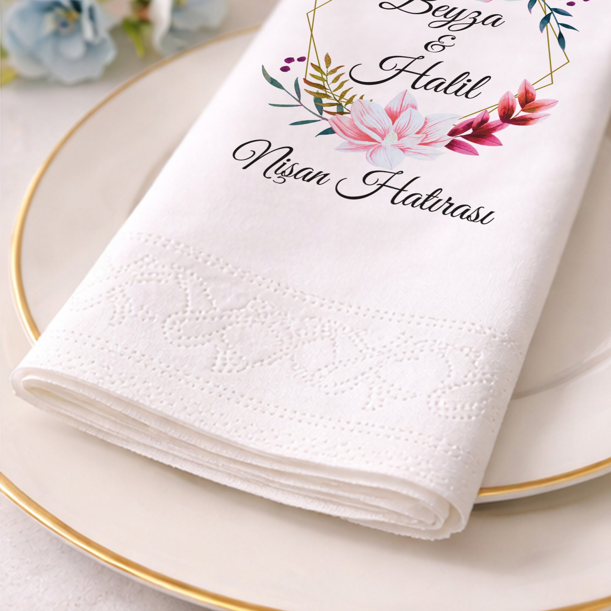 Pembe tonlarda çiçek illüstrasyonlarıyla tasarlanan bu baskılı peçete, düğün ve nişan organizasyonlarına romantik bir hava katar. İsim odaklı yapısıyla özel gün peçetesi olarak kişiselleştirilebilir. Organizasyon peçetesi olarak masalara sıcak ve zarif bir görünüm sağlar. Düğün peçetesi ve nişan peçetesi olarak kullanıma uygundur. Baskılı peçete tasarımı net, renkleri dengelidir. Romantik konseptleri tercih eden çiftler için güven veren ve estetik bir seçenektir.
