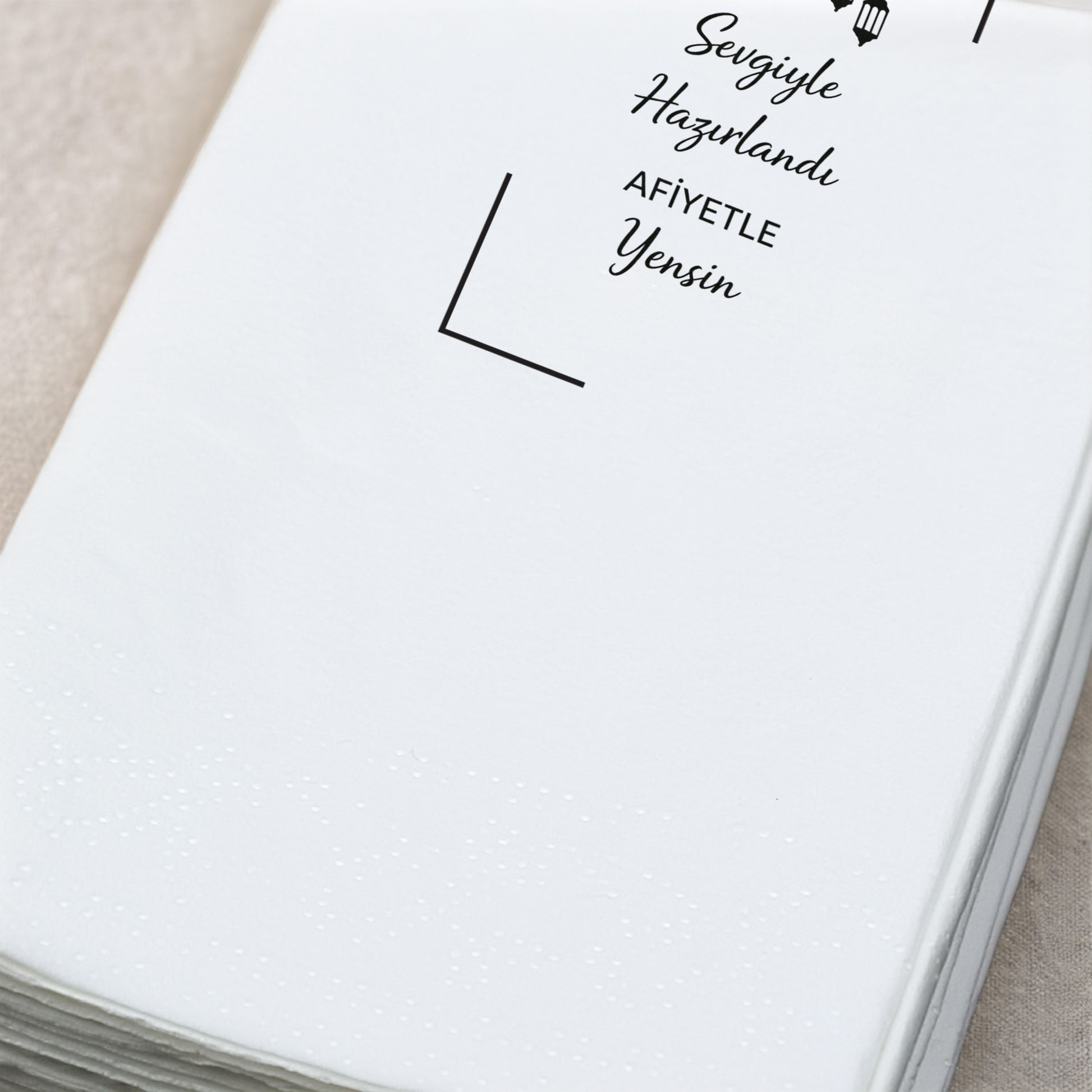 Tasarım, peçetenin ön yüzünde tam merkezde olacak şekilde yüksek çözünürlüklü baskı ile uygulanır. Dilersen özel konumlandırma taleplerini de iletebilirsin.