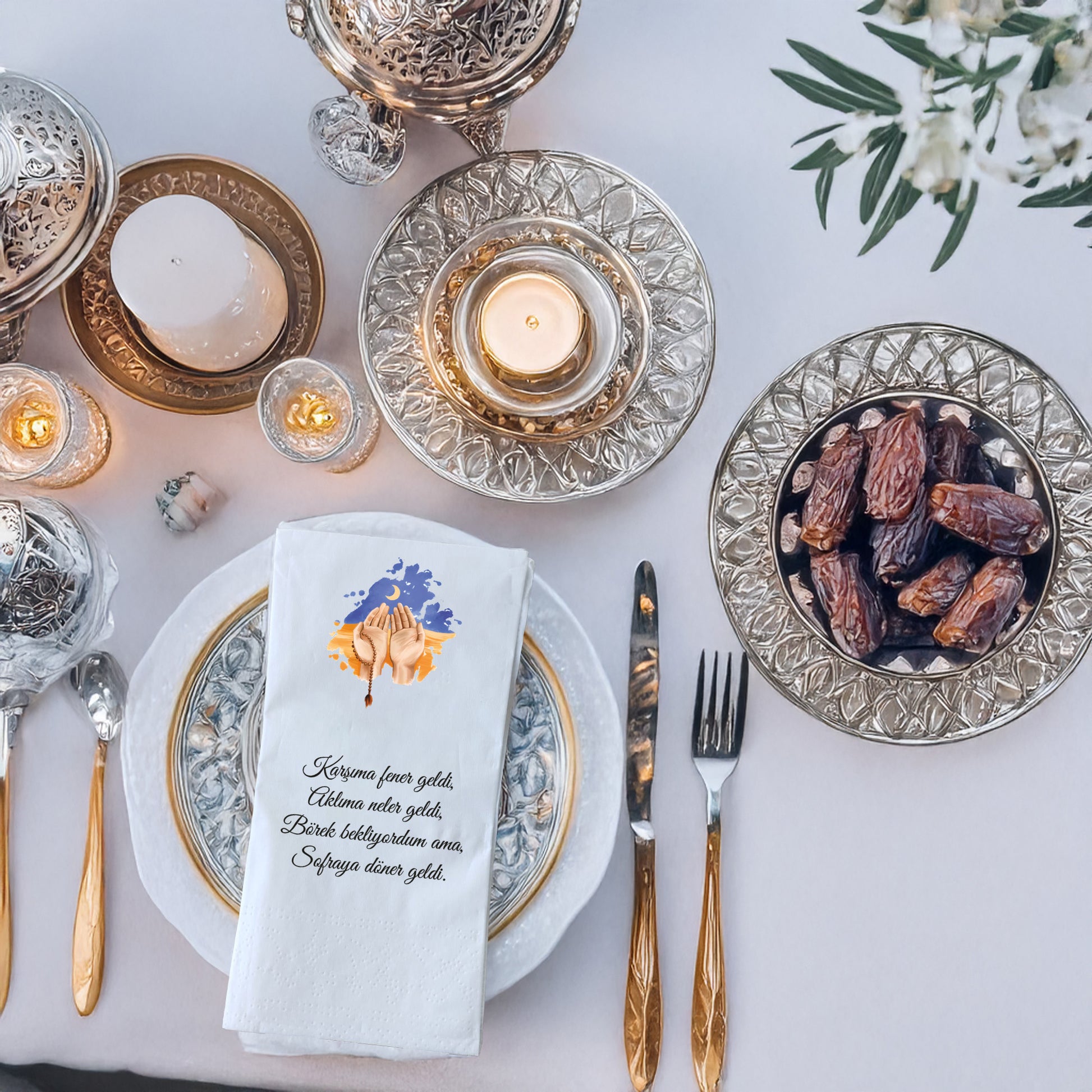 Ramazan’ın bereketini ve sıcaklığını sofralarınıza taşıyan Ramazan Temalı Desenli Yazılı Peçete, özel tasarlanmış motifleri ve anlamlı sözleriyle iftar ve sahur sofralarına şıklık katar.