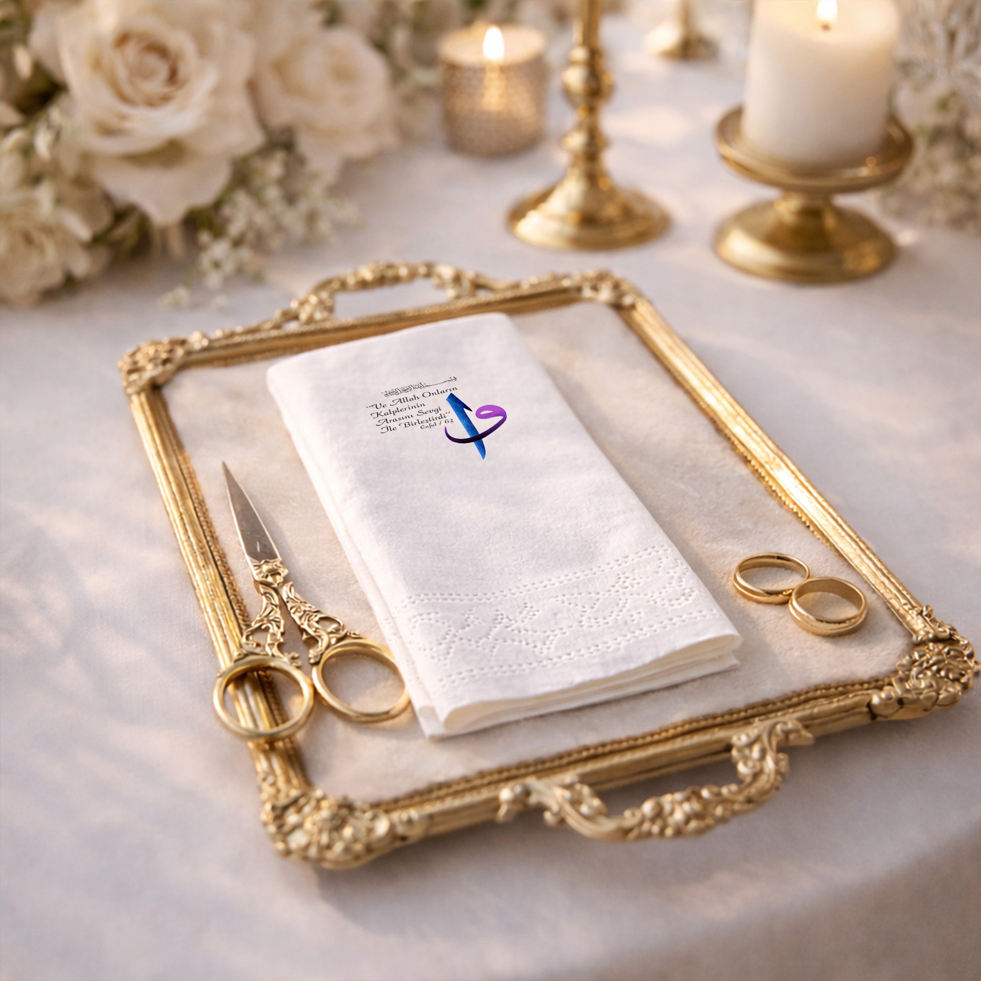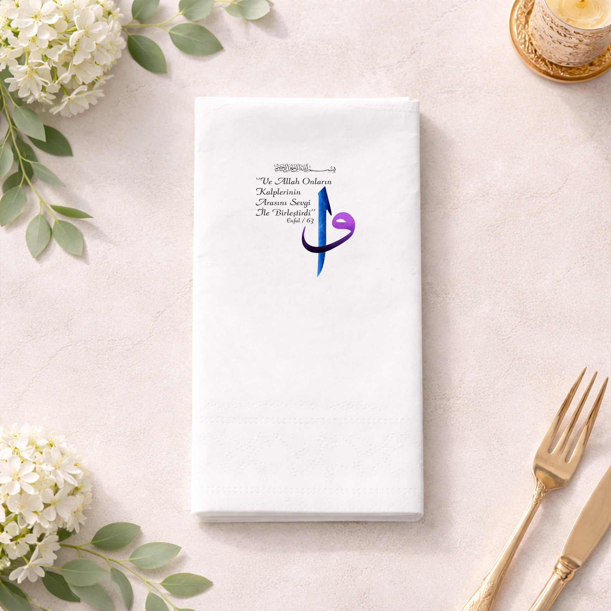 Renkli hat sanatıyla öne çıkan bu baskılı peçete, nikah ve düğün organizasyonlarında klasik tasarımların dışına çıkmak isteyenler için hazırlandı. Modern renk geçişleri ile yorumlanan ayet detayı, özel gün peçetesi kategorisinde fark yaratan bir stil sunar. Düğün peçetesi olarak masalarda dikkat çekerken, nikah peçetesi olarak da anlamlı bir hatıra oluşturur. Şık ve dengeli kompozisyonu sayesinde organizasyon peçetesi olarak profesyonel sunumlara uyum sağlar. Kişisel isim ve tarih bilgileriyle özelleştirilebilen bu baskılı peçete, davetlilere özenli bir deneyim yaşatır. Hem manevi hem estetik bir dokunuş arayan çiftler için güçlü ve özgün bir tercihtir.