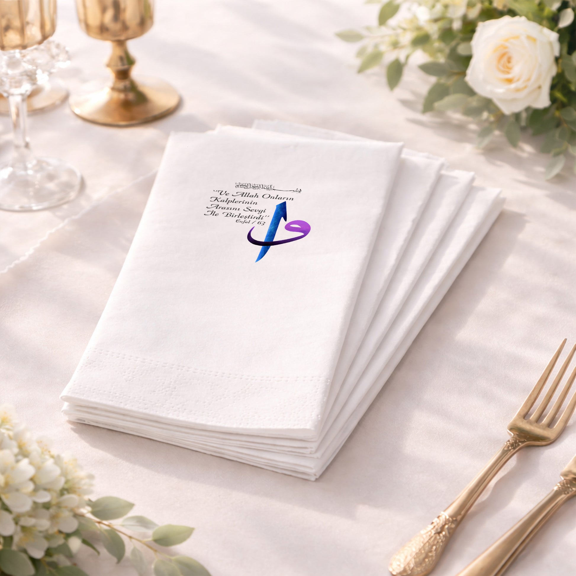 Tasarım, peçetenin ön yüzünde tam merkezde olacak şekilde yüksek çözünürlüklü baskı ile uygulanır. Dilersen özel konumlandırma taleplerini de iletebilirsin.