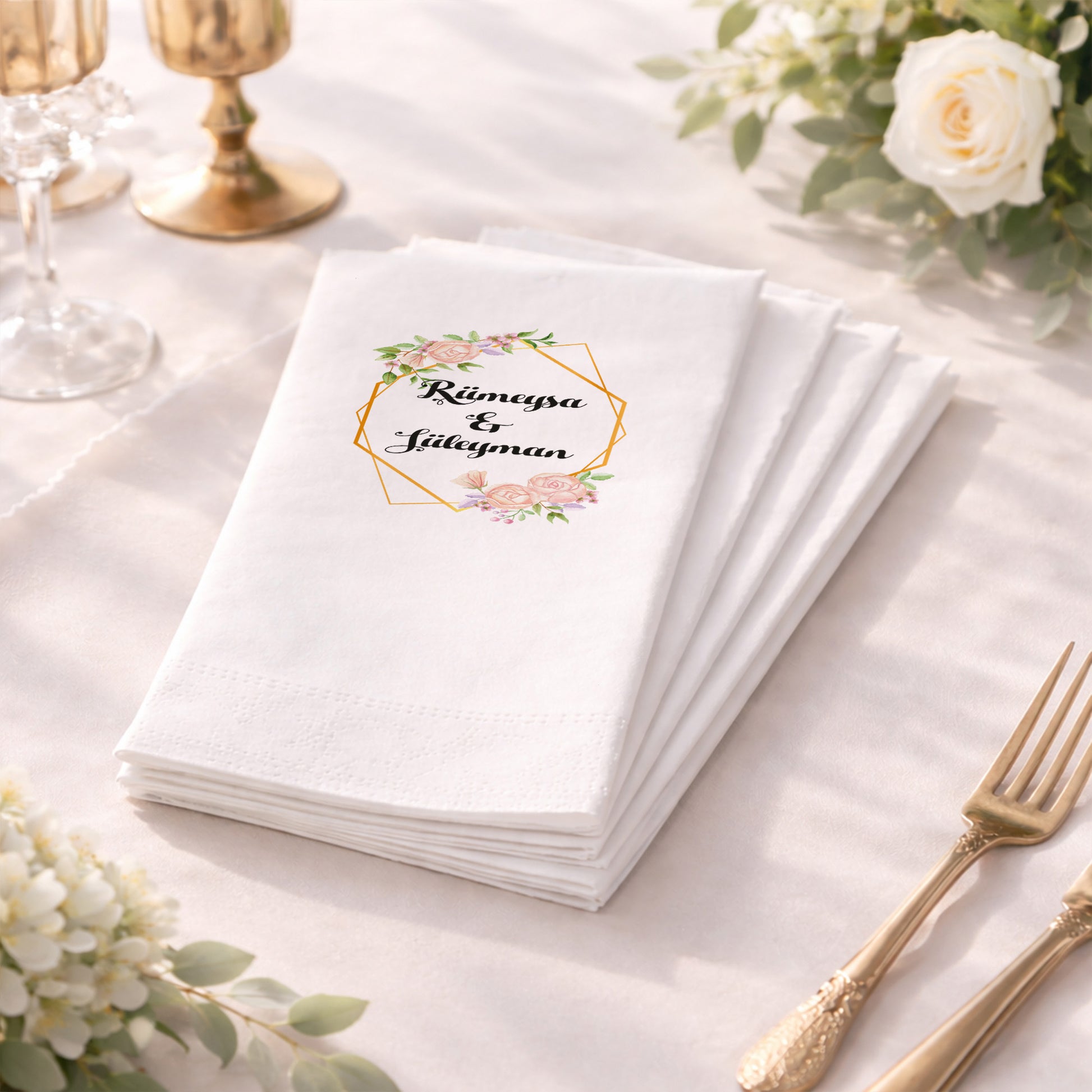 Rümeysa ve Süleyman çiftinin düğün sofralarına asalet katacak olan bu peçete, altın sarısı geometrik çerçeve ve pembe gül detaylarıyla tasarlanmıştır. Modern ve klasik unsurların harmanlandığı bu özel gün peçetesi, masalarınızda lüks bir görünüm sağlar. Zarif el yazısı fontuyla hazırlanan isimler, tasarımın odak noktasını oluşturur. Organizasyonlarınızda kullanabileceğiniz bu yüksek kaliteli baskılı peçete, hem hijyen sağlar hem de dekoratif bir obje işlevi görür. Üstün kağıt kalitesi sayesinde sıvıyı hızla emer ve yumuşak dokusuyla cilt dostudur. Kişiye özel hazırlanan bu şık detay, düğün konseptinizi tamamlayarak misafirlerinize görsel bir şölen sunar. Baskıların kalıcılığı ve renklerin canlılığı markamızın güvencesi altındadır. Hayatınızın en mutlu gününde her detayın kusursuz olmasını istiyorsanız, bu zarif ve modern peçete tasarımı sofralarınız için en doğru tercih olacaktır.
