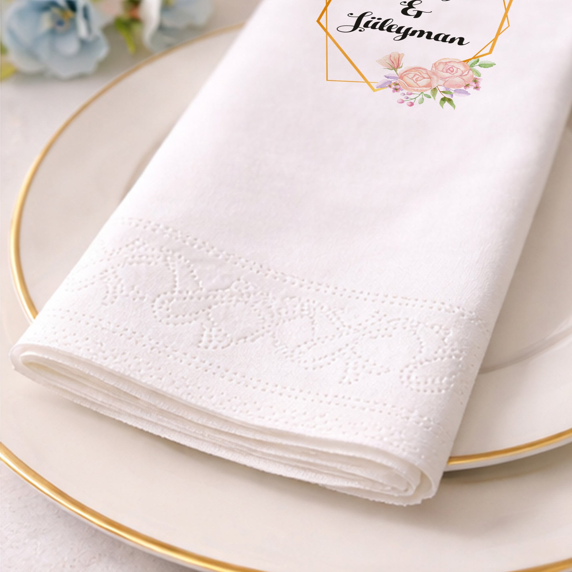 Tasarım, peçetenin ön yüzünde tam merkezde olacak şekilde yüksek çözünürlüklü baskı ile uygulanır. Dilersen özel konumlandırma taleplerini de iletebilirsin.