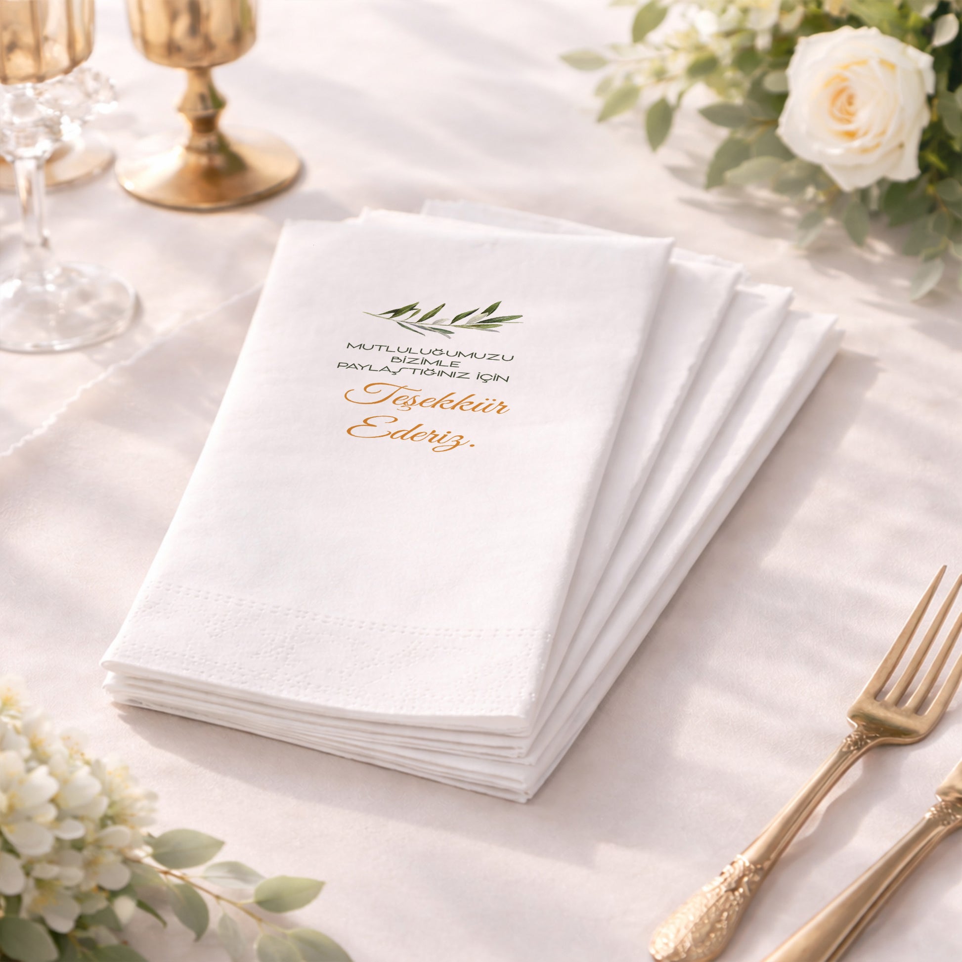 Davetlerinizde misafirlerinize minnettarlığınızı sunmanın en zarif yolu, onlara özel olarak hazırlanmış bu teşekkür peçeteleridir. Siyahın derinliği üzerine işlenen canlı zeytin dalları, ölümsüzlüğü ve huzuru simgelerken, altın sarısı el yazısı detayı sofranızın zarafetini artırır. Organizasyon peçetesi dünyasında fark yaratan bu siyah seri, modern ve klasik dekorasyonu bir araya getiren benzersiz bir yapıya sahiptir. Düğün peçetesi veya nişan törenleriniz için tercih edebileceğiniz bu ürün, kaliteli baskısı sayesinde metinlerin ve desenlerin net bir şekilde okunmasını sağlar. Masalarınızda dramatik ve etkileyici bir atmosfer yaratmak istiyorsanız, bu baskılı peçete tam size göre. Yumuşak, katlanabilir ve dayanıklı dokusuyla misafirlerinize hem konforlu hem de estetik bir deneyim sunar. Kişiye özel baskılı peçete seçeneklerimizle, kutlamalarınızın her anında kalitenizi ve özeninizi tüm detaylarla yansıtın.