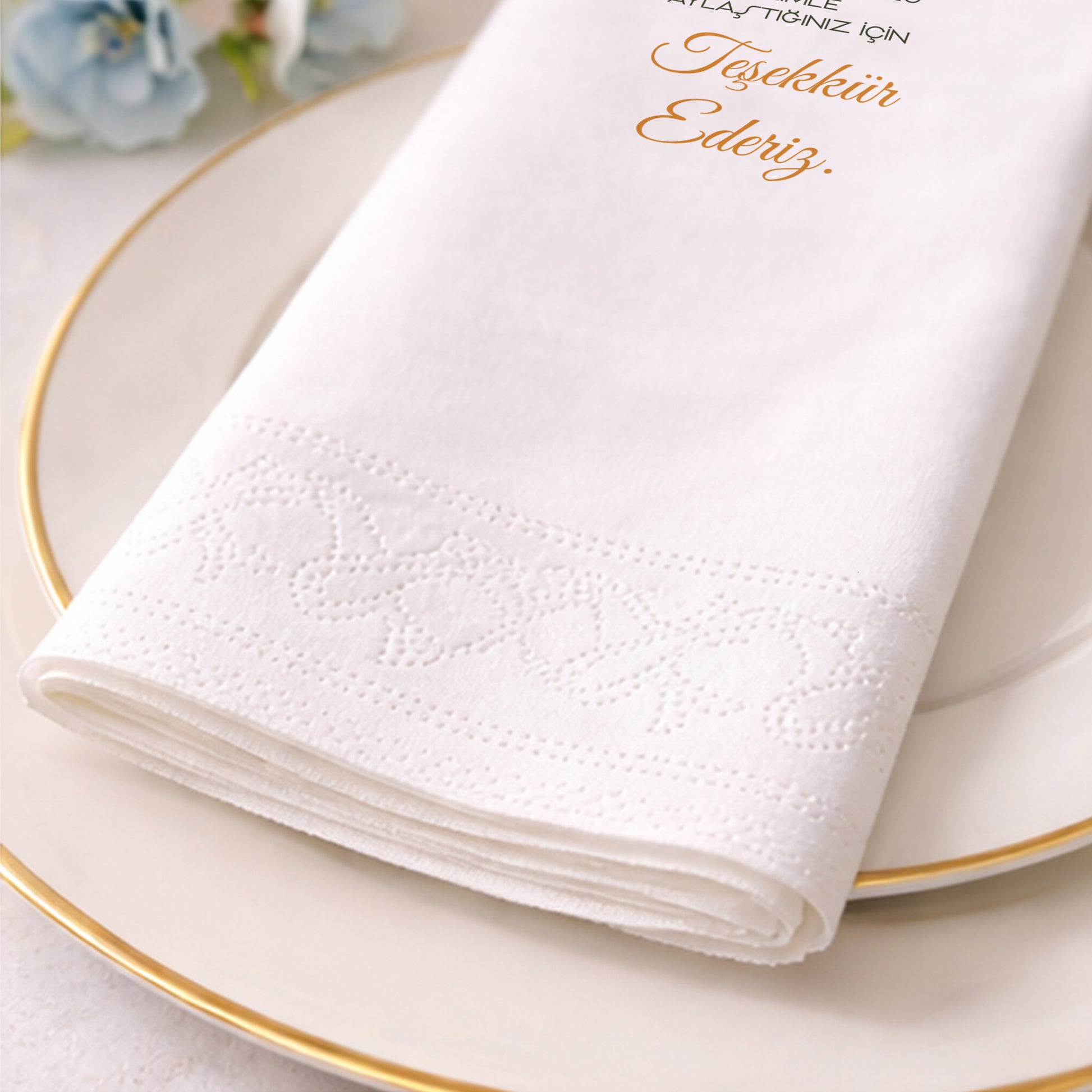Tasarım, peçetenin ön yüzünde tam merkezde olacak şekilde yüksek çözünürlüklü baskı ile uygulanır. Dilersen özel konumlandırma taleplerini de iletebilirsin.