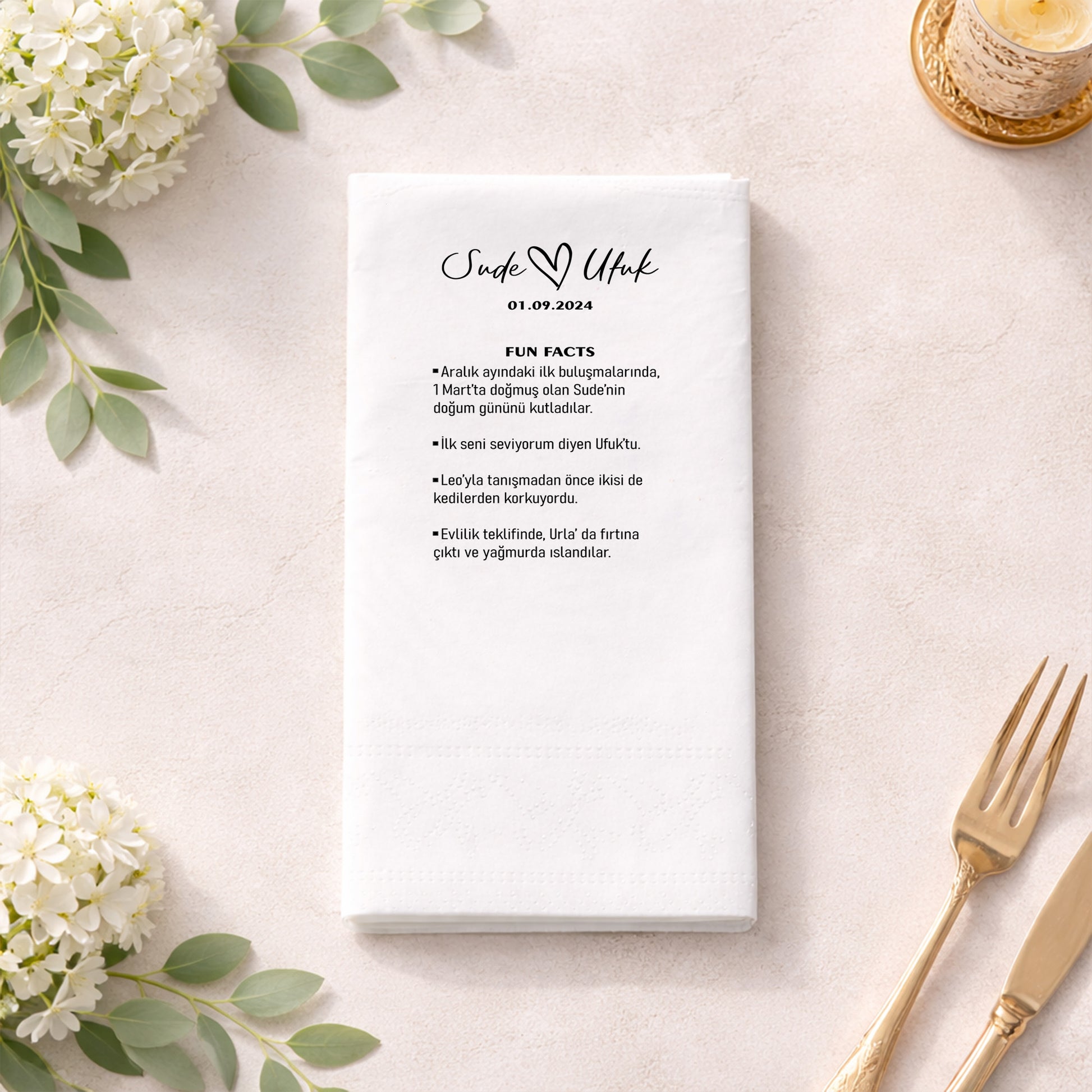 Sude ve Ufuk için hazırlanan fun facts temalı bu baskılı peçete, düğün ve nişan organizasyonlarına samimi ve modern bir karakter kazandırır. Çifte ait eğlenceli ve anlamlı detayların yer aldığı tasarım, davetlilerle özel anıları paylaşmanın zarif bir yolunu sunar. Sade tipografi ve net yerleşim sayesinde masa düzeninde şık ve düzenli bir görünüm elde edilir. Özel gün peçetesi olarak hem dekoratif hem de hatıra değeri taşıyan bir üründür. Organizasyon peçetesi arayan çiftler için kişiselleştirilebilir yapısı ile öne çıkar. Düğün peçetesi ve nişan peçetesi olarak kullanılabilir, konsept bütünlüğünü güçlendirir ve davetliler üzerinde kalıcı bir iz bırakır.