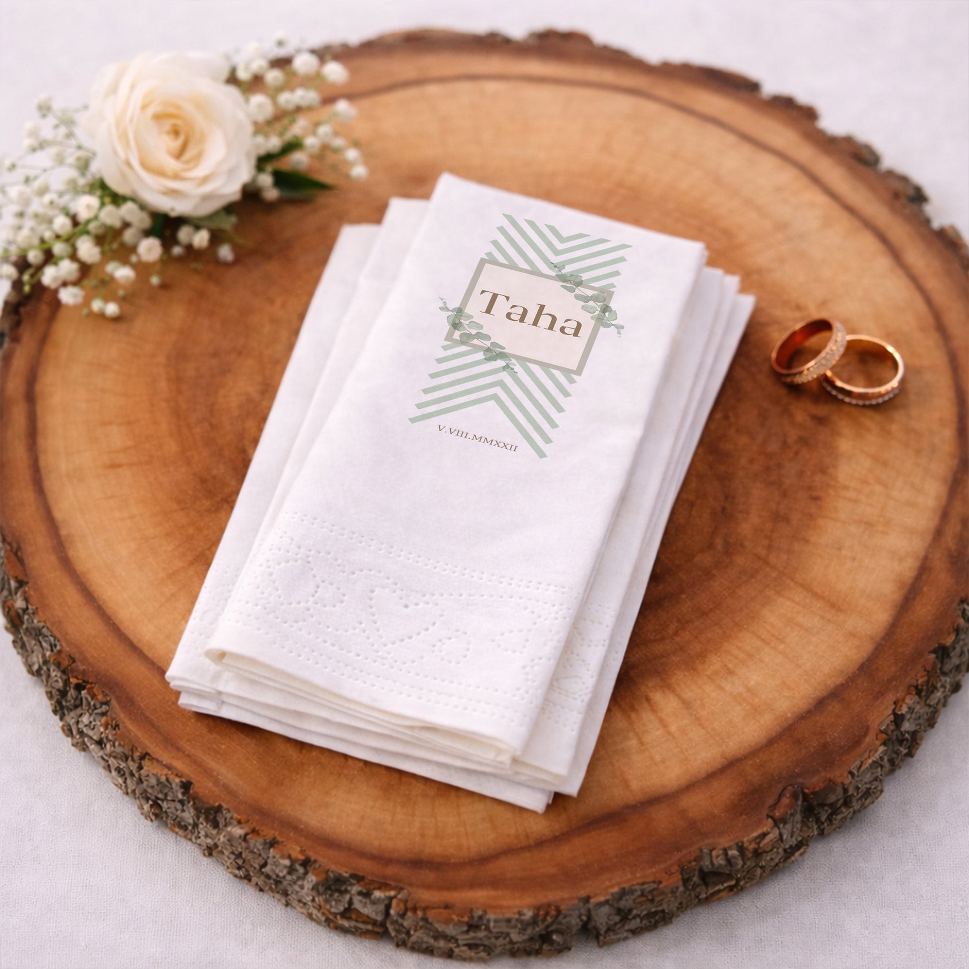 Taha İsme Özel Okaliptüs Desenli Minimalist Tasarım Baskılı Organizasyon Peçetesi