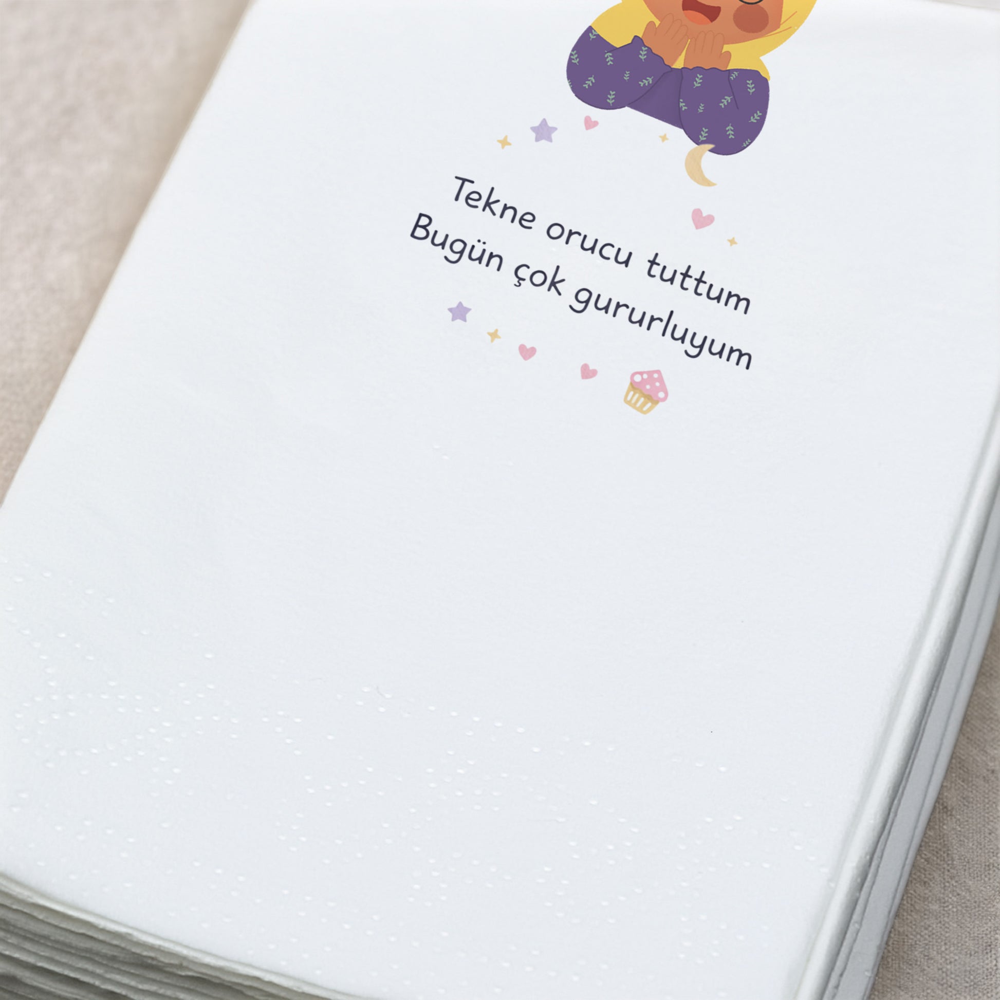 yazılı bu sevimli Ramazan peçetesi, çocukların Ramazan’a sevgiyle bağlanmasını sağlayan tatlı bir detaydır.