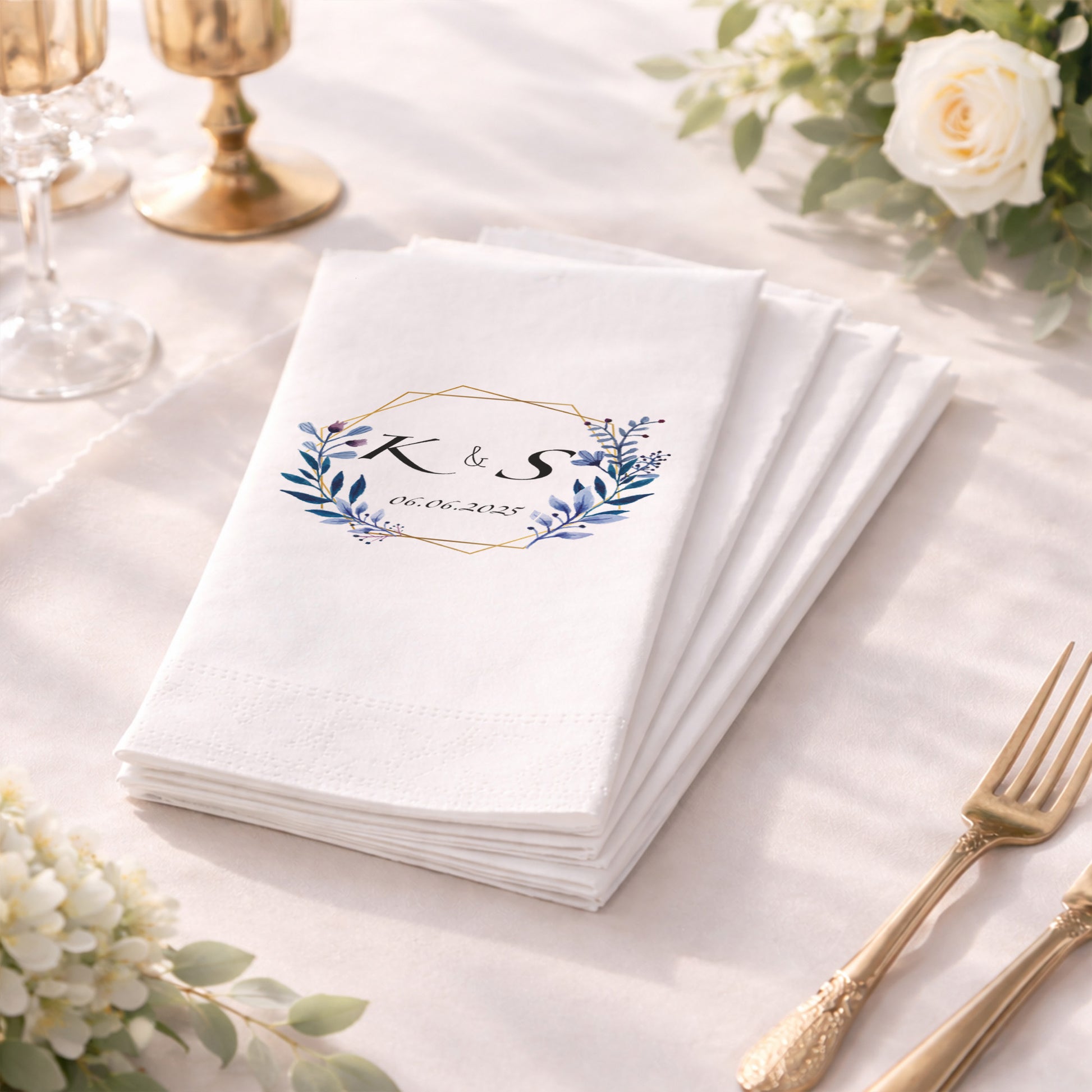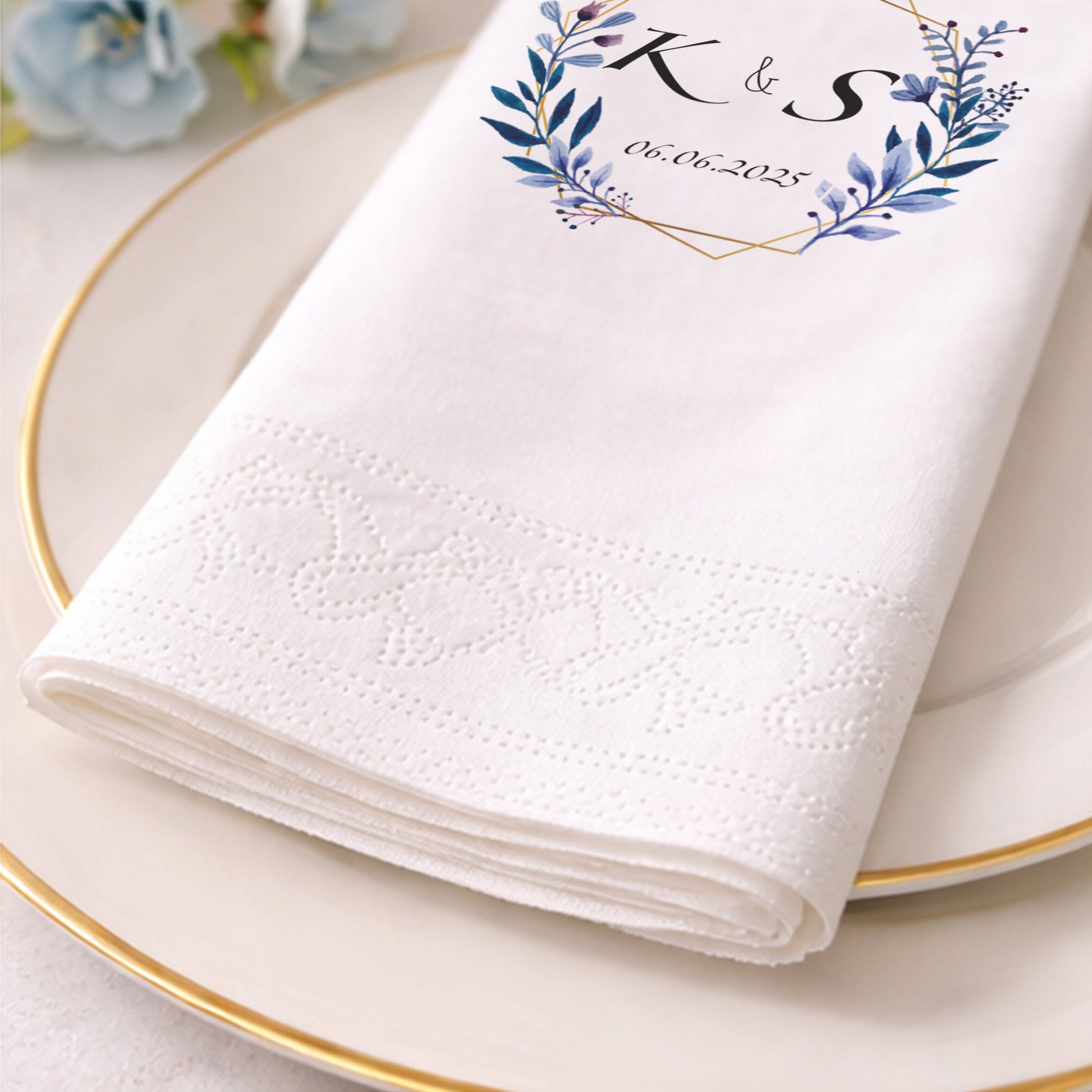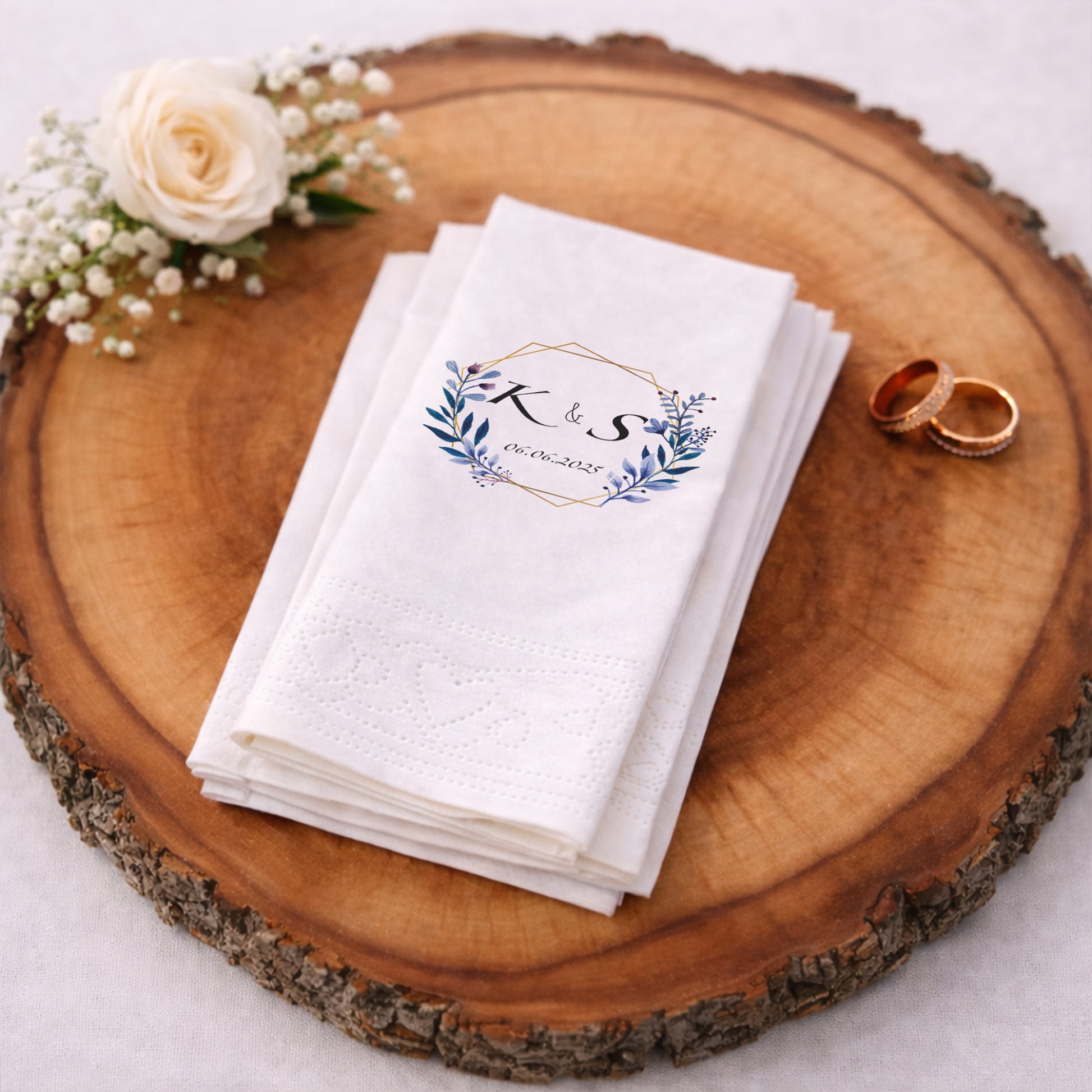 Geometrik altın çerçeve ve mavi tonlarda yaprak illüstrasyonlarıyla tasarlanan bu baskılı peçete, düğün ve nişan organizasyonlarında modern ve zarif bir sunum sağlar. İsim ve tarih bilgisiyle kişiselleştirilebilen tasarım, özel gün peçetesi olarak masalara bütünlük kazandırır. Organizasyon peçetesi kullanımında sade ama güçlü bir görsel etki sunar. Düğün peçetesi ve nişan peçetesi olarak farklı konseptlerle uyumludur. Baskılı peçete kalitesi sayesinde yazılar net, desenler dengelidir. Zamansız bir tasarım arayan çiftler için profesyonel, güven veren ve estetik bir tercih sunar.