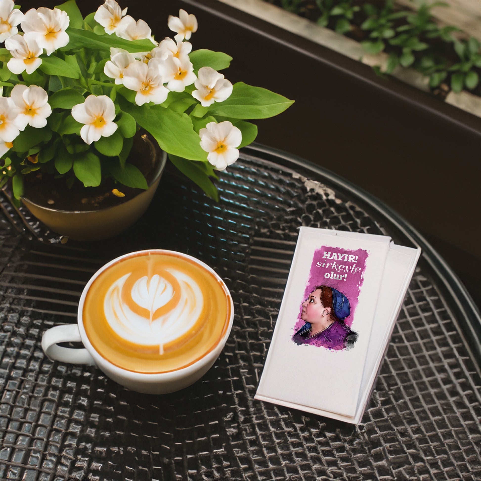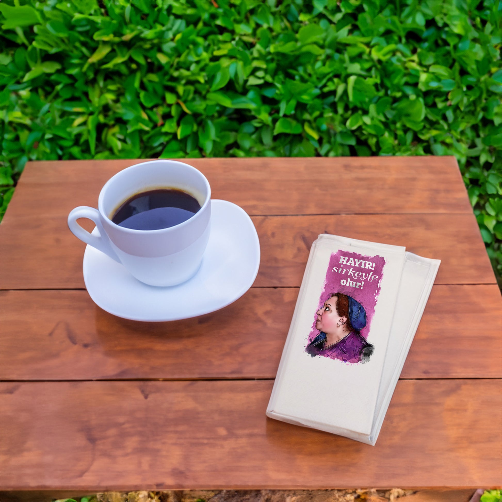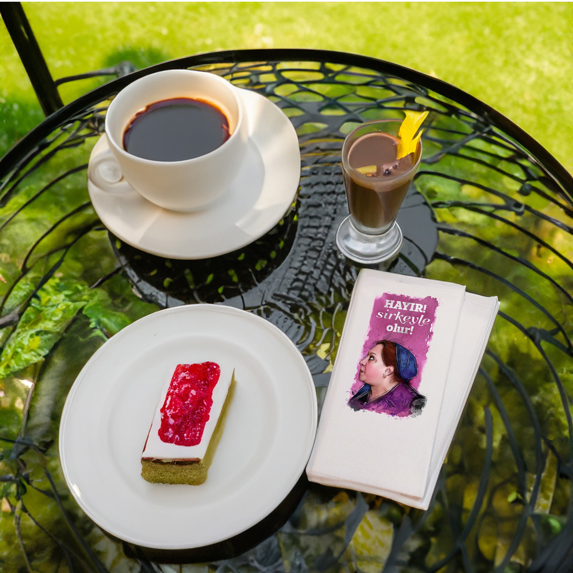 Tasarım, peçetenin ön yüzünde tam merkezde olacak şekilde yüksek çözünürlüklü baskı ile uygulanır. Dilersen özel konumlandırma taleplerini de iletebilirsin.