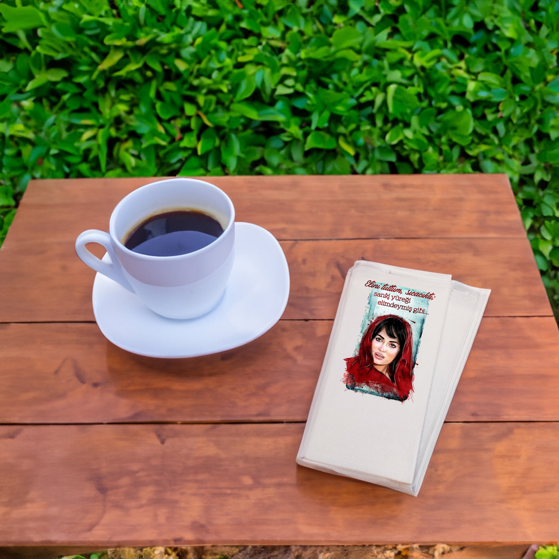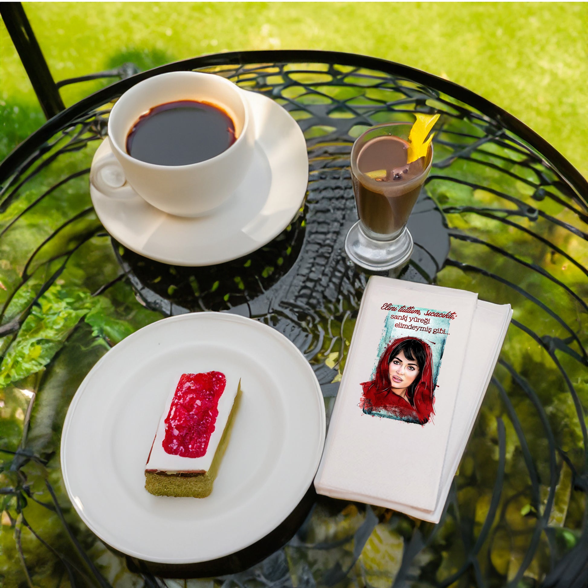 Tasarım, peçetenin ön yüzünde tam merkezde olacak şekilde yüksek çözünürlüklü baskı ile uygulanır. Dilersen özel konumlandırma taleplerini de iletebilirsin.