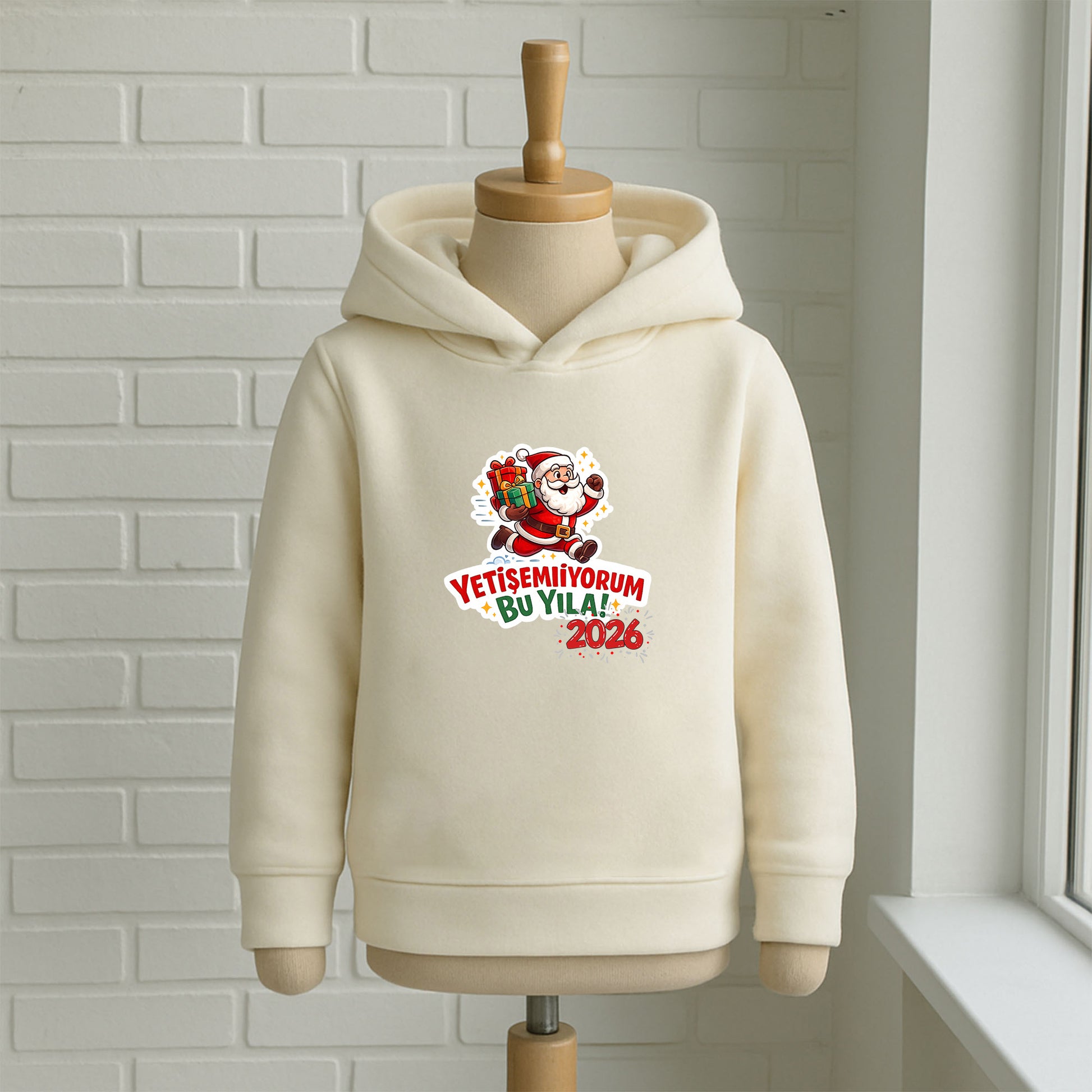 Çocuklar için özel olarak tasarlanan Yetişemiyorum Bu Yıla 2026 Noel Baba desenli sweatshirt; hediyelerle koşan sevimli Noel Baba illüstrasyonu ve eğlenceli mesajıyla yılbaşı ruhunu mizahi bir şekilde yansıtır. %80 pamuk ve %20 polyester kumaş karışımı sayesinde yumuşak, dayanıklı ve günlük kullanıma uygundur. İç kısmındaki şardonlu (polar dokulu) yapı, kış aylarında sıcak tutarken terleme yapmaz.