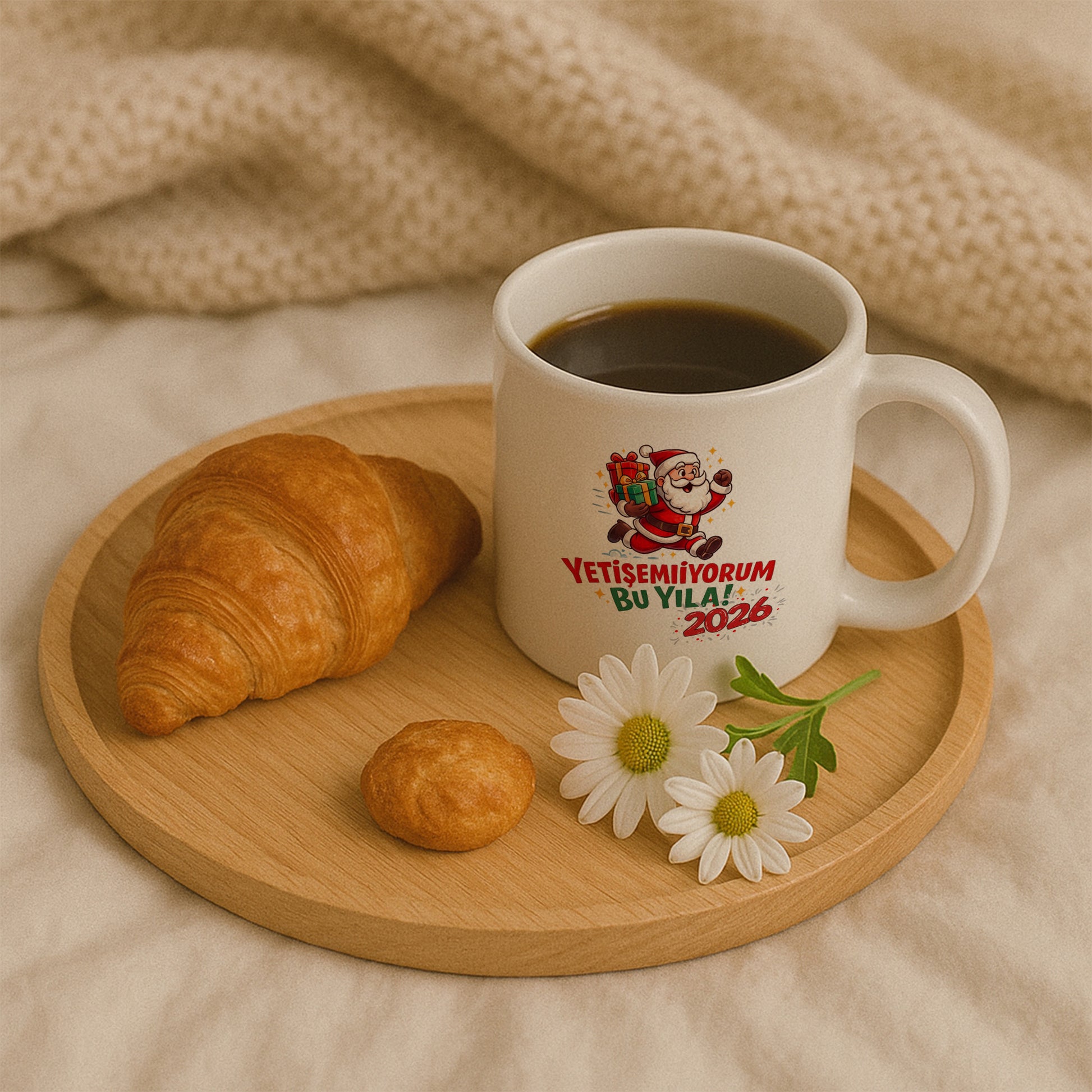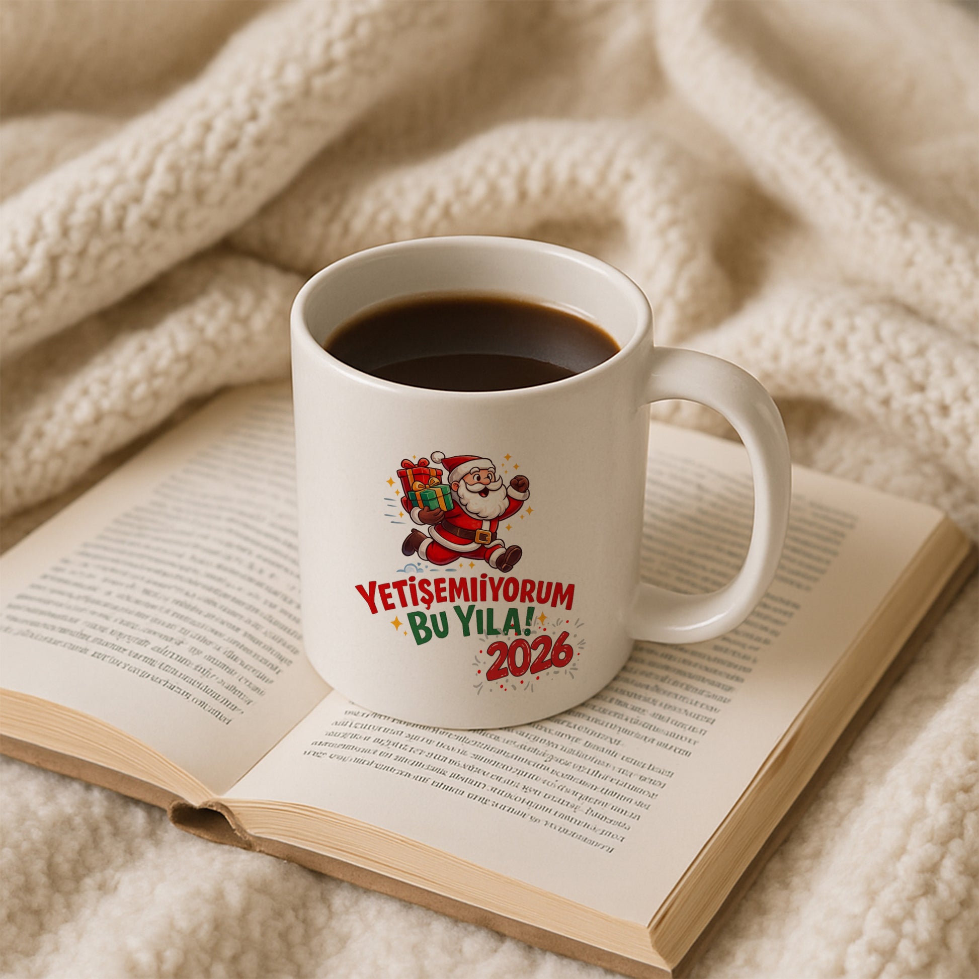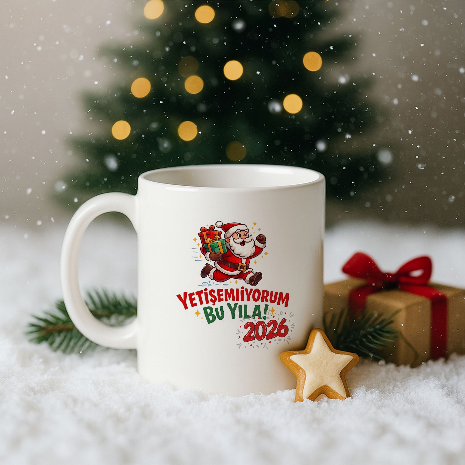 “Yetişemiyorum bu yıla!” mesajı, yıl sonu koşturmacasını mizahi bir şekilde yansıtan sıcak ve samimi bir tasarım sunar. Koşan Noel Baba ve hediye detayları, yeni yıl heyecanını eğlenceli bir dille kupaya taşır.