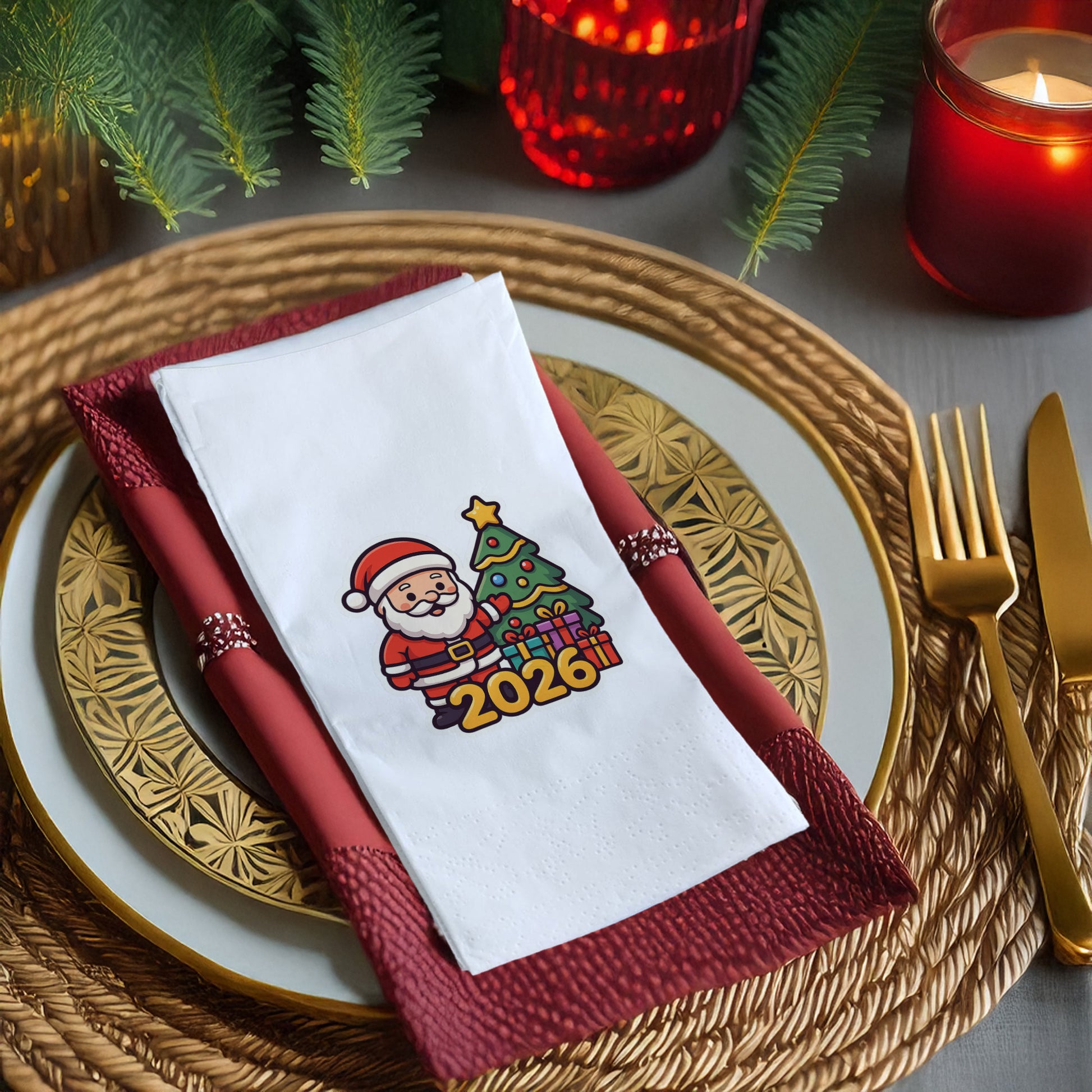 Bu Yılbaşı Desenli Baskılı Peçete, üzerinde sevimli Noel Baba, renkli süslemelerle bezeli çam ağacı, hediyeler ve büyük 2026 yazısıyla yılbaşı ruhunu sofranıza taşıyor.