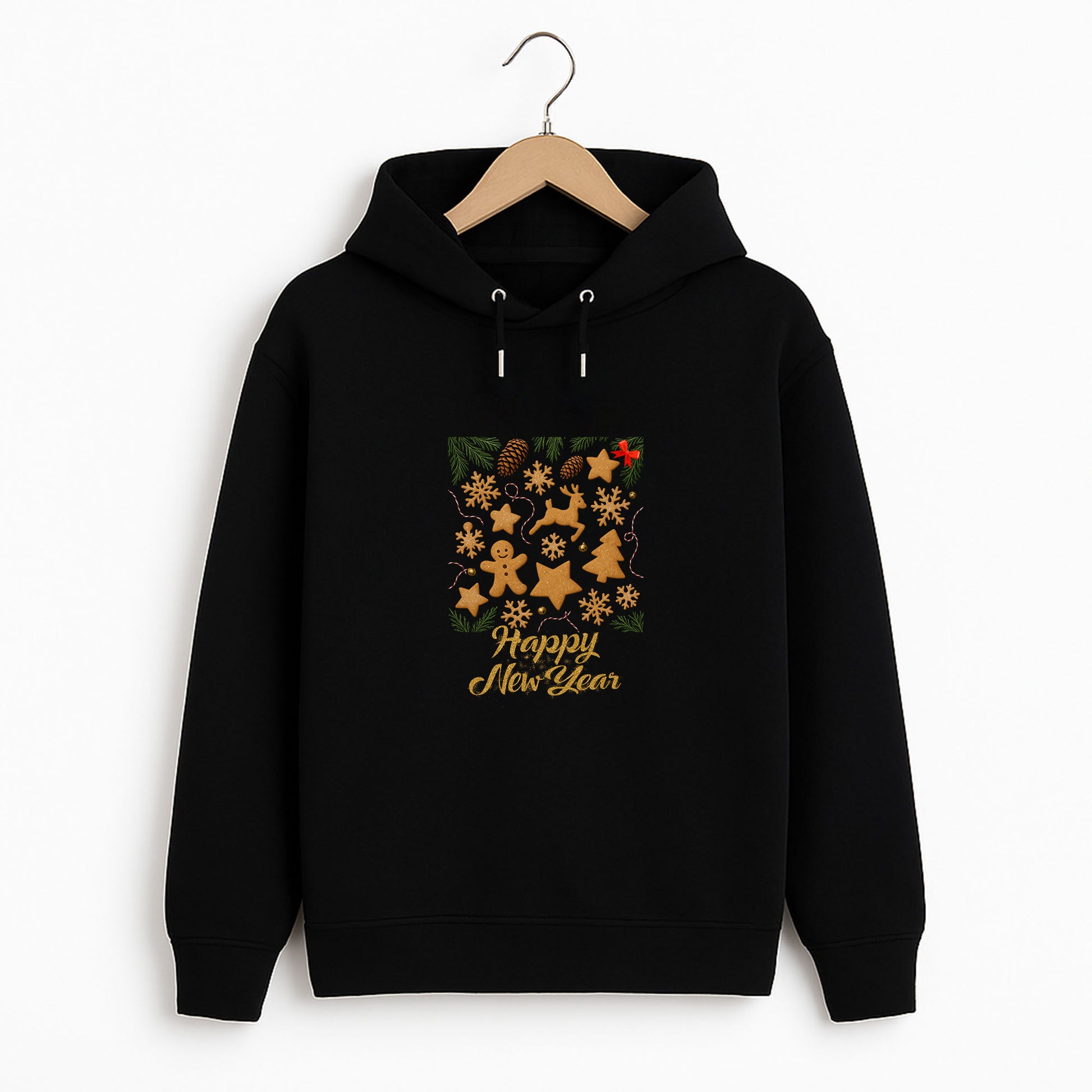 Zencefilli kurabiye figürleri ve altın efektli Happy New Year yazılı yılbaşı temalı sweatshirt.