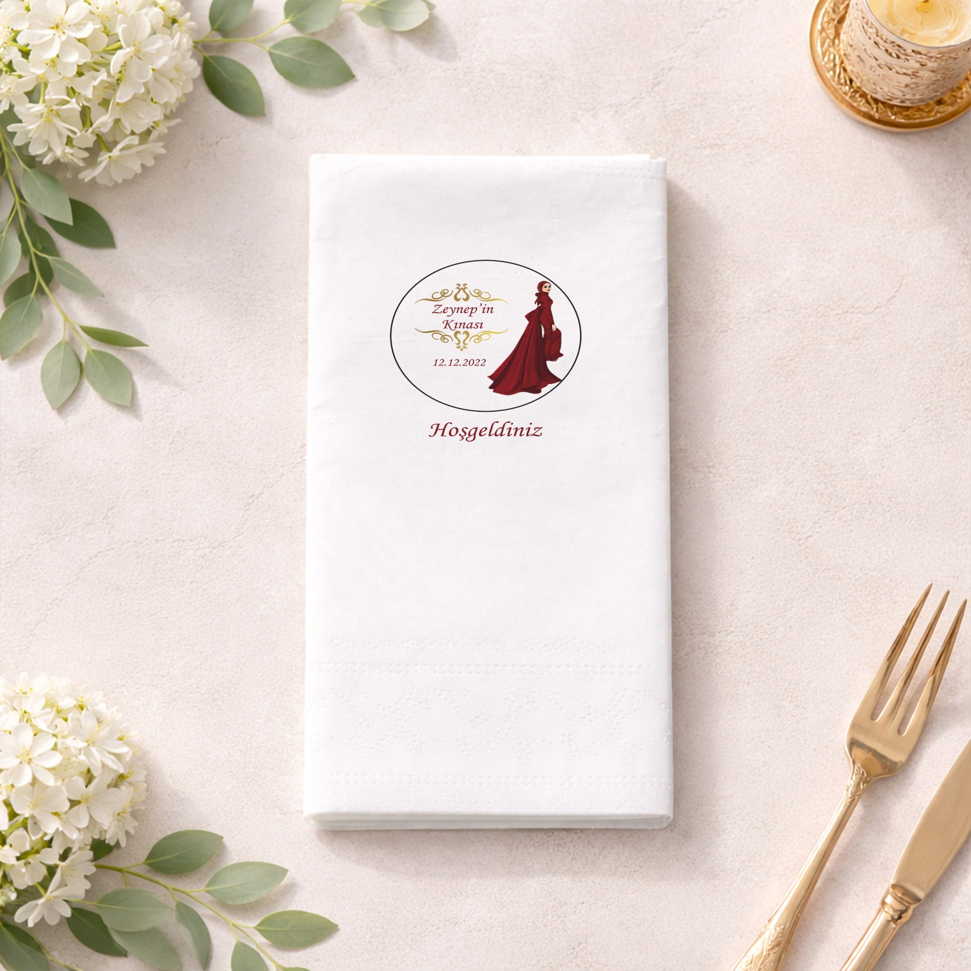 Zeynep’in kına gecesine özel tasarlanan bu peçete, asil tesettürlü gelin illüstrasyonu ve altın rengi süslemeleriyle büyüleyici bir görünüme sahiptir. Siyah zemin üzerine uygulanan yüksek çözünürlüklü baskı, gecenize mistik ve şık bir atmosfer katar. Kırmızı kına elbisesinin zarafeti, sofralarınızdaki sunum kalitesini en üst seviyeye taşır. Organizasyon peçetesi olarak tasarlanan bu ürün, misafirlerinizin ilgisini çekecek estetik bir detaydır. Kaliteli dokusu sayesinde hem pratik bir kullanım sunar hem de masalarınızda dekoratif bir obje işlevi görür. Kına gecenizin temasını güçlendiren bu özel baskılı ürün, kişiselleştirilmiş kutlamaların vazgeçilmezidir. Dayanıklı yapısı sayesinde ıslandığında dahi kolayca parçalanmaz. Zeynep’in bu mutlu gününe özel hazırlanan bu tasarım, butik organizasyon anlayışımızı yansıtmaktadır. Siz de kendi isminizle bu zarafeti taçlandırabilir, özel gününüzü benzersiz kılabilirsiniz.