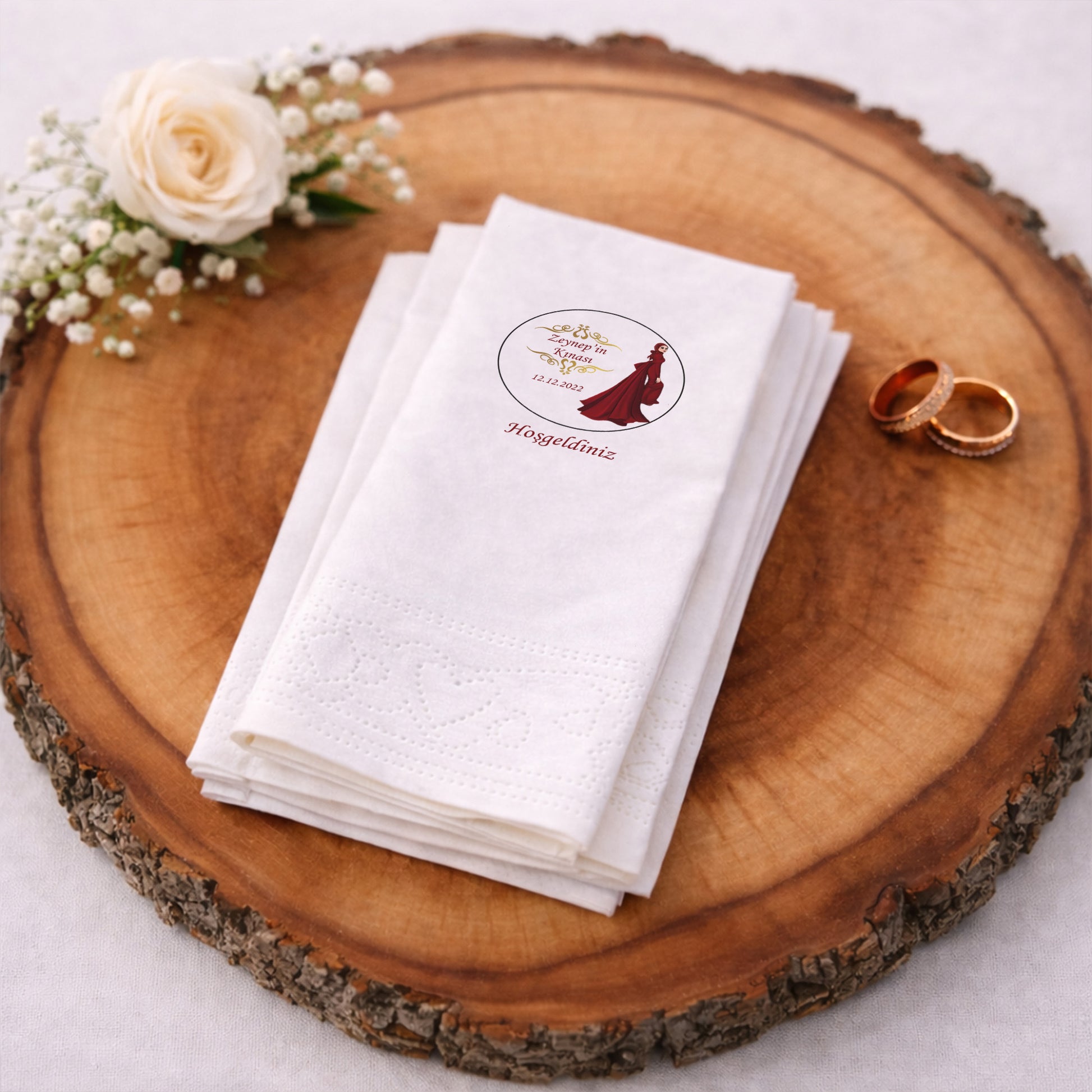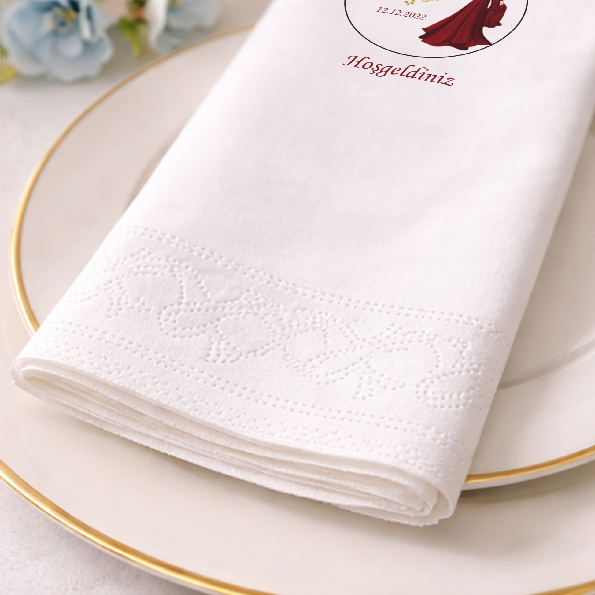 Tasarım, peçetenin ön yüzünde tam merkezde olacak şekilde yüksek çözünürlüklü baskı ile uygulanır. Dilersen özel konumlandırma taleplerini de iletebilirsin.